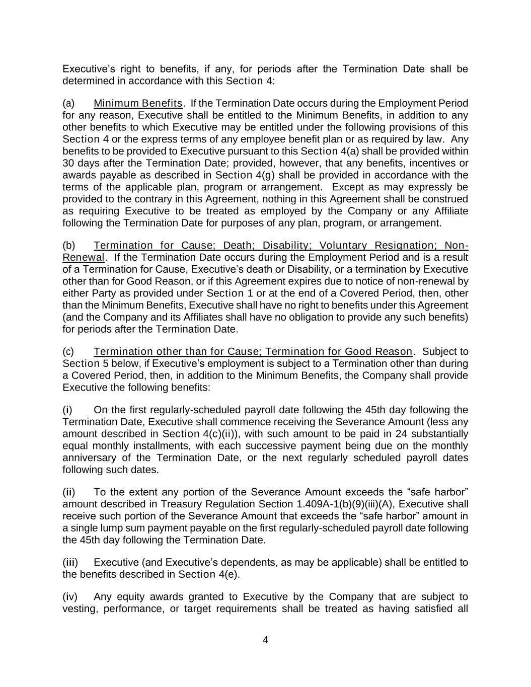 4 Executive’s right to benefits, if any, for periods after the Termination Date shall be determined in accordance with this Section 4: (a) Minimum Benefits. If the Termination Date occurs during the Employment Period for any reason, Executive shall be entitled to the Minimum Benefits, in addition to any other benefits to which Executive may be entitled under the following provisions of this Section 4 or the express terms of any employee benefit plan or as required by law. Any benefits to be provided to Executive pursuant to this Section 4(a) shall be provided within 30 days after the Termination Date; provided, however, that any benefits, incentives or awards payable as described in Section 4(g) shall be provided in accordance with the terms of the applicable plan, program or arrangement. Except as may expressly be provided to the contrary in this Agreement, nothing in this Agreement shall be construed as requiring Executive to be treated as employed by the Company or any Affiliate following the Termination Date for purposes of any plan, program, or arrangement. (b) Termination for Cause; Death; Disability; Voluntary Resignation; Non- Renewal. If the Termination Date occurs during the Employment Period and is a result of a Termination for Cause, Executive’s death or Disability, or a termination by Executive other than for Good Reason, or if this Agreement expires due to notice of non-renewal by either Party as provided under Section 1 or at the end of a Covered Period, then, other than the Minimum Benefits, Executive shall have no right to benefits under this Agreement (and the Company and its Affiliates shall have no obligation to provide any such benefits) for periods after the Termination Date. (c) Termination other than for Cause; Termination for Good Reason. Subject to Section 5 below, if Executive’s employment is subject to a Termination other than during a Covered Period, then, in addition to the Minimum Benefits, the Company shall provide Executive the following benefits: (i) On the first regularly-scheduled payroll date following the 45th day following the Termination Date, Executive shall commence receiving the Severance Amount (less any amount described in Section 4(c)(ii)), with such amount to be paid in 24 substantially equal monthly installments, with each successive payment being due on the monthly anniversary of the Termination Date, or the next regularly scheduled payroll dates following such dates. (ii) To the extent any portion of the Severance Amount exceeds the “safe harbor” amount described in Treasury Regulation Section 1.409A-1(b)(9)(iii)(A), Executive shall receive such portion of the Severance Amount that exceeds the “safe harbor” amount in a single lump sum payment payable on the first regularly-scheduled payroll date following the 45th day following the Termination Date. (iii) Executive (and Executive’s dependents, as may be applicable) shall be entitled to the benefits described in Section 4(e). (iv) Any equity awards granted to Executive by the Company that are subject to vesting, performance, or target requirements shall be treated as having satisfied all