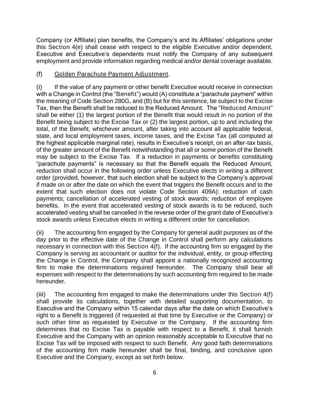 6 Company (or Affiliate) plan benefits, the Company’s and its Affiliates’ obligations under this Section 4(e) shall cease with respect to the eligible Executive and/or dependent. Executive and Executive’s dependents must notify the Company of any subsequent employment and provide information regarding medical and/or dental coverage available. (f) Golden Parachute Payment Adjustment. (i) If the value of any payment or other benefit Executive would receive in connection with a Change in Control (the “Benefit”) would (A) constitute a “parachute payment” within the meaning of Code Section 280G, and (B) but for this sentence, be subject to the Excise Tax, then the Benefit shall be reduced to the Reduced Amount. The “Reduced Amount” shall be either (1) the largest portion of the Benefit that would result in no portion of the Benefit being subject to the Excise Tax or (2) the largest portion, up to and including the total, of the Benefit, whichever amount, after taking into account all applicable federal, state, and local employment taxes, income taxes, and the Excise Tax (all computed at the highest applicable marginal rate), results in Executive’s receipt, on an after-tax basis, of the greater amount of the Benefit notwithstanding that all or some portion of the Benefit may be subject to the Excise Tax. If a reduction in payments or benefits constituting “parachute payments” is necessary so that the Benefit equals the Reduced Amount, reduction shall occur in the following order unless Executive elects in writing a different order (provided, however, that such election shall be subject to the Company’s approval if made on or after the date on which the event that triggers the Benefit occurs and to the extent that such election does not violate Code Section 409A): reduction of cash payments; cancellation of accelerated vesting of stock awards; reduction of employee benefits. In the event that accelerated vesting of stock awards is to be reduced, such accelerated vesting shall be cancelled in the reverse order of the grant date of Executive’s stock awards unless Executive elects in writing a different order for cancellation. (ii) The accounting firm engaged by the Company for general audit purposes as of the day prior to the effective date of the Change in Control shall perform any calculations necessary in connection with this Section 4(f). If the accounting firm so engaged by the Company is serving as accountant or auditor for the individual, entity, or group effecting the Change in Control, the Company shall appoint a nationally recognized accounting firm to make the determinations required hereunder. The Company shall bear all expenses with respect to the determinations by such accounting firm required to be made hereunder. (iii) The accounting firm engaged to make the determinations under this Section 4(f) shall provide its calculations, together with detailed supporting documentation, to Executive and the Company within 15 calendar days after the date on which Executive’s right to a Benefit is triggered (if requested at that time by Executive or the Company) or such other time as requested by Executive or the Company. If the accounting firm determines that no Excise Tax is payable with respect to a Benefit, it shall furnish Executive and the Company with an opinion reasonably acceptable to Executive that no Excise Tax will be imposed with respect to such Benefit. Any good faith determinations of the accounting firm made hereunder shall be final, binding, and conclusive upon Executive and the Company, except as set forth below.