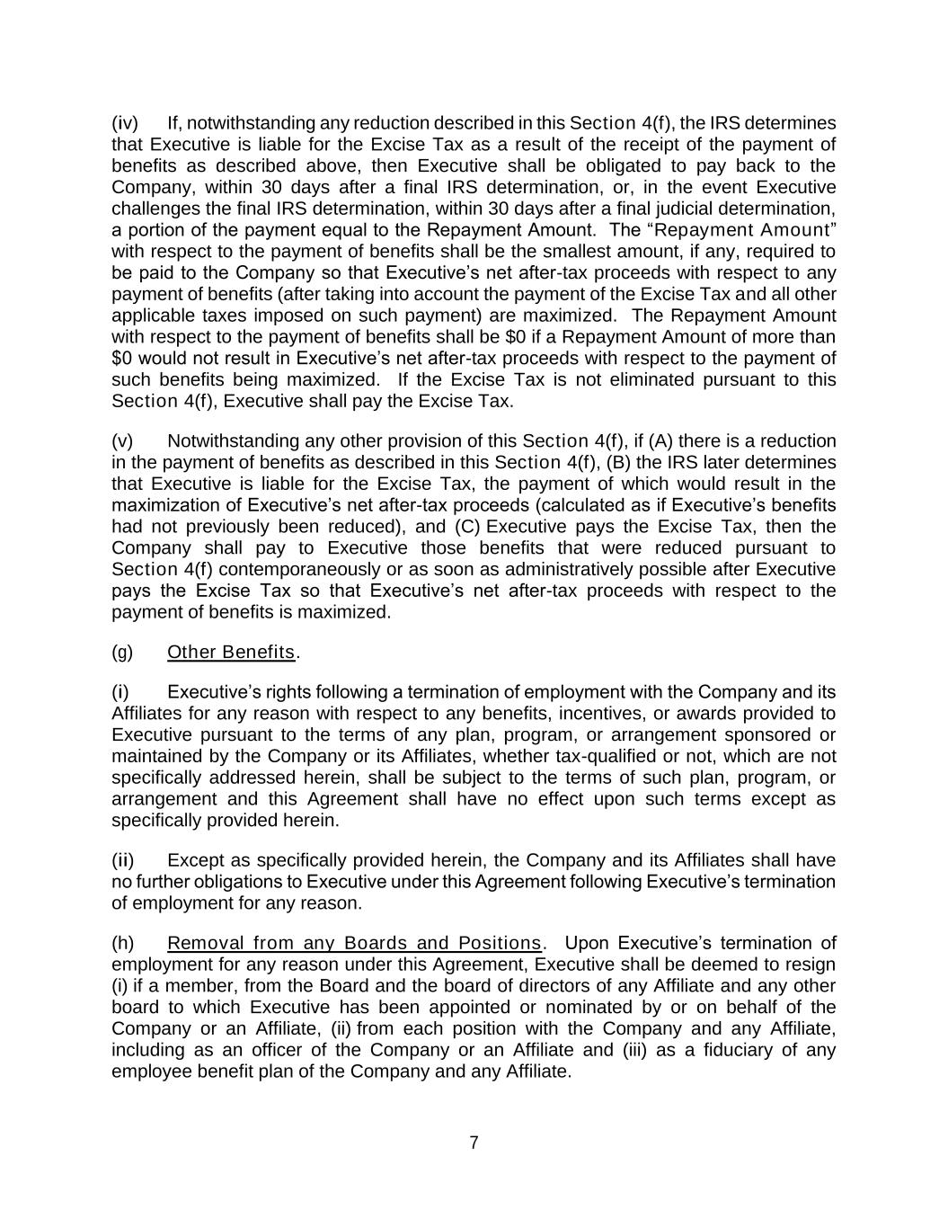 7 (iv) If, notwithstanding any reduction described in this Section 4(f), the IRS determines that Executive is liable for the Excise Tax as a result of the receipt of the payment of benefits as described above, then Executive shall be obligated to pay back to the Company, within 30 days after a final IRS determination, or, in the event Executive challenges the final IRS determination, within 30 days after a final judicial determination, a portion of the payment equal to the Repayment Amount. The “Repayment Amount” with respect to the payment of benefits shall be the smallest amount, if any, required to be paid to the Company so that Executive’s net after-tax proceeds with respect to any payment of benefits (after taking into account the payment of the Excise Tax and all other applicable taxes imposed on such payment) are maximized. The Repayment Amount with respect to the payment of benefits shall be $0 if a Repayment Amount of more than $0 would not result in Executive’s net after-tax proceeds with respect to the payment of such benefits being maximized. If the Excise Tax is not eliminated pursuant to this Section 4(f), Executive shall pay the Excise Tax. (v) Notwithstanding any other provision of this Section 4(f), if (A) there is a reduction in the payment of benefits as described in this Section 4(f), (B) the IRS later determines that Executive is liable for the Excise Tax, the payment of which would result in the maximization of Executive’s net after-tax proceeds (calculated as if Executive’s benefits had not previously been reduced), and (C) Executive pays the Excise Tax, then the Company shall pay to Executive those benefits that were reduced pursuant to Section 4(f) contemporaneously or as soon as administratively possible after Executive pays the Excise Tax so that Executive’s net after-tax proceeds with respect to the payment of benefits is maximized. (g) Other Benefits. (i) Executive’s rights following a termination of employment with the Company and its Affiliates for any reason with respect to any benefits, incentives, or awards provided to Executive pursuant to the terms of any plan, program, or arrangement sponsored or maintained by the Company or its Affiliates, whether tax-qualified or not, which are not specifically addressed herein, shall be subject to the terms of such plan, program, or arrangement and this Agreement shall have no effect upon such terms except as specifically provided herein. (ii) Except as specifically provided herein, the Company and its Affiliates shall have no further obligations to Executive under this Agreement following Executive’s termination of employment for any reason. (h) Removal from any Boards and Positions. Upon Executive’s termination of employment for any reason under this Agreement, Executive shall be deemed to resign (i) if a member, from the Board and the board of directors of any Affiliate and any other board to which Executive has been appointed or nominated by or on behalf of the Company or an Affiliate, (ii) from each position with the Company and any Affiliate, including as an officer of the Company or an Affiliate and (iii) as a fiduciary of any employee benefit plan of the Company and any Affiliate.