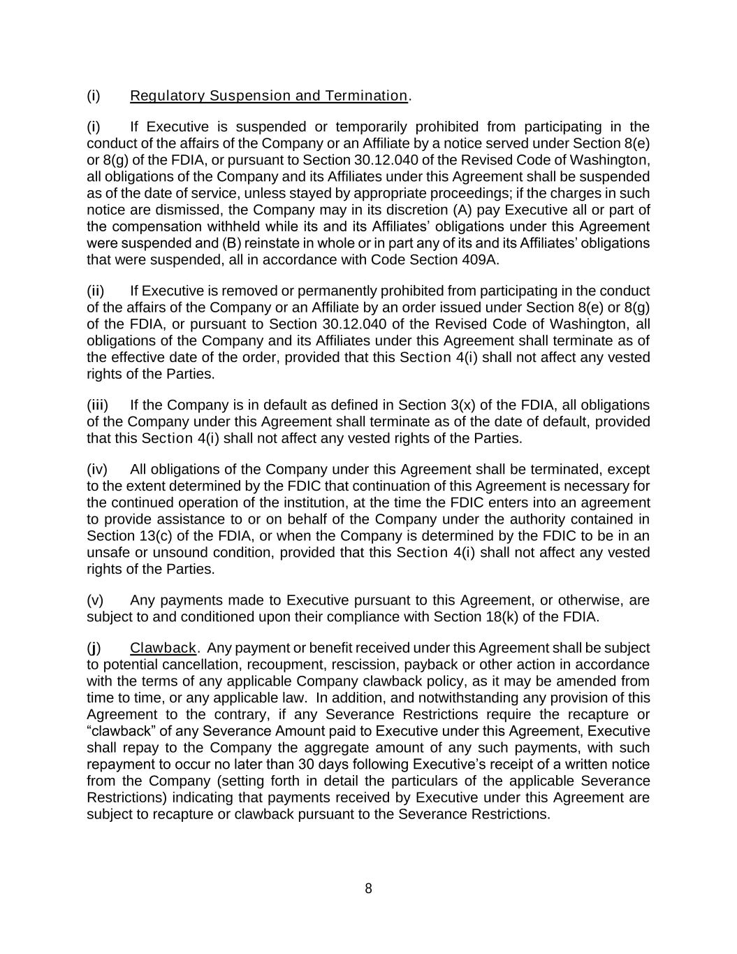 8 (i) Regulatory Suspension and Termination. (i) If Executive is suspended or temporarily prohibited from participating in the conduct of the affairs of the Company or an Affiliate by a notice served under Section 8(e) or 8(g) of the FDIA, or pursuant to Section 30.12.040 of the Revised Code of Washington, all obligations of the Company and its Affiliates under this Agreement shall be suspended as of the date of service, unless stayed by appropriate proceedings; if the charges in such notice are dismissed, the Company may in its discretion (A) pay Executive all or part of the compensation withheld while its and its Affiliates’ obligations under this Agreement were suspended and (B) reinstate in whole or in part any of its and its Affiliates’ obligations that were suspended, all in accordance with Code Section 409A. (ii) If Executive is removed or permanently prohibited from participating in the conduct of the affairs of the Company or an Affiliate by an order issued under Section 8(e) or 8(g) of the FDIA, or pursuant to Section 30.12.040 of the Revised Code of Washington, all obligations of the Company and its Affiliates under this Agreement shall terminate as of the effective date of the order, provided that this Section 4(i) shall not affect any vested rights of the Parties. (iii) If the Company is in default as defined in Section 3(x) of the FDIA, all obligations of the Company under this Agreement shall terminate as of the date of default, provided that this Section 4(i) shall not affect any vested rights of the Parties. (iv) All obligations of the Company under this Agreement shall be terminated, except to the extent determined by the FDIC that continuation of this Agreement is necessary for the continued operation of the institution, at the time the FDIC enters into an agreement to provide assistance to or on behalf of the Company under the authority contained in Section 13(c) of the FDIA, or when the Company is determined by the FDIC to be in an unsafe or unsound condition, provided that this Section 4(i) shall not affect any vested rights of the Parties. (v) Any payments made to Executive pursuant to this Agreement, or otherwise, are subject to and conditioned upon their compliance with Section 18(k) of the FDIA. (j) Clawback. Any payment or benefit received under this Agreement shall be subject to potential cancellation, recoupment, rescission, payback or other action in accordance with the terms of any applicable Company clawback policy, as it may be amended from time to time, or any applicable law. In addition, and notwithstanding any provision of this Agreement to the contrary, if any Severance Restrictions require the recapture or “clawback” of any Severance Amount paid to Executive under this Agreement, Executive shall repay to the Company the aggregate amount of any such payments, with such repayment to occur no later than 30 days following Executive’s receipt of a written notice from the Company (setting forth in detail the particulars of the applicable Severance Restrictions) indicating that payments received by Executive under this Agreement are subject to recapture or clawback pursuant to the Severance Restrictions.