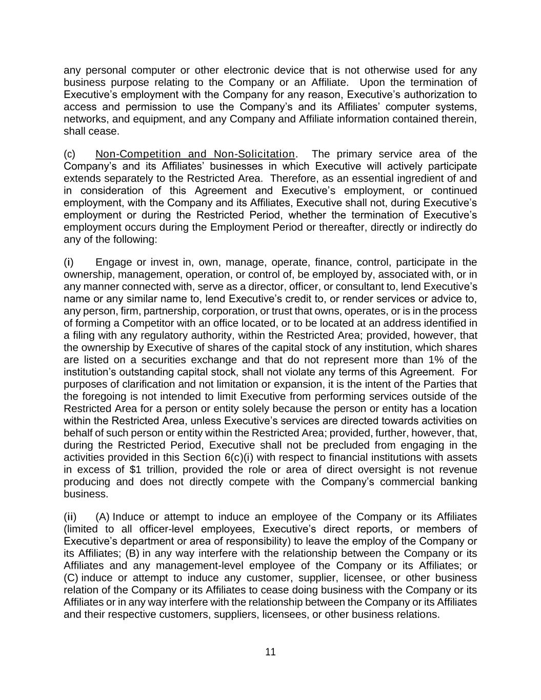 11 any personal computer or other electronic device that is not otherwise used for any business purpose relating to the Company or an Affiliate. Upon the termination of Executive’s employment with the Company for any reason, Executive’s authorization to access and permission to use the Company’s and its Affiliates’ computer systems, networks, and equipment, and any Company and Affiliate information contained therein, shall cease. (c) Non-Competition and Non-Solicitation. The primary service area of the Company’s and its Affiliates’ businesses in which Executive will actively participate extends separately to the Restricted Area. Therefore, as an essential ingredient of and in consideration of this Agreement and Executive’s employment, or continued employment, with the Company and its Affiliates, Executive shall not, during Executive’s employment or during the Restricted Period, whether the termination of Executive’s employment occurs during the Employment Period or thereafter, directly or indirectly do any of the following: (i) Engage or invest in, own, manage, operate, finance, control, participate in the ownership, management, operation, or control of, be employed by, associated with, or in any manner connected with, serve as a director, officer, or consultant to, lend Executive’s name or any similar name to, lend Executive’s credit to, or render services or advice to, any person, firm, partnership, corporation, or trust that owns, operates, or is in the process of forming a Competitor with an office located, or to be located at an address identified in a filing with any regulatory authority, within the Restricted Area; provided, however, that the ownership by Executive of shares of the capital stock of any institution, which shares are listed on a securities exchange and that do not represent more than 1% of the institution’s outstanding capital stock, shall not violate any terms of this Agreement. For purposes of clarification and not limitation or expansion, it is the intent of the Parties that the foregoing is not intended to limit Executive from performing services outside of the Restricted Area for a person or entity solely because the person or entity has a location within the Restricted Area, unless Executive’s services are directed towards activities on behalf of such person or entity within the Restricted Area; provided, further, however, that, during the Restricted Period, Executive shall not be precluded from engaging in the activities provided in this Section 6(c)(i) with respect to financial institutions with assets in excess of $1 trillion, provided the role or area of direct oversight is not revenue producing and does not directly compete with the Company’s commercial banking business. (ii) (A) Induce or attempt to induce an employee of the Company or its Affiliates (limited to all officer-level employees, Executive’s direct reports, or members of Executive’s department or area of responsibility) to leave the employ of the Company or its Affiliates; (B) in any way interfere with the relationship between the Company or its Affiliates and any management-level employee of the Company or its Affiliates; or (C) induce or attempt to induce any customer, supplier, licensee, or other business relation of the Company or its Affiliates to cease doing business with the Company or its Affiliates or in any way interfere with the relationship between the Company or its Affiliates and their respective customers, suppliers, licensees, or other business relations.