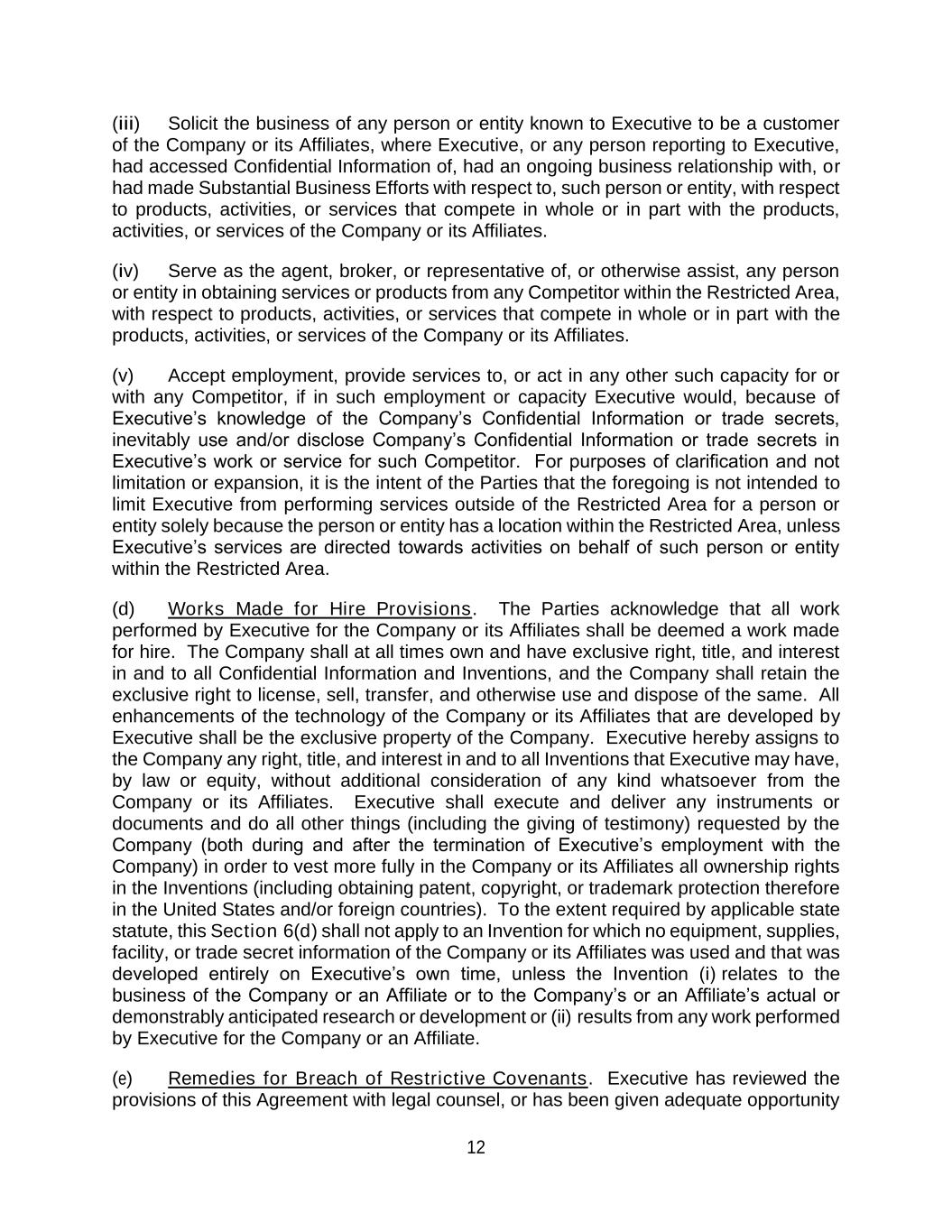 12 (iii) Solicit the business of any person or entity known to Executive to be a customer of the Company or its Affiliates, where Executive, or any person reporting to Executive, had accessed Confidential Information of, had an ongoing business relationship with, or had made Substantial Business Efforts with respect to, such person or entity, with respect to products, activities, or services that compete in whole or in part with the products, activities, or services of the Company or its Affiliates. (iv) Serve as the agent, broker, or representative of, or otherwise assist, any person or entity in obtaining services or products from any Competitor within the Restricted Area, with respect to products, activities, or services that compete in whole or in part with the products, activities, or services of the Company or its Affiliates. (v) Accept employment, provide services to, or act in any other such capacity for or with any Competitor, if in such employment or capacity Executive would, because of Executive’s knowledge of the Company’s Confidential Information or trade secrets, inevitably use and/or disclose Company’s Confidential Information or trade secrets in Executive’s work or service for such Competitor. For purposes of clarification and not limitation or expansion, it is the intent of the Parties that the foregoing is not intended to limit Executive from performing services outside of the Restricted Area for a person or entity solely because the person or entity has a location within the Restricted Area, unless Executive’s services are directed towards activities on behalf of such person or entity within the Restricted Area. (d) Works Made for Hire Provisions. The Parties acknowledge that all work performed by Executive for the Company or its Affiliates shall be deemed a work made for hire. The Company shall at all times own and have exclusive right, title, and interest in and to all Confidential Information and Inventions, and the Company shall retain the exclusive right to license, sell, transfer, and otherwise use and dispose of the same. All enhancements of the technology of the Company or its Affiliates that are developed by Executive shall be the exclusive property of the Company. Executive hereby assigns to the Company any right, title, and interest in and to all Inventions that Executive may have, by law or equity, without additional consideration of any kind whatsoever from the Company or its Affiliates. Executive shall execute and deliver any instruments or documents and do all other things (including the giving of testimony) requested by the Company (both during and after the termination of Executive’s employment with the Company) in order to vest more fully in the Company or its Affiliates all ownership rights in the Inventions (including obtaining patent, copyright, or trademark protection therefore in the United States and/or foreign countries). To the extent required by applicable state statute, this Section 6(d) shall not apply to an Invention for which no equipment, supplies, facility, or trade secret information of the Company or its Affiliates was used and that was developed entirely on Executive’s own time, unless the Invention (i) relates to the business of the Company or an Affiliate or to the Company’s or an Affiliate’s actual or demonstrably anticipated research or development or (ii) results from any work performed by Executive for the Company or an Affiliate. (e) Remedies for Breach of Restrictive Covenants. Executive has reviewed the provisions of this Agreement with legal counsel, or has been given adequate opportunity