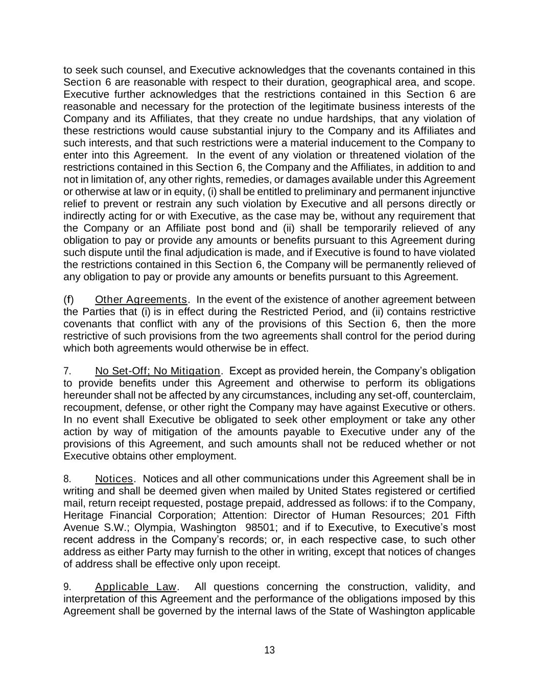 13 to seek such counsel, and Executive acknowledges that the covenants contained in this Section 6 are reasonable with respect to their duration, geographical area, and scope. Executive further acknowledges that the restrictions contained in this Section 6 are reasonable and necessary for the protection of the legitimate business interests of the Company and its Affiliates, that they create no undue hardships, that any violation of these restrictions would cause substantial injury to the Company and its Affiliates and such interests, and that such restrictions were a material inducement to the Company to enter into this Agreement. In the event of any violation or threatened violation of the restrictions contained in this Section 6, the Company and the Affiliates, in addition to and not in limitation of, any other rights, remedies, or damages available under this Agreement or otherwise at law or in equity, (i) shall be entitled to preliminary and permanent injunctive relief to prevent or restrain any such violation by Executive and all persons directly or indirectly acting for or with Executive, as the case may be, without any requirement that the Company or an Affiliate post bond and (ii) shall be temporarily relieved of any obligation to pay or provide any amounts or benefits pursuant to this Agreement during such dispute until the final adjudication is made, and if Executive is found to have violated the restrictions contained in this Section 6, the Company will be permanently relieved of any obligation to pay or provide any amounts or benefits pursuant to this Agreement. (f) Other Agreements. In the event of the existence of another agreement between the Parties that (i) is in effect during the Restricted Period, and (ii) contains restrictive covenants that conflict with any of the provisions of this Section 6, then the more restrictive of such provisions from the two agreements shall control for the period during which both agreements would otherwise be in effect. 7. No Set-Off; No Mitigation. Except as provided herein, the Company’s obligation to provide benefits under this Agreement and otherwise to perform its obligations hereunder shall not be affected by any circumstances, including any set-off, counterclaim, recoupment, defense, or other right the Company may have against Executive or others. In no event shall Executive be obligated to seek other employment or take any other action by way of mitigation of the amounts payable to Executive under any of the provisions of this Agreement, and such amounts shall not be reduced whether or not Executive obtains other employment. 8. Notices. Notices and all other communications under this Agreement shall be in writing and shall be deemed given when mailed by United States registered or certified mail, return receipt requested, postage prepaid, addressed as follows: if to the Company, Heritage Financial Corporation; Attention: Director of Human Resources; 201 Fifth Avenue S.W.; Olympia, Washington 98501; and if to Executive, to Executive’s most recent address in the Company’s records; or, in each respective case, to such other address as either Party may furnish to the other in writing, except that notices of changes of address shall be effective only upon receipt. 9. Applicable Law. All questions concerning the construction, validity, and interpretation of this Agreement and the performance of the obligations imposed by this Agreement shall be governed by the internal laws of the State of Washington applicable