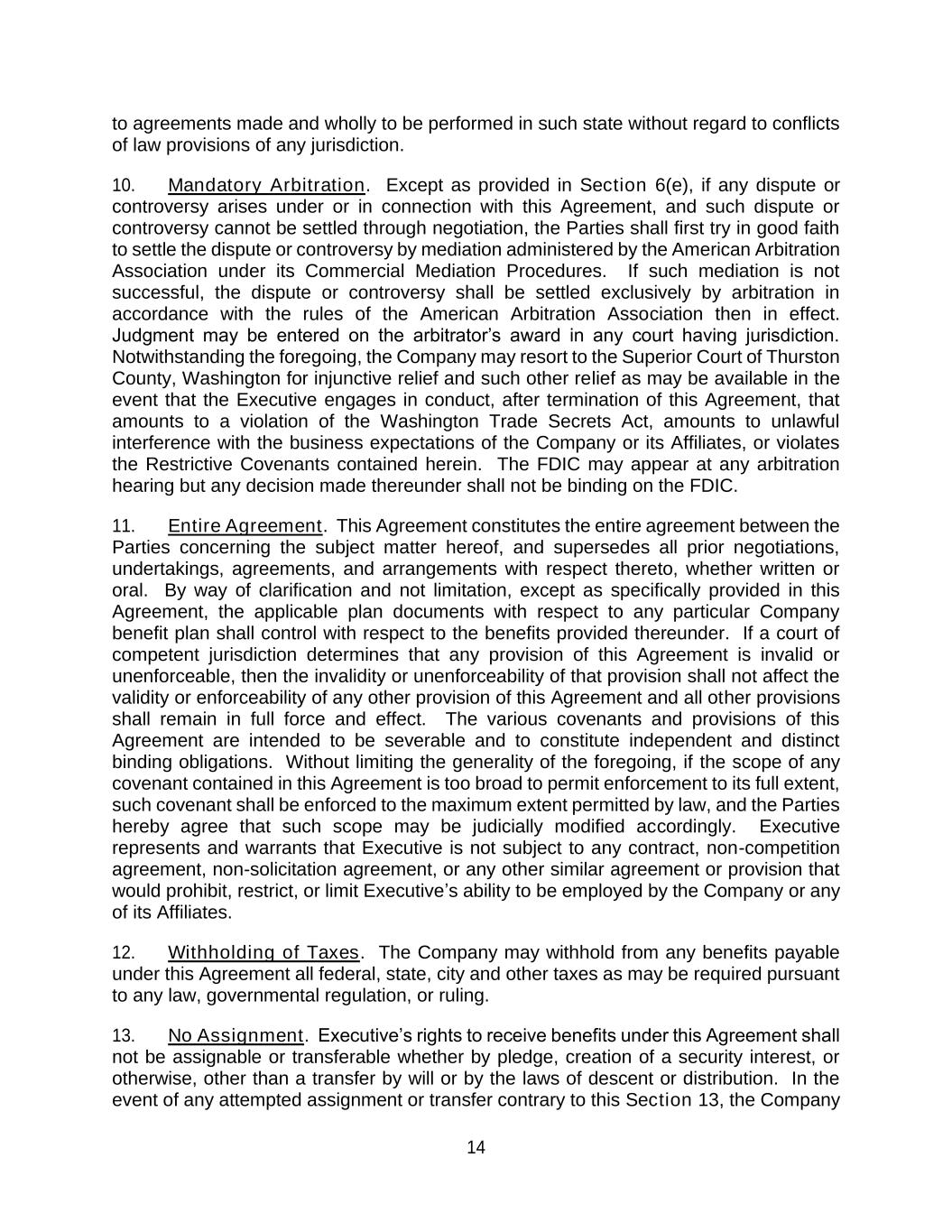 14 to agreements made and wholly to be performed in such state without regard to conflicts of law provisions of any jurisdiction. 10. Mandatory Arbitration. Except as provided in Section 6(e), if any dispute or controversy arises under or in connection with this Agreement, and such dispute or controversy cannot be settled through negotiation, the Parties shall first try in good faith to settle the dispute or controversy by mediation administered by the American Arbitration Association under its Commercial Mediation Procedures. If such mediation is not successful, the dispute or controversy shall be settled exclusively by arbitration in accordance with the rules of the American Arbitration Association then in effect. Judgment may be entered on the arbitrator’s award in any court having jurisdiction. Notwithstanding the foregoing, the Company may resort to the Superior Court of Thurston County, Washington for injunctive relief and such other relief as may be available in the event that the Executive engages in conduct, after termination of this Agreement, that amounts to a violation of the Washington Trade Secrets Act, amounts to unlawful interference with the business expectations of the Company or its Affiliates, or violates the Restrictive Covenants contained herein. The FDIC may appear at any arbitration hearing but any decision made thereunder shall not be binding on the FDIC. 11. Entire Agreement. This Agreement constitutes the entire agreement between the Parties concerning the subject matter hereof, and supersedes all prior negotiations, undertakings, agreements, and arrangements with respect thereto, whether written or oral. By way of clarification and not limitation, except as specifically provided in this Agreement, the applicable plan documents with respect to any particular Company benefit plan shall control with respect to the benefits provided thereunder. If a court of competent jurisdiction determines that any provision of this Agreement is invalid or unenforceable, then the invalidity or unenforceability of that provision shall not affect the validity or enforceability of any other provision of this Agreement and all other provisions shall remain in full force and effect. The various covenants and provisions of this Agreement are intended to be severable and to constitute independent and distinct binding obligations. Without limiting the generality of the foregoing, if the scope of any covenant contained in this Agreement is too broad to permit enforcement to its full extent, such covenant shall be enforced to the maximum extent permitted by law, and the Parties hereby agree that such scope may be judicially modified accordingly. Executive represents and warrants that Executive is not subject to any contract, non-competition agreement, non-solicitation agreement, or any other similar agreement or provision that would prohibit, restrict, or limit Executive’s ability to be employed by the Company or any of its Affiliates. 12. Withholding of Taxes. The Company may withhold from any benefits payable under this Agreement all federal, state, city and other taxes as may be required pursuant to any law, governmental regulation, or ruling. 13. No Assignment. Executive’s rights to receive benefits under this Agreement shall not be assignable or transferable whether by pledge, creation of a security interest, or otherwise, other than a transfer by will or by the laws of descent or distribution. In the event of any attempted assignment or transfer contrary to this Section 13, the Company
