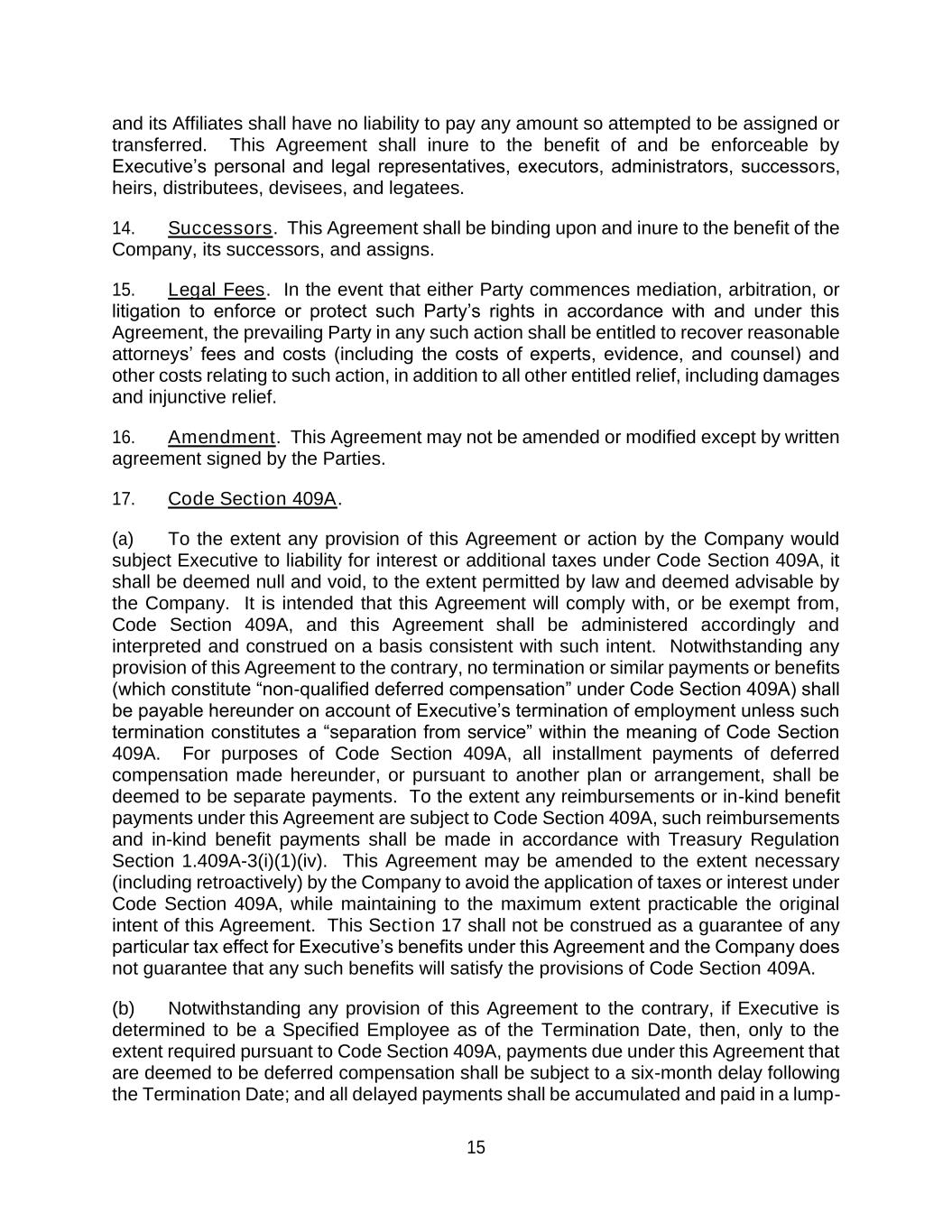 15 and its Affiliates shall have no liability to pay any amount so attempted to be assigned or transferred. This Agreement shall inure to the benefit of and be enforceable by Executive’s personal and legal representatives, executors, administrators, successors, heirs, distributees, devisees, and legatees. 14. Successors. This Agreement shall be binding upon and inure to the benefit of the Company, its successors, and assigns. 15. Legal Fees. In the event that either Party commences mediation, arbitration, or litigation to enforce or protect such Party’s rights in accordance with and under this Agreement, the prevailing Party in any such action shall be entitled to recover reasonable attorneys’ fees and costs (including the costs of experts, evidence, and counsel) and other costs relating to such action, in addition to all other entitled relief, including damages and injunctive relief. 16. Amendment. This Agreement may not be amended or modified except by written agreement signed by the Parties. 17. Code Section 409A. (a) To the extent any provision of this Agreement or action by the Company would subject Executive to liability for interest or additional taxes under Code Section 409A, it shall be deemed null and void, to the extent permitted by law and deemed advisable by the Company. It is intended that this Agreement will comply with, or be exempt from, Code Section 409A, and this Agreement shall be administered accordingly and interpreted and construed on a basis consistent with such intent. Notwithstanding any provision of this Agreement to the contrary, no termination or similar payments or benefits (which constitute “non-qualified deferred compensation” under Code Section 409A) shall be payable hereunder on account of Executive’s termination of employment unless such termination constitutes a “separation from service” within the meaning of Code Section 409A. For purposes of Code Section 409A, all installment payments of deferred compensation made hereunder, or pursuant to another plan or arrangement, shall be deemed to be separate payments. To the extent any reimbursements or in-kind benefit payments under this Agreement are subject to Code Section 409A, such reimbursements and in-kind benefit payments shall be made in accordance with Treasury Regulation Section 1.409A-3(i)(1)(iv). This Agreement may be amended to the extent necessary (including retroactively) by the Company to avoid the application of taxes or interest under Code Section 409A, while maintaining to the maximum extent practicable the original intent of this Agreement. This Section 17 shall not be construed as a guarantee of any particular tax effect for Executive’s benefits under this Agreement and the Company does not guarantee that any such benefits will satisfy the provisions of Code Section 409A. (b) Notwithstanding any provision of this Agreement to the contrary, if Executive is determined to be a Specified Employee as of the Termination Date, then, only to the extent required pursuant to Code Section 409A, payments due under this Agreement that are deemed to be deferred compensation shall be subject to a six-month delay following the Termination Date; and all delayed payments shall be accumulated and paid in a lump-