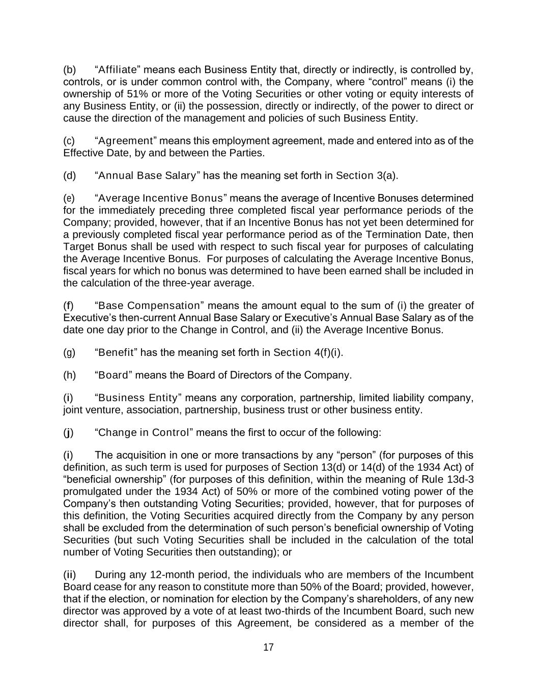 17 (b) “Affiliate” means each Business Entity that, directly or indirectly, is controlled by, controls, or is under common control with, the Company, where “control” means (i) the ownership of 51% or more of the Voting Securities or other voting or equity interests of any Business Entity, or (ii) the possession, directly or indirectly, of the power to direct or cause the direction of the management and policies of such Business Entity. (c) “Agreement” means this employment agreement, made and entered into as of the Effective Date, by and between the Parties. (d) “Annual Base Salary” has the meaning set forth in Section 3(a). (e) “Average Incentive Bonus” means the average of Incentive Bonuses determined for the immediately preceding three completed fiscal year performance periods of the Company; provided, however, that if an Incentive Bonus has not yet been determined for a previously completed fiscal year performance period as of the Termination Date, then Target Bonus shall be used with respect to such fiscal year for purposes of calculating the Average Incentive Bonus. For purposes of calculating the Average Incentive Bonus, fiscal years for which no bonus was determined to have been earned shall be included in the calculation of the three-year average. (f) “Base Compensation” means the amount equal to the sum of (i) the greater of Executive’s then-current Annual Base Salary or Executive’s Annual Base Salary as of the date one day prior to the Change in Control, and (ii) the Average Incentive Bonus. (g) “Benefit” has the meaning set forth in Section 4(f)(i). (h) “Board” means the Board of Directors of the Company. (i) “Business Entity” means any corporation, partnership, limited liability company, joint venture, association, partnership, business trust or other business entity. (j) “Change in Control” means the first to occur of the following: (i) The acquisition in one or more transactions by any “person” (for purposes of this definition, as such term is used for purposes of Section 13(d) or 14(d) of the 1934 Act) of “beneficial ownership” (for purposes of this definition, within the meaning of Rule 13d-3 promulgated under the 1934 Act) of 50% or more of the combined voting power of the Company’s then outstanding Voting Securities; provided, however, that for purposes of this definition, the Voting Securities acquired directly from the Company by any person shall be excluded from the determination of such person’s beneficial ownership of Voting Securities (but such Voting Securities shall be included in the calculation of the total number of Voting Securities then outstanding); or (ii) During any 12-month period, the individuals who are members of the Incumbent Board cease for any reason to constitute more than 50% of the Board; provided, however, that if the election, or nomination for election by the Company’s shareholders, of any new director was approved by a vote of at least two-thirds of the Incumbent Board, such new director shall, for purposes of this Agreement, be considered as a member of the
