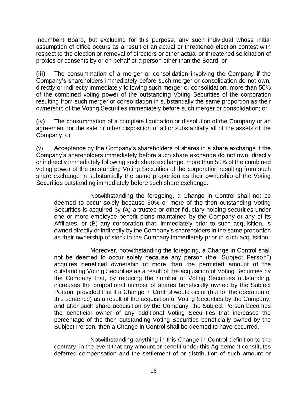 18 Incumbent Board, but excluding for this purpose, any such individual whose initial assumption of office occurs as a result of an actual or threatened election contest with respect to the election or removal of directors or other actual or threatened solicitation of proxies or consents by or on behalf of a person other than the Board; or (iii) The consummation of a merger or consolidation involving the Company if the Company’s shareholders immediately before such merger or consolidation do not own, directly or indirectly immediately following such merger or consolidation, more than 50% of the combined voting power of the outstanding Voting Securities of the corporation resulting from such merger or consolidation in substantially the same proportion as their ownership of the Voting Securities immediately before such merger or consolidation; or (iv) The consummation of a complete liquidation or dissolution of the Company or an agreement for the sale or other disposition of all or substantially all of the assets of the Company; or (v) Acceptance by the Company’s shareholders of shares in a share exchange if the Company’s shareholders immediately before such share exchange do not own, directly or indirectly immediately following such share exchange, more than 50% of the combined voting power of the outstanding Voting Securities of the corporation resulting from such share exchange in substantially the same proportion as their ownership of the Voting Securities outstanding immediately before such share exchange. Notwithstanding the foregoing, a Change in Control shall not be deemed to occur solely because 50% or more of the then outstanding Voting Securities is acquired by (A) a trustee or other fiduciary holding securities under one or more employee benefit plans maintained by the Company or any of its Affiliates, or (B) any corporation that, immediately prior to such acquisition, is owned directly or indirectly by the Company’s shareholders in the same proportion as their ownership of stock in the Company immediately prior to such acquisition. Moreover, notwithstanding the foregoing, a Change in Control shall not be deemed to occur solely because any person (the “Subject Person”) acquires beneficial ownership of more than the permitted amount of the outstanding Voting Securities as a result of the acquisition of Voting Securities by the Company that, by reducing the number of Voting Securities outstanding, increases the proportional number of shares beneficially owned by the Subject Person, provided that if a Change in Control would occur (but for the operation of this sentence) as a result of the acquisition of Voting Securities by the Company, and after such share acquisition by the Company, the Subject Person becomes the beneficial owner of any additional Voting Securities that increases the percentage of the then outstanding Voting Securities beneficially owned by the Subject Person, then a Change in Control shall be deemed to have occurred. Notwithstanding anything in this Change in Control definition to the contrary, in the event that any amount or benefit under this Agreement constitutes deferred compensation and the settlement of or distribution of such amount or