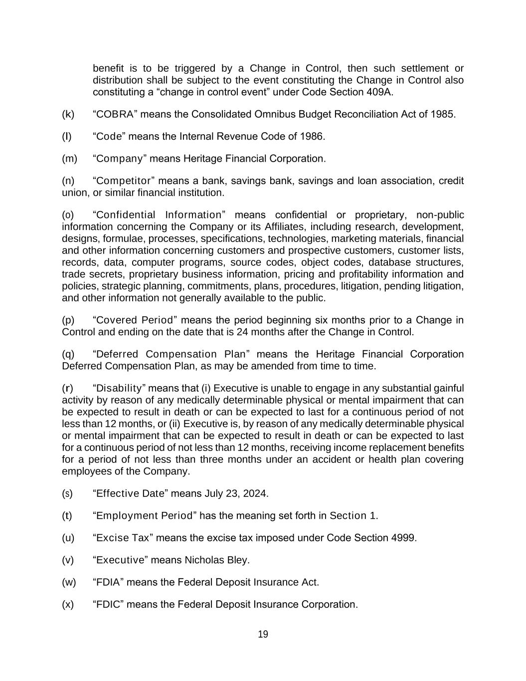 19 benefit is to be triggered by a Change in Control, then such settlement or distribution shall be subject to the event constituting the Change in Control also constituting a “change in control event” under Code Section 409A. (k) “COBRA” means the Consolidated Omnibus Budget Reconciliation Act of 1985. (l) “Code” means the Internal Revenue Code of 1986. (m) “Company” means Heritage Financial Corporation. (n) “Competitor” means a bank, savings bank, savings and loan association, credit union, or similar financial institution. (o) “Confidential Information” means confidential or proprietary, non-public information concerning the Company or its Affiliates, including research, development, designs, formulae, processes, specifications, technologies, marketing materials, financial and other information concerning customers and prospective customers, customer lists, records, data, computer programs, source codes, object codes, database structures, trade secrets, proprietary business information, pricing and profitability information and policies, strategic planning, commitments, plans, procedures, litigation, pending litigation, and other information not generally available to the public. (p) “Covered Period” means the period beginning six months prior to a Change in Control and ending on the date that is 24 months after the Change in Control. (q) “Deferred Compensation Plan” means the Heritage Financial Corporation Deferred Compensation Plan, as may be amended from time to time. (r) “Disability” means that (i) Executive is unable to engage in any substantial gainful activity by reason of any medically determinable physical or mental impairment that can be expected to result in death or can be expected to last for a continuous period of not less than 12 months, or (ii) Executive is, by reason of any medically determinable physical or mental impairment that can be expected to result in death or can be expected to last for a continuous period of not less than 12 months, receiving income replacement benefits for a period of not less than three months under an accident or health plan covering employees of the Company. (s) “Effective Date” means July 23, 2024. (t) “Employment Period” has the meaning set forth in Section 1. (u) “Excise Tax” means the excise tax imposed under Code Section 4999. (v) “Executive” means Nicholas Bley. (w) “FDIA” means the Federal Deposit Insurance Act. (x) “FDIC” means the Federal Deposit Insurance Corporation.