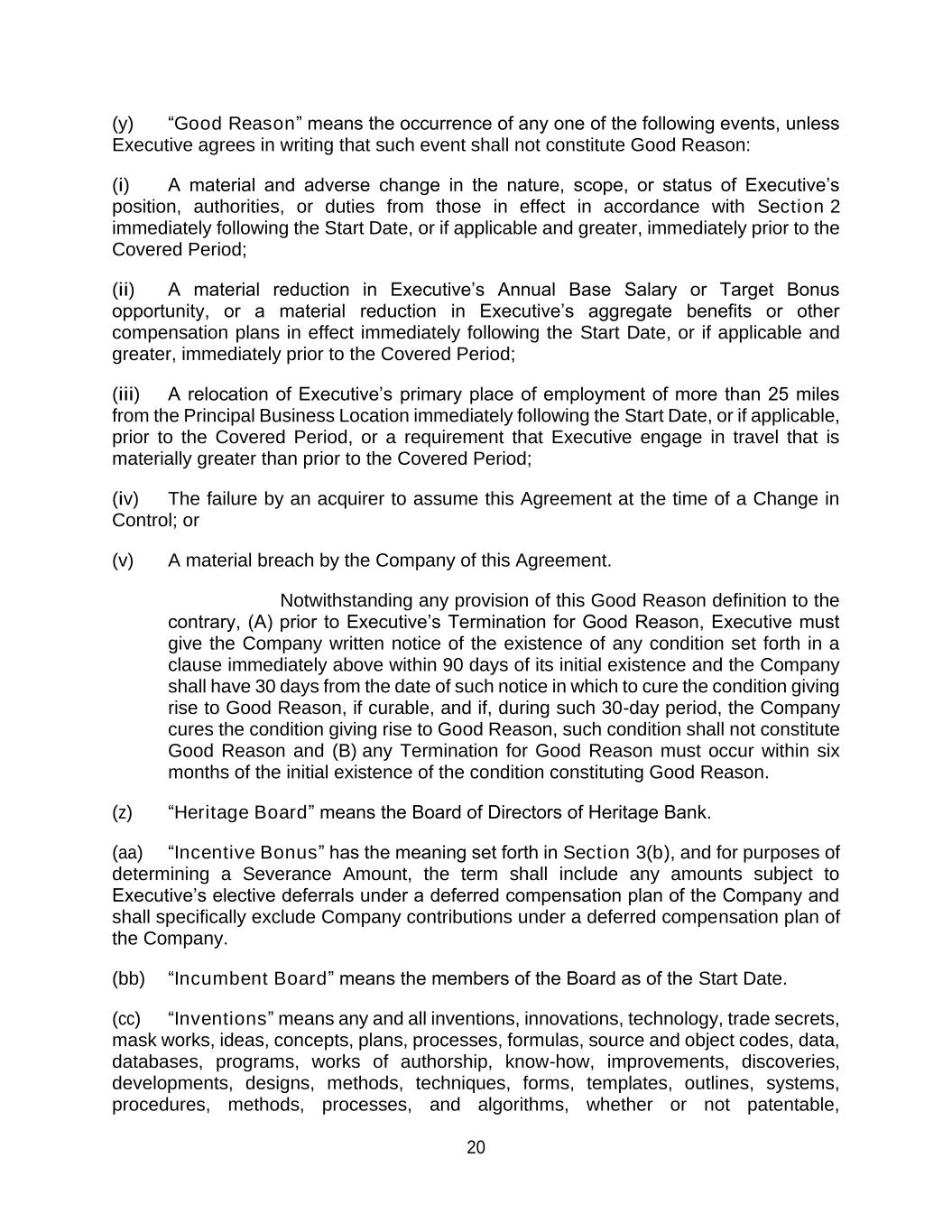 20 (y) “Good Reason” means the occurrence of any one of the following events, unless Executive agrees in writing that such event shall not constitute Good Reason: (i) A material and adverse change in the nature, scope, or status of Executive’s position, authorities, or duties from those in effect in accordance with Section 2 immediately following the Start Date, or if applicable and greater, immediately prior to the Covered Period; (ii) A material reduction in Executive’s Annual Base Salary or Target Bonus opportunity, or a material reduction in Executive’s aggregate benefits or other compensation plans in effect immediately following the Start Date, or if applicable and greater, immediately prior to the Covered Period; (iii) A relocation of Executive’s primary place of employment of more than 25 miles from the Principal Business Location immediately following the Start Date, or if applicable, prior to the Covered Period, or a requirement that Executive engage in travel that is materially greater than prior to the Covered Period; (iv) The failure by an acquirer to assume this Agreement at the time of a Change in Control; or (v) A material breach by the Company of this Agreement. Notwithstanding any provision of this Good Reason definition to the contrary, (A) prior to Executive’s Termination for Good Reason, Executive must give the Company written notice of the existence of any condition set forth in a clause immediately above within 90 days of its initial existence and the Company shall have 30 days from the date of such notice in which to cure the condition giving rise to Good Reason, if curable, and if, during such 30-day period, the Company cures the condition giving rise to Good Reason, such condition shall not constitute Good Reason and (B) any Termination for Good Reason must occur within six months of the initial existence of the condition constituting Good Reason. (z) “Heritage Board” means the Board of Directors of Heritage Bank. (aa) “Incentive Bonus” has the meaning set forth in Section 3(b), and for purposes of determining a Severance Amount, the term shall include any amounts subject to Executive’s elective deferrals under a deferred compensation plan of the Company and shall specifically exclude Company contributions under a deferred compensation plan of the Company. (bb) “Incumbent Board” means the members of the Board as of the Start Date. (cc) “Inventions” means any and all inventions, innovations, technology, trade secrets, mask works, ideas, concepts, plans, processes, formulas, source and object codes, data, databases, programs, works of authorship, know-how, improvements, discoveries, developments, designs, methods, techniques, forms, templates, outlines, systems, procedures, methods, processes, and algorithms, whether or not patentable,