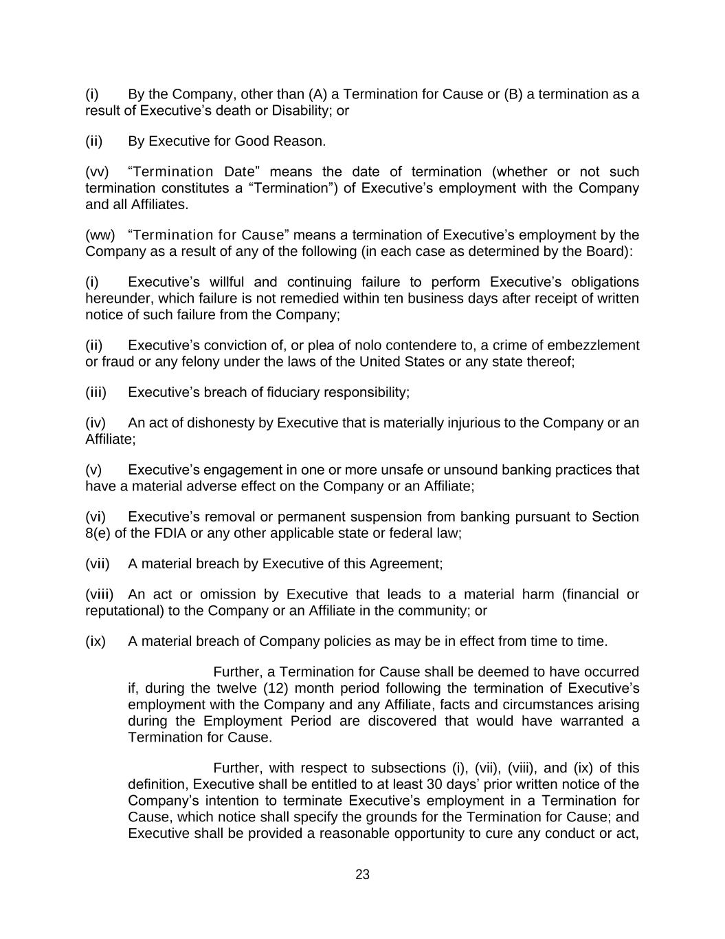 23 (i) By the Company, other than (A) a Termination for Cause or (B) a termination as a result of Executive’s death or Disability; or (ii) By Executive for Good Reason. (vv) “Termination Date” means the date of termination (whether or not such termination constitutes a “Termination”) of Executive’s employment with the Company and all Affiliates. (ww) “Termination for Cause” means a termination of Executive’s employment by the Company as a result of any of the following (in each case as determined by the Board): (i) Executive’s willful and continuing failure to perform Executive’s obligations hereunder, which failure is not remedied within ten business days after receipt of written notice of such failure from the Company; (ii) Executive’s conviction of, or plea of nolo contendere to, a crime of embezzlement or fraud or any felony under the laws of the United States or any state thereof; (iii) Executive’s breach of fiduciary responsibility; (iv) An act of dishonesty by Executive that is materially injurious to the Company or an Affiliate; (v) Executive’s engagement in one or more unsafe or unsound banking practices that have a material adverse effect on the Company or an Affiliate; (vi) Executive’s removal or permanent suspension from banking pursuant to Section 8(e) of the FDIA or any other applicable state or federal law; (vii) A material breach by Executive of this Agreement; (viii) An act or omission by Executive that leads to a material harm (financial or reputational) to the Company or an Affiliate in the community; or (ix) A material breach of Company policies as may be in effect from time to time. Further, a Termination for Cause shall be deemed to have occurred if, during the twelve (12) month period following the termination of Executive’s employment with the Company and any Affiliate, facts and circumstances arising during the Employment Period are discovered that would have warranted a Termination for Cause. Further, with respect to subsections (i), (vii), (viii), and (ix) of this definition, Executive shall be entitled to at least 30 days’ prior written notice of the Company’s intention to terminate Executive’s employment in a Termination for Cause, which notice shall specify the grounds for the Termination for Cause; and Executive shall be provided a reasonable opportunity to cure any conduct or act,