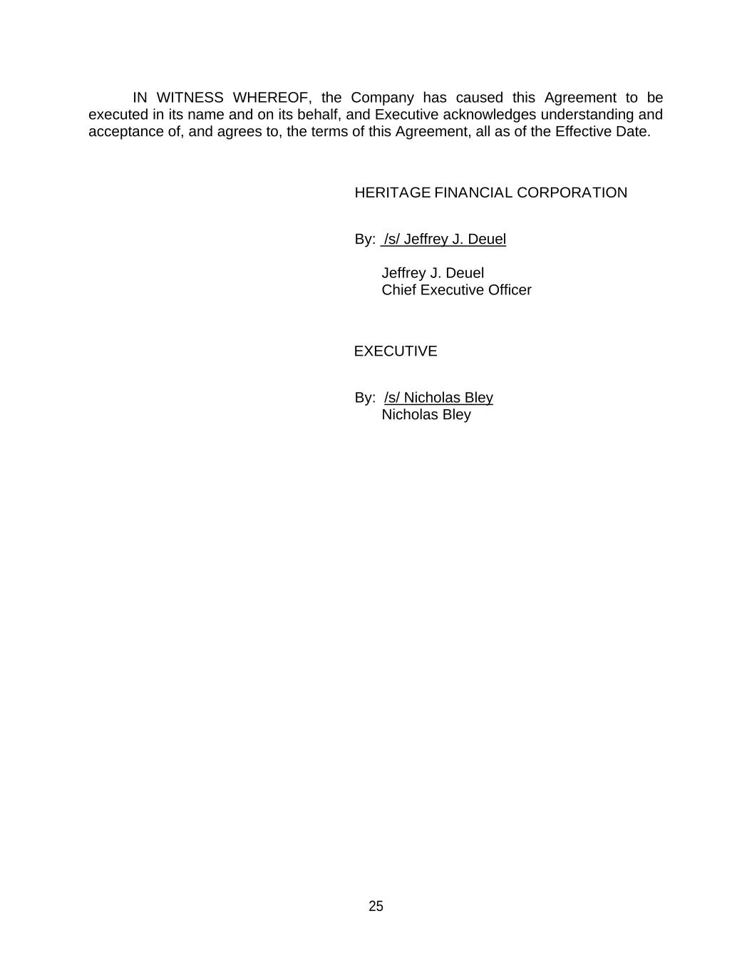 25 IN WITNESS WHEREOF, the Company has caused this Agreement to be executed in its name and on its behalf, and Executive acknowledges understanding and acceptance of, and agrees to, the terms of this Agreement, all as of the Effective Date. HERITAGE FINANCIAL CORPORATION By: /s/ Jeffrey J. Deuel Jeffrey J. Deuel Chief Executive Officer EXECUTIVE By: /s/ Nicholas Bley Nicholas Bley