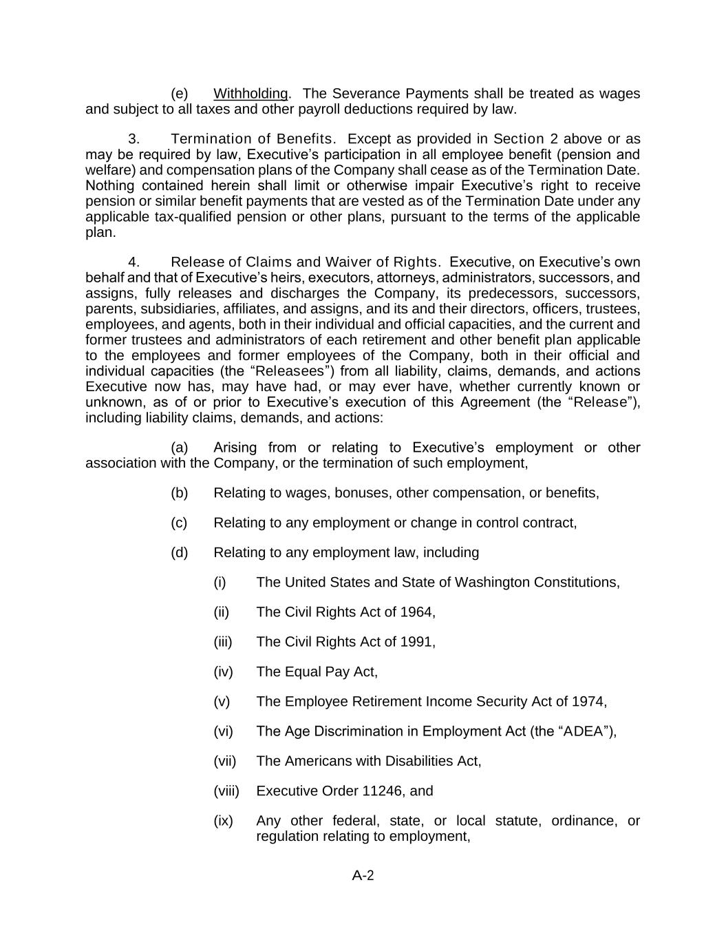 A-2 (e) Withholding. The Severance Payments shall be treated as wages and subject to all taxes and other payroll deductions required by law. 3. Termination of Benefits. Except as provided in Section 2 above or as may be required by law, Executive’s participation in all employee benefit (pension and welfare) and compensation plans of the Company shall cease as of the Termination Date. Nothing contained herein shall limit or otherwise impair Executive’s right to receive pension or similar benefit payments that are vested as of the Termination Date under any applicable tax-qualified pension or other plans, pursuant to the terms of the applicable plan. 4. Release of Claims and Waiver of Rights. Executive, on Executive’s own behalf and that of Executive’s heirs, executors, attorneys, administrators, successors, and assigns, fully releases and discharges the Company, its predecessors, successors, parents, subsidiaries, affiliates, and assigns, and its and their directors, officers, trustees, employees, and agents, both in their individual and official capacities, and the current and former trustees and administrators of each retirement and other benefit plan applicable to the employees and former employees of the Company, both in their official and individual capacities (the “Releasees”) from all liability, claims, demands, and actions Executive now has, may have had, or may ever have, whether currently known or unknown, as of or prior to Executive’s execution of this Agreement (the “Release”), including liability claims, demands, and actions: (a) Arising from or relating to Executive’s employment or other association with the Company, or the termination of such employment, (b) Relating to wages, bonuses, other compensation, or benefits, (c) Relating to any employment or change in control contract, (d) Relating to any employment law, including (i) The United States and State of Washington Constitutions, (ii) The Civil Rights Act of 1964, (iii) The Civil Rights Act of 1991, (iv) The Equal Pay Act, (v) The Employee Retirement Income Security Act of 1974, (vi) The Age Discrimination in Employment Act (the “ADEA”), (vii) The Americans with Disabilities Act, (viii) Executive Order 11246, and (ix) Any other federal, state, or local statute, ordinance, or regulation relating to employment,