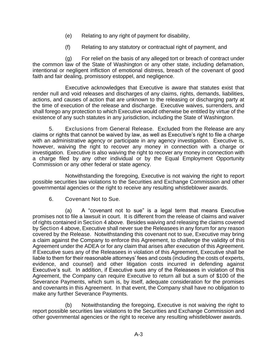 A-3 (e) Relating to any right of payment for disability, (f) Relating to any statutory or contractual right of payment, and (g) For relief on the basis of any alleged tort or breach of contract under the common law of the State of Washington or any other state, including defamation, intentional or negligent infliction of emotional distress, breach of the covenant of good faith and fair dealing, promissory estoppel, and negligence. Executive acknowledges that Executive is aware that statutes exist that render null and void releases and discharges of any claims, rights, demands, liabilities, actions, and causes of action that are unknown to the releasing or discharging party at the time of execution of the release and discharge. Executive waives, surrenders, and shall forego any protection to which Executive would otherwise be entitled by virtue of the existence of any such statutes in any jurisdiction, including the State of Washington. 5. Exclusions from General Release. Excluded from the Release are any claims or rights that cannot be waived by law, as well as Executive’s right to file a charge with an administrative agency or participate in any agency investigation. Executive is, however, waiving the right to recover any money in connection with a charge or investigation. Executive is also waiving the right to recover any money in connection with a charge filed by any other individual or by the Equal Employment Opportunity Commission or any other federal or state agency. Notwithstanding the foregoing, Executive is not waiving the right to report possible securities law violations to the Securities and Exchange Commission and other governmental agencies or the right to receive any resulting whistleblower awards. 6. Covenant Not to Sue. (a) A “covenant not to sue” is a legal term that means Executive promises not to file a lawsuit in court. It is different from the release of claims and waiver of rights contained in Section 4 above. Besides waiving and releasing the claims covered by Section 4 above, Executive shall never sue the Releasees in any forum for any reason covered by the Release. Notwithstanding this covenant not to sue, Executive may bring a claim against the Company to enforce this Agreement, to challenge the validity of this Agreement under the ADEA or for any claim that arises after execution of this Agreement. If Executive sues any of the Releasees in violation of this Agreement, Executive shall be liable to them for their reasonable attorneys’ fees and costs (including the costs of experts, evidence, and counsel) and other litigation costs incurred in defending against Executive’s suit. In addition, if Executive sues any of the Releasees in violation of this Agreement, the Company can require Executive to return all but a sum of $100 of the Severance Payments, which sum is, by itself, adequate consideration for the promises and covenants in this Agreement. In that event, the Company shall have no obligation to make any further Severance Payments. (b) Notwithstanding the foregoing, Executive is not waiving the right to report possible securities law violations to the Securities and Exchange Commission and other governmental agencies or the right to receive any resulting whistleblower awards.