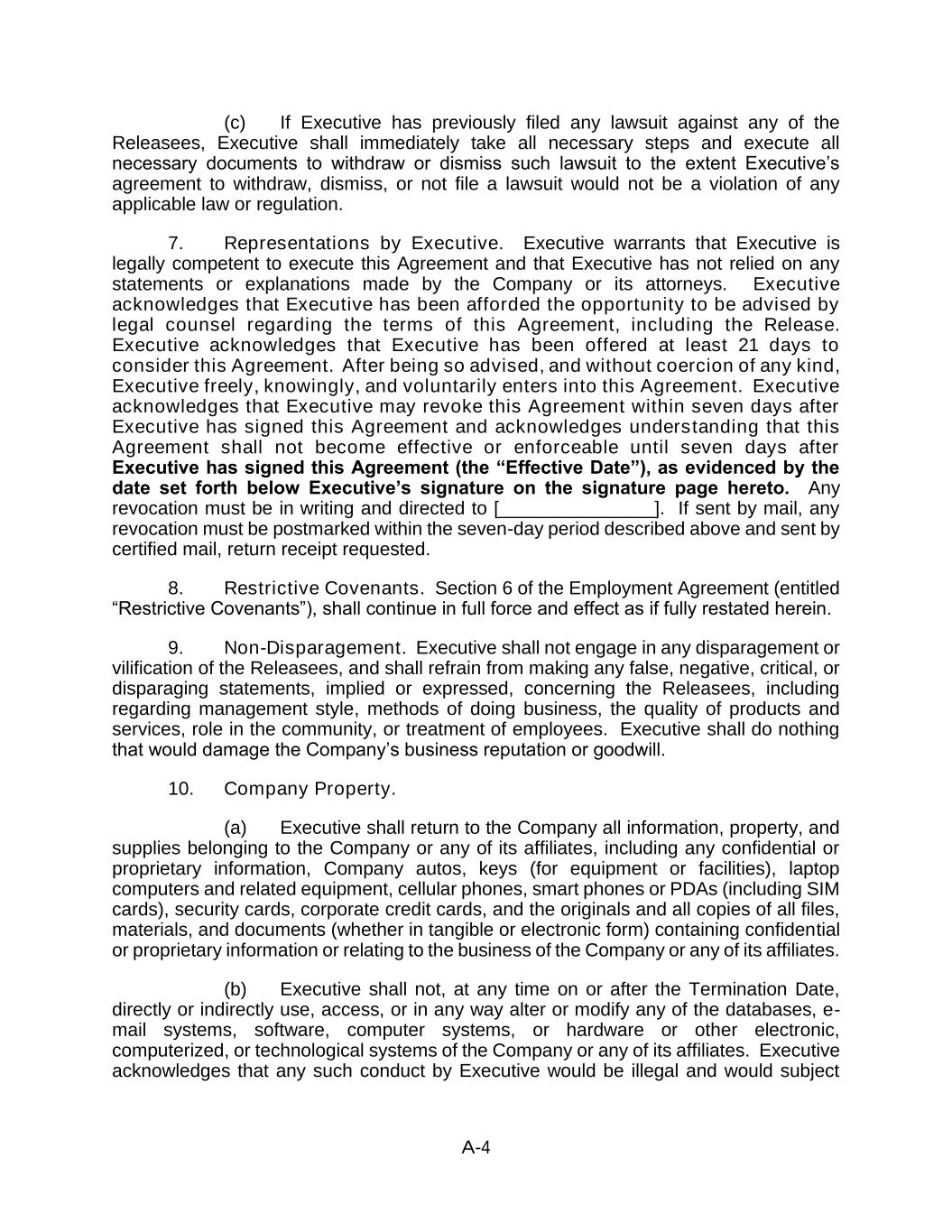 A-4 (c) If Executive has previously filed any lawsuit against any of the Releasees, Executive shall immediately take all necessary steps and execute all necessary documents to withdraw or dismiss such lawsuit to the extent Executive’s agreement to withdraw, dismiss, or not file a lawsuit would not be a violation of any applicable law or regulation. 7. Representations by Executive. Executive warrants that Executive is legally competent to execute this Agreement and that Executive has not relied on any statements or explanations made by the Company or its attorneys. Executive acknowledges that Executive has been afforded the opportunity to be advised by legal counsel regarding the terms of this Agreement, including the Release. Executive acknowledges that Executive has been offered at least 21 days to consider this Agreement. After being so advised, and without coercion of any kind, Executive freely, knowingly, and voluntarily enters into this Agreement. Executive acknowledges that Executive may revoke this Agreement within seven days after Executive has signed this Agreement and acknowledges understanding that this Agreement shall not become effective or enforceable until seven days after Executive has signed this Agreement (the “Effective Date”), as evidenced by the date set forth below Executive’s signature on the signature page hereto. Any revocation must be in writing and directed to [_______________]. If sent by mail, any revocation must be postmarked within the seven-day period described above and sent by certified mail, return receipt requested. 8. Restrictive Covenants. Section 6 of the Employment Agreement (entitled “Restrictive Covenants”), shall continue in full force and effect as if fully restated herein. 9. Non-Disparagement. Executive shall not engage in any disparagement or vilification of the Releasees, and shall refrain from making any false, negative, critical, or disparaging statements, implied or expressed, concerning the Releasees, including regarding management style, methods of doing business, the quality of products and services, role in the community, or treatment of employees. Executive shall do nothing that would damage the Company’s business reputation or goodwill. 10. Company Property. (a) Executive shall return to the Company all information, property, and supplies belonging to the Company or any of its affiliates, including any confidential or proprietary information, Company autos, keys (for equipment or facilities), laptop computers and related equipment, cellular phones, smart phones or PDAs (including SIM cards), security cards, corporate credit cards, and the originals and all copies of all files, materials, and documents (whether in tangible or electronic form) containing confidential or proprietary information or relating to the business of the Company or any of its affiliates. (b) Executive shall not, at any time on or after the Termination Date, directly or indirectly use, access, or in any way alter or modify any of the databases, e- mail systems, software, computer systems, or hardware or other electronic, computerized, or technological systems of the Company or any of its affiliates. Executive acknowledges that any such conduct by Executive would be illegal and would subject