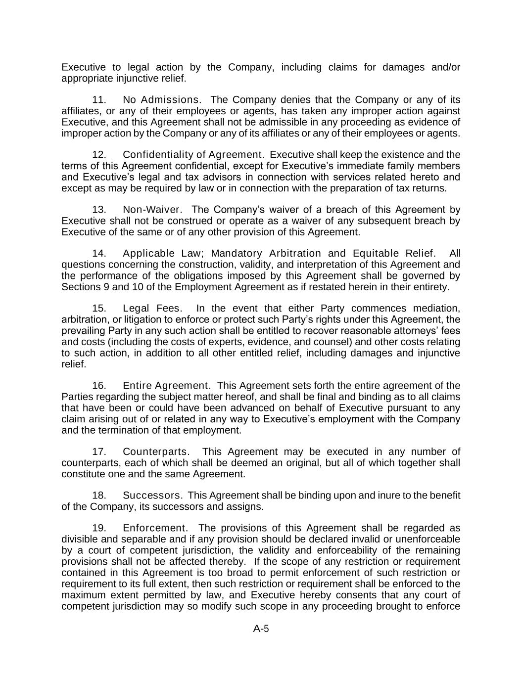 A-5 Executive to legal action by the Company, including claims for damages and/or appropriate injunctive relief. 11. No Admissions. The Company denies that the Company or any of its affiliates, or any of their employees or agents, has taken any improper action against Executive, and this Agreement shall not be admissible in any proceeding as evidence of improper action by the Company or any of its affiliates or any of their employees or agents. 12. Confidentiality of Agreement. Executive shall keep the existence and the terms of this Agreement confidential, except for Executive’s immediate family members and Executive’s legal and tax advisors in connection with services related hereto and except as may be required by law or in connection with the preparation of tax returns. 13. Non-Waiver. The Company’s waiver of a breach of this Agreement by Executive shall not be construed or operate as a waiver of any subsequent breach by Executive of the same or of any other provision of this Agreement. 14. Applicable Law; Mandatory Arbitration and Equitable Relief. All questions concerning the construction, validity, and interpretation of this Agreement and the performance of the obligations imposed by this Agreement shall be governed by Sections 9 and 10 of the Employment Agreement as if restated herein in their entirety. 15. Legal Fees. In the event that either Party commences mediation, arbitration, or litigation to enforce or protect such Party’s rights under this Agreement, the prevailing Party in any such action shall be entitled to recover reasonable attorneys’ fees and costs (including the costs of experts, evidence, and counsel) and other costs relating to such action, in addition to all other entitled relief, including damages and injunctive relief. 16. Entire Agreement. This Agreement sets forth the entire agreement of the Parties regarding the subject matter hereof, and shall be final and binding as to all claims that have been or could have been advanced on behalf of Executive pursuant to any claim arising out of or related in any way to Executive’s employment with the Company and the termination of that employment. 17. Counterparts. This Agreement may be executed in any number of counterparts, each of which shall be deemed an original, but all of which together shall constitute one and the same Agreement. 18. Successors. This Agreement shall be binding upon and inure to the benefit of the Company, its successors and assigns. 19. Enforcement. The provisions of this Agreement shall be regarded as divisible and separable and if any provision should be declared invalid or unenforceable by a court of competent jurisdiction, the validity and enforceability of the remaining provisions shall not be affected thereby. If the scope of any restriction or requirement contained in this Agreement is too broad to permit enforcement of such restriction or requirement to its full extent, then such restriction or requirement shall be enforced to the maximum extent permitted by law, and Executive hereby consents that any court of competent jurisdiction may so modify such scope in any proceeding brought to enforce