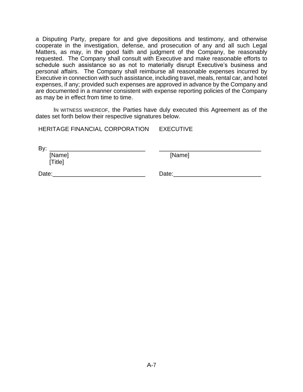 A-7 a Disputing Party, prepare for and give depositions and testimony, and otherwise cooperate in the investigation, defense, and prosecution of any and all such Legal Matters, as may, in the good faith and judgment of the Company, be reasonably requested. The Company shall consult with Executive and make reasonable efforts to schedule such assistance so as not to materially disrupt Executive’s business and personal affairs. The Company shall reimburse all reasonable expenses incurred by Executive in connection with such assistance, including travel, meals, rental car, and hotel expenses, if any; provided such expenses are approved in advance by the Company and are documented in a manner consistent with expense reporting policies of the Company as may be in effect from time to time. IN WITNESS WHEREOF, the Parties have duly executed this Agreement as of the dates set forth below their respective signatures below. HERITAGE FINANCIAL CORPORATION EXECUTIVE By: [Name] [Title] Date: [Name] Date: