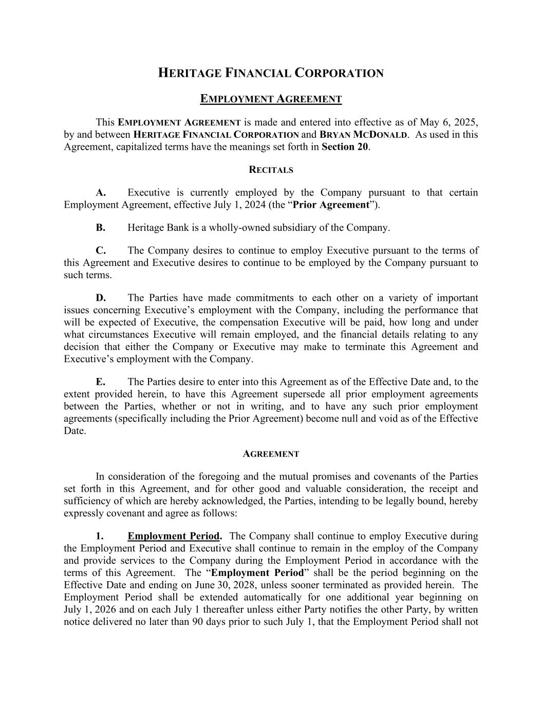 HERITAGE FINANCIAL CORPORATION EMPLOYMENT AGREEMENT This EMPLOYMENT AGREEMENT is made and entered into effective as of May 6, 2025, by and between HERITAGE FINANCIAL CORPORATION and BRYAN MCDONALD. As used in this Agreement, capitalized terms have the meanings set forth in Section 20. RECITALS A. Executive is currently employed by the Company pursuant to that certain Employment Agreement, effective July 1, 2024 (the “Prior Agreement”). B. Heritage Bank is a wholly-owned subsidiary of the Company. C. The Company desires to continue to employ Executive pursuant to the terms of this Agreement and Executive desires to continue to be employed by the Company pursuant to such terms. D. The Parties have made commitments to each other on a variety of important issues concerning Executive’s employment with the Company, including the performance that will be expected of Executive, the compensation Executive will be paid, how long and under what circumstances Executive will remain employed, and the financial details relating to any decision that either the Company or Executive may make to terminate this Agreement and Executive’s employment with the Company. E. The Parties desire to enter into this Agreement as of the Effective Date and, to the extent provided herein, to have this Agreement supersede all prior employment agreements between the Parties, whether or not in writing, and to have any such prior employment agreements (specifically including the Prior Agreement) become null and void as of the Effective Date. AGREEMENT In consideration of the foregoing and the mutual promises and covenants of the Parties set forth in this Agreement, and for other good and valuable consideration, the receipt and sufficiency of which are hereby acknowledged, the Parties, intending to be legally bound, hereby expressly covenant and agree as follows: 1. Employment Period. The Company shall continue to employ Executive during the Employment Period and Executive shall continue to remain in the employ of the Company and provide services to the Company during the Employment Period in accordance with the terms of this Agreement. The “Employment Period” shall be the period beginning on the Effective Date and ending on June 30, 2028, unless sooner terminated as provided herein. The Employment Period shall be extended automatically for one additional year beginning on July 1, 2026 and on each July 1 thereafter unless either Party notifies the other Party, by written notice delivered no later than 90 days prior to such July 1, that the Employment Period shall not