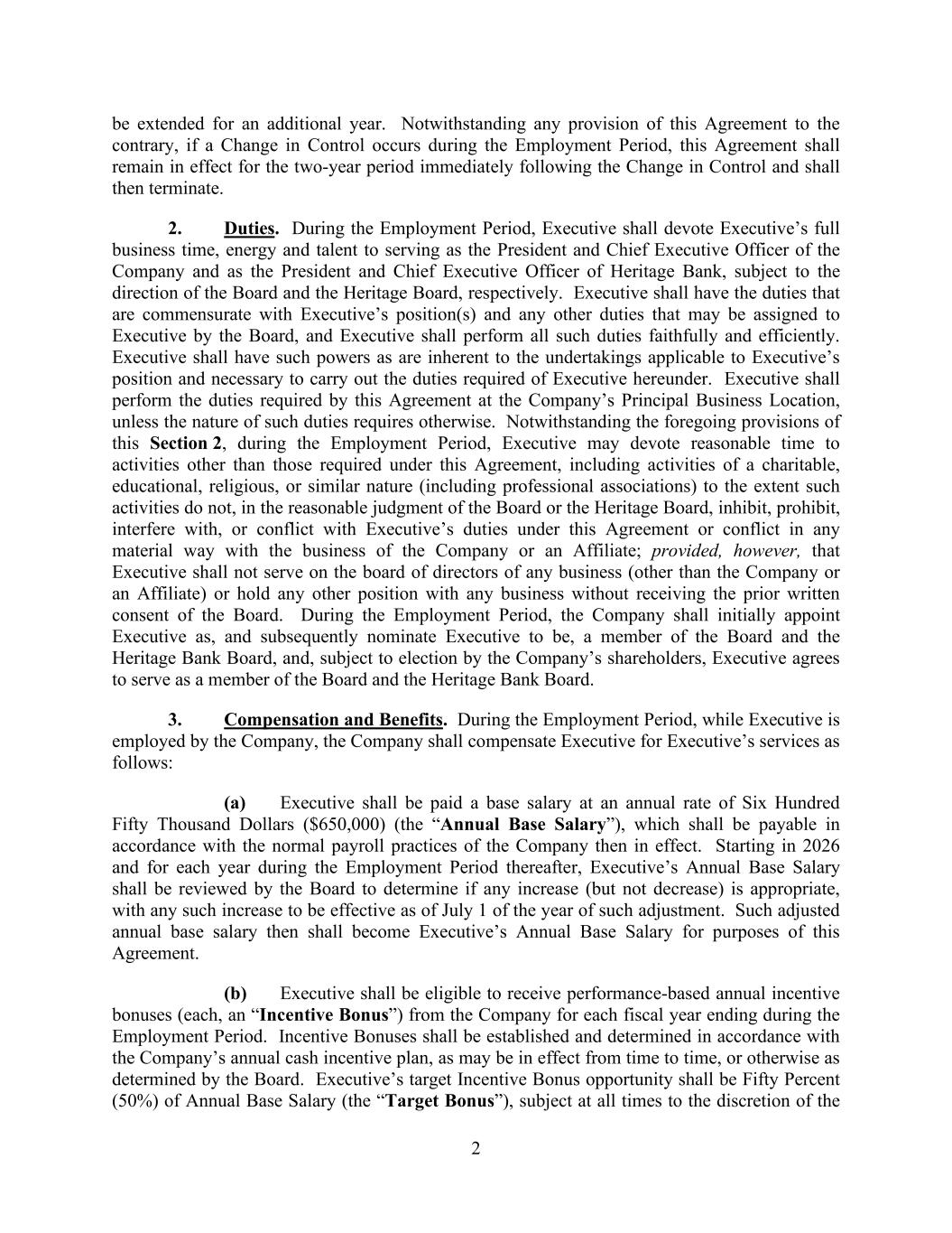 2 be extended for an additional year. Notwithstanding any provision of this Agreement to the contrary, if a Change in Control occurs during the Employment Period, this Agreement shall remain in effect for the two-year period immediately following the Change in Control and shall then terminate. 2. Duties. During the Employment Period, Executive shall devote Executive’s full business time, energy and talent to serving as the President and Chief Executive Officer of the Company and as the President and Chief Executive Officer of Heritage Bank, subject to the direction of the Board and the Heritage Board, respectively. Executive shall have the duties that are commensurate with Executive’s position(s) and any other duties that may be assigned to Executive by the Board, and Executive shall perform all such duties faithfully and efficiently. Executive shall have such powers as are inherent to the undertakings applicable to Executive’s position and necessary to carry out the duties required of Executive hereunder. Executive shall perform the duties required by this Agreement at the Company’s Principal Business Location, unless the nature of such duties requires otherwise. Notwithstanding the foregoing provisions of this Section 2, during the Employment Period, Executive may devote reasonable time to activities other than those required under this Agreement, including activities of a charitable, educational, religious, or similar nature (including professional associations) to the extent such activities do not, in the reasonable judgment of the Board or the Heritage Board, inhibit, prohibit, interfere with, or conflict with Executive’s duties under this Agreement or conflict in any material way with the business of the Company or an Affiliate; provided, however, that Executive shall not serve on the board of directors of any business (other than the Company or an Affiliate) or hold any other position with any business without receiving the prior written consent of the Board. During the Employment Period, the Company shall initially appoint Executive as, and subsequently nominate Executive to be, a member of the Board and the Heritage Bank Board, and, subject to election by the Company’s shareholders, Executive agrees to serve as a member of the Board and the Heritage Bank Board. 3. Compensation and Benefits. During the Employment Period, while Executive is employed by the Company, the Company shall compensate Executive for Executive’s services as follows: (a) Executive shall be paid a base salary at an annual rate of Six Hundred Fifty Thousand Dollars ($650,000) (the “Annual Base Salary”), which shall be payable in accordance with the normal payroll practices of the Company then in effect. Starting in 2026 and for each year during the Employment Period thereafter, Executive’s Annual Base Salary shall be reviewed by the Board to determine if any increase (but not decrease) is appropriate, with any such increase to be effective as of July 1 of the year of such adjustment. Such adjusted annual base salary then shall become Executive’s Annual Base Salary for purposes of this Agreement. (b) Executive shall be eligible to receive performance-based annual incentive bonuses (each, an “Incentive Bonus”) from the Company for each fiscal year ending during the Employment Period. Incentive Bonuses shall be established and determined in accordance with the Company’s annual cash incentive plan, as may be in effect from time to time, or otherwise as determined by the Board. Executive’s target Incentive Bonus opportunity shall be Fifty Percent (50%) of Annual Base Salary (the “Target Bonus”), subject at all times to the discretion of the