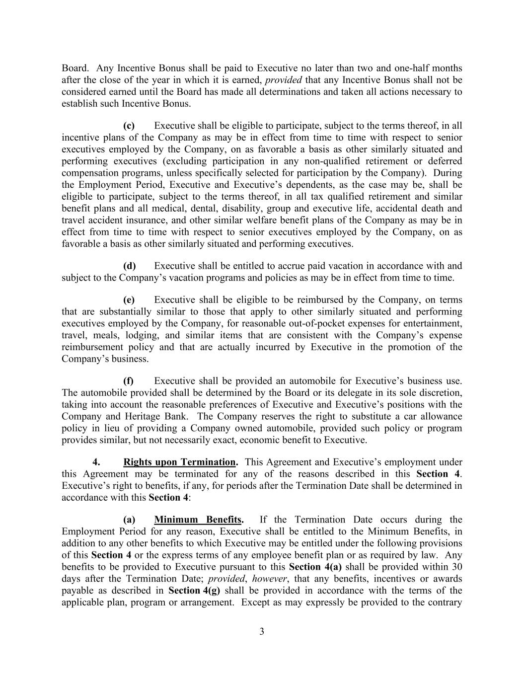 3 Board. Any Incentive Bonus shall be paid to Executive no later than two and one-half months after the close of the year in which it is earned, provided that any Incentive Bonus shall not be considered earned until the Board has made all determinations and taken all actions necessary to establish such Incentive Bonus. (c) Executive shall be eligible to participate, subject to the terms thereof, in all incentive plans of the Company as may be in effect from time to time with respect to senior executives employed by the Company, on as favorable a basis as other similarly situated and performing executives (excluding participation in any non-qualified retirement or deferred compensation programs, unless specifically selected for participation by the Company). During the Employment Period, Executive and Executive’s dependents, as the case may be, shall be eligible to participate, subject to the terms thereof, in all tax qualified retirement and similar benefit plans and all medical, dental, disability, group and executive life, accidental death and travel accident insurance, and other similar welfare benefit plans of the Company as may be in effect from time to time with respect to senior executives employed by the Company, on as favorable a basis as other similarly situated and performing executives. (d) Executive shall be entitled to accrue paid vacation in accordance with and subject to the Company’s vacation programs and policies as may be in effect from time to time. (e) Executive shall be eligible to be reimbursed by the Company, on terms that are substantially similar to those that apply to other similarly situated and performing executives employed by the Company, for reasonable out-of-pocket expenses for entertainment, travel, meals, lodging, and similar items that are consistent with the Company’s expense reimbursement policy and that are actually incurred by Executive in the promotion of the Company’s business. (f) Executive shall be provided an automobile for Executive’s business use. The automobile provided shall be determined by the Board or its delegate in its sole discretion, taking into account the reasonable preferences of Executive and Executive’s positions with the Company and Heritage Bank. The Company reserves the right to substitute a car allowance policy in lieu of providing a Company owned automobile, provided such policy or program provides similar, but not necessarily exact, economic benefit to Executive. 4. Rights upon Termination. This Agreement and Executive’s employment under this Agreement may be terminated for any of the reasons described in this Section 4. Executive’s right to benefits, if any, for periods after the Termination Date shall be determined in accordance with this Section 4: (a) Minimum Benefits. If the Termination Date occurs during the Employment Period for any reason, Executive shall be entitled to the Minimum Benefits, in addition to any other benefits to which Executive may be entitled under the following provisions of this Section 4 or the express terms of any employee benefit plan or as required by law. Any benefits to be provided to Executive pursuant to this Section 4(a) shall be provided within 30 days after the Termination Date; provided, however, that any benefits, incentives or awards payable as described in Section 4(g) shall be provided in accordance with the terms of the applicable plan, program or arrangement. Except as may expressly be provided to the contrary