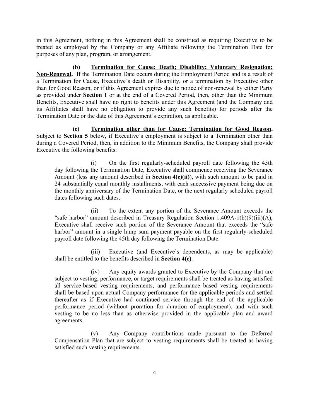 4 in this Agreement, nothing in this Agreement shall be construed as requiring Executive to be treated as employed by the Company or any Affiliate following the Termination Date for purposes of any plan, program, or arrangement. (b) Termination for Cause; Death; Disability; Voluntary Resignation; Non-Renewal. If the Termination Date occurs during the Employment Period and is a result of a Termination for Cause, Executive’s death or Disability, or a termination by Executive other than for Good Reason, or if this Agreement expires due to notice of non-renewal by either Party as provided under Section 1 or at the end of a Covered Period, then, other than the Minimum Benefits, Executive shall have no right to benefits under this Agreement (and the Company and its Affiliates shall have no obligation to provide any such benefits) for periods after the Termination Date or the date of this Agreement’s expiration, as applicable. (c) Termination other than for Cause; Termination for Good Reason. Subject to Section 5 below, if Executive’s employment is subject to a Termination other than during a Covered Period, then, in addition to the Minimum Benefits, the Company shall provide Executive the following benefits: (i) On the first regularly-scheduled payroll date following the 45th day following the Termination Date, Executive shall commence receiving the Severance Amount (less any amount described in Section 4(c)(ii)), with such amount to be paid in 24 substantially equal monthly installments, with each successive payment being due on the monthly anniversary of the Termination Date, or the next regularly scheduled payroll dates following such dates. (ii) To the extent any portion of the Severance Amount exceeds the “safe harbor” amount described in Treasury Regulation Section 1.409A-1(b)(9)(iii)(A), Executive shall receive such portion of the Severance Amount that exceeds the “safe harbor” amount in a single lump sum payment payable on the first regularly-scheduled payroll date following the 45th day following the Termination Date. (iii) Executive (and Executive’s dependents, as may be applicable) shall be entitled to the benefits described in Section 4(e). (iv) Any equity awards granted to Executive by the Company that are subject to vesting, performance, or target requirements shall be treated as having satisfied all service-based vesting requirements, and performance–based vesting requirements shall be based upon actual Company performance for the applicable periods and settled thereafter as if Executive had continued service through the end of the applicable performance period (without proration for duration of employment), and with such vesting to be no less than as otherwise provided in the applicable plan and award agreements. (v) Any Company contributions made pursuant to the Deferred Compensation Plan that are subject to vesting requirements shall be treated as having satisfied such vesting requirements.