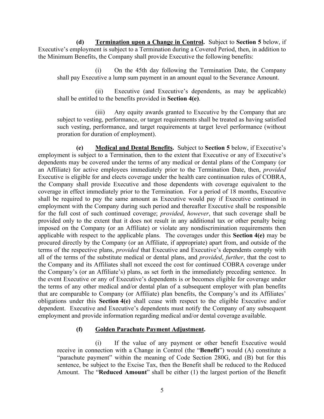 5 (d) Termination upon a Change in Control. Subject to Section 5 below, if Executive’s employment is subject to a Termination during a Covered Period, then, in addition to the Minimum Benefits, the Company shall provide Executive the following benefits: (i) On the 45th day following the Termination Date, the Company shall pay Executive a lump sum payment in an amount equal to the Severance Amount. (ii) Executive (and Executive’s dependents, as may be applicable) shall be entitled to the benefits provided in Section 4(e). (iii) Any equity awards granted to Executive by the Company that are subject to vesting, performance, or target requirements shall be treated as having satisfied such vesting, performance, and target requirements at target level performance (without proration for duration of employment). (e) Medical and Dental Benefits. Subject to Section 5 below, if Executive’s employment is subject to a Termination, then to the extent that Executive or any of Executive’s dependents may be covered under the terms of any medical or dental plans of the Company (or an Affiliate) for active employees immediately prior to the Termination Date, then, provided Executive is eligible for and elects coverage under the health care continuation rules of COBRA, the Company shall provide Executive and those dependents with coverage equivalent to the coverage in effect immediately prior to the Termination. For a period of 18 months, Executive shall be required to pay the same amount as Executive would pay if Executive continued in employment with the Company during such period and thereafter Executive shall be responsible for the full cost of such continued coverage; provided, however, that such coverage shall be provided only to the extent that it does not result in any additional tax or other penalty being imposed on the Company (or an Affiliate) or violate any nondiscrimination requirements then applicable with respect to the applicable plans. The coverages under this Section 4(e) may be procured directly by the Company (or an Affiliate, if appropriate) apart from, and outside of the terms of the respective plans, provided that Executive and Executive’s dependents comply with all of the terms of the substitute medical or dental plans, and provided, further, that the cost to the Company and its Affiliates shall not exceed the cost for continued COBRA coverage under the Company’s (or an Affiliate’s) plans, as set forth in the immediately preceding sentence. In the event Executive or any of Executive’s dependents is or becomes eligible for coverage under the terms of any other medical and/or dental plan of a subsequent employer with plan benefits that are comparable to Company (or Affiliate) plan benefits, the Company’s and its Affiliates’ obligations under this Section 4(e) shall cease with respect to the eligible Executive and/or dependent. Executive and Executive’s dependents must notify the Company of any subsequent employment and provide information regarding medical and/or dental coverage available. (f) Golden Parachute Payment Adjustment. (i) If the value of any payment or other benefit Executive would receive in connection with a Change in Control (the “Benefit”) would (A) constitute a “parachute payment” within the meaning of Code Section 280G, and (B) but for this sentence, be subject to the Excise Tax, then the Benefit shall be reduced to the Reduced Amount. The “Reduced Amount” shall be either (1) the largest portion of the Benefit