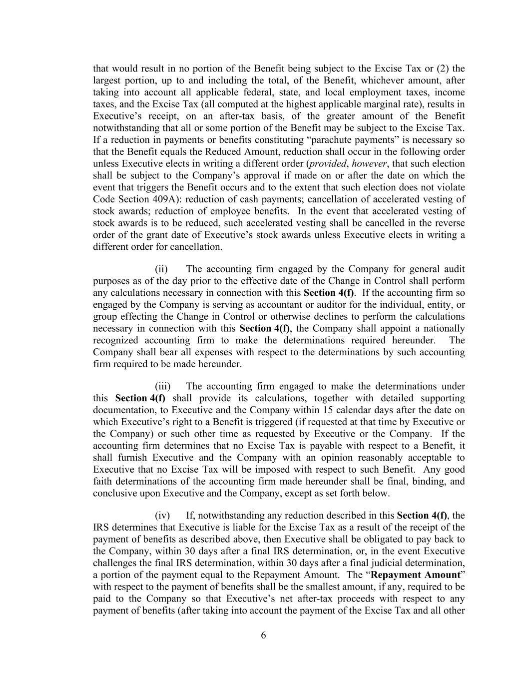 6 that would result in no portion of the Benefit being subject to the Excise Tax or (2) the largest portion, up to and including the total, of the Benefit, whichever amount, after taking into account all applicable federal, state, and local employment taxes, income taxes, and the Excise Tax (all computed at the highest applicable marginal rate), results in Executive’s receipt, on an after-tax basis, of the greater amount of the Benefit notwithstanding that all or some portion of the Benefit may be subject to the Excise Tax. If a reduction in payments or benefits constituting “parachute payments” is necessary so that the Benefit equals the Reduced Amount, reduction shall occur in the following order unless Executive elects in writing a different order (provided, however, that such election shall be subject to the Company’s approval if made on or after the date on which the event that triggers the Benefit occurs and to the extent that such election does not violate Code Section 409A): reduction of cash payments; cancellation of accelerated vesting of stock awards; reduction of employee benefits. In the event that accelerated vesting of stock awards is to be reduced, such accelerated vesting shall be cancelled in the reverse order of the grant date of Executive’s stock awards unless Executive elects in writing a different order for cancellation. (ii) The accounting firm engaged by the Company for general audit purposes as of the day prior to the effective date of the Change in Control shall perform any calculations necessary in connection with this Section 4(f). If the accounting firm so engaged by the Company is serving as accountant or auditor for the individual, entity, or group effecting the Change in Control or otherwise declines to perform the calculations necessary in connection with this Section 4(f), the Company shall appoint a nationally recognized accounting firm to make the determinations required hereunder. The Company shall bear all expenses with respect to the determinations by such accounting firm required to be made hereunder. (iii) The accounting firm engaged to make the determinations under this Section 4(f) shall provide its calculations, together with detailed supporting documentation, to Executive and the Company within 15 calendar days after the date on which Executive’s right to a Benefit is triggered (if requested at that time by Executive or the Company) or such other time as requested by Executive or the Company. If the accounting firm determines that no Excise Tax is payable with respect to a Benefit, it shall furnish Executive and the Company with an opinion reasonably acceptable to Executive that no Excise Tax will be imposed with respect to such Benefit. Any good faith determinations of the accounting firm made hereunder shall be final, binding, and conclusive upon Executive and the Company, except as set forth below. (iv) If, notwithstanding any reduction described in this Section 4(f), the IRS determines that Executive is liable for the Excise Tax as a result of the receipt of the payment of benefits as described above, then Executive shall be obligated to pay back to the Company, within 30 days after a final IRS determination, or, in the event Executive challenges the final IRS determination, within 30 days after a final judicial determination, a portion of the payment equal to the Repayment Amount. The “Repayment Amount” with respect to the payment of benefits shall be the smallest amount, if any, required to be paid to the Company so that Executive’s net after-tax proceeds with respect to any payment of benefits (after taking into account the payment of the Excise Tax and all other