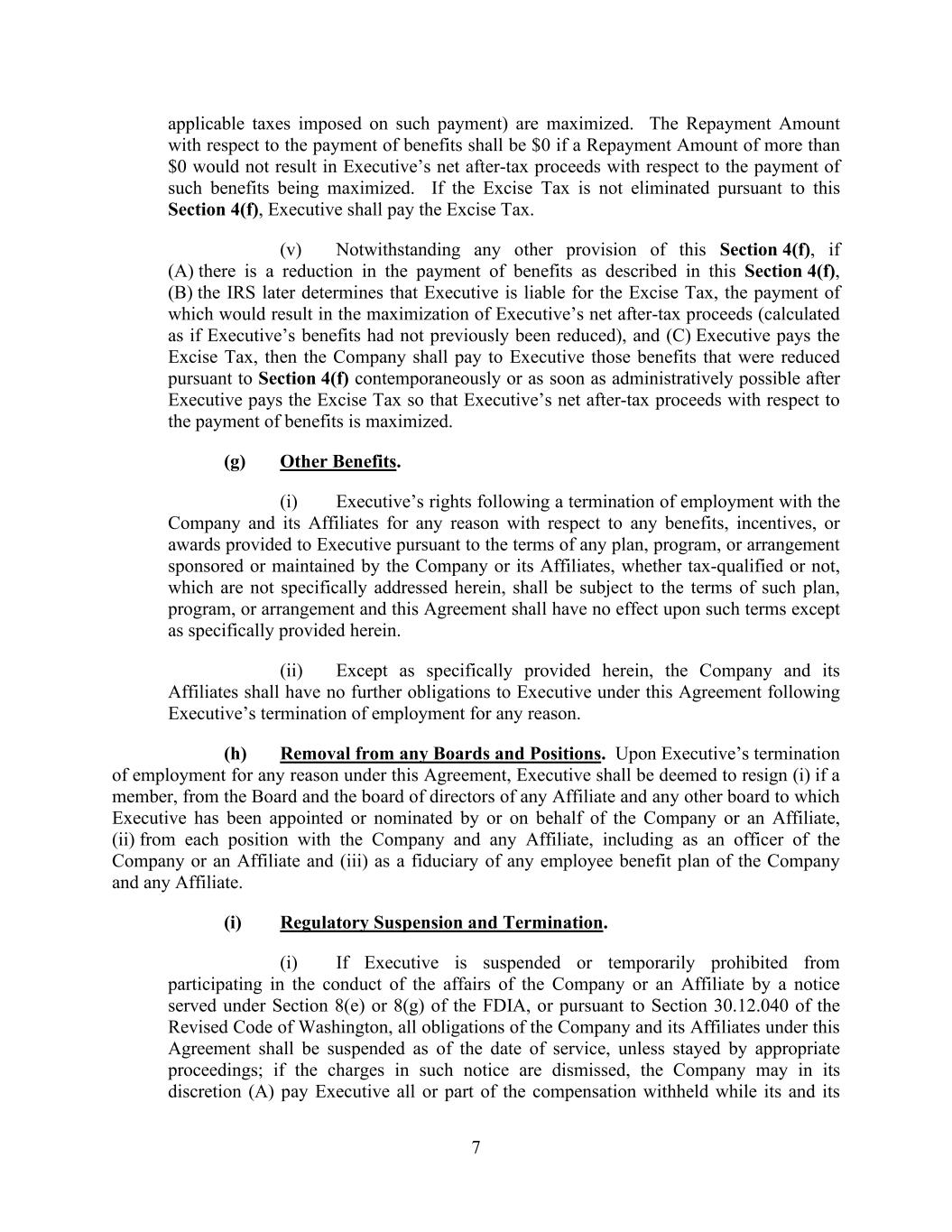 7 applicable taxes imposed on such payment) are maximized. The Repayment Amount with respect to the payment of benefits shall be $0 if a Repayment Amount of more than $0 would not result in Executive’s net after-tax proceeds with respect to the payment of such benefits being maximized. If the Excise Tax is not eliminated pursuant to this Section 4(f), Executive shall pay the Excise Tax. (v) Notwithstanding any other provision of this Section 4(f), if (A) there is a reduction in the payment of benefits as described in this Section 4(f), (B) the IRS later determines that Executive is liable for the Excise Tax, the payment of which would result in the maximization of Executive’s net after-tax proceeds (calculated as if Executive’s benefits had not previously been reduced), and (C) Executive pays the Excise Tax, then the Company shall pay to Executive those benefits that were reduced pursuant to Section 4(f) contemporaneously or as soon as administratively possible after Executive pays the Excise Tax so that Executive’s net after-tax proceeds with respect to the payment of benefits is maximized. (g) Other Benefits. (i) Executive’s rights following a termination of employment with the Company and its Affiliates for any reason with respect to any benefits, incentives, or awards provided to Executive pursuant to the terms of any plan, program, or arrangement sponsored or maintained by the Company or its Affiliates, whether tax-qualified or not, which are not specifically addressed herein, shall be subject to the terms of such plan, program, or arrangement and this Agreement shall have no effect upon such terms except as specifically provided herein. (ii) Except as specifically provided herein, the Company and its Affiliates shall have no further obligations to Executive under this Agreement following Executive’s termination of employment for any reason. (h) Removal from any Boards and Positions. Upon Executive’s termination of employment for any reason under this Agreement, Executive shall be deemed to resign (i) if a member, from the Board and the board of directors of any Affiliate and any other board to which Executive has been appointed or nominated by or on behalf of the Company or an Affiliate, (ii) from each position with the Company and any Affiliate, including as an officer of the Company or an Affiliate and (iii) as a fiduciary of any employee benefit plan of the Company and any Affiliate. (i) Regulatory Suspension and Termination. (i) If Executive is suspended or temporarily prohibited from participating in the conduct of the affairs of the Company or an Affiliate by a notice served under Section 8(e) or 8(g) of the FDIA, or pursuant to Section 30.12.040 of the Revised Code of Washington, all obligations of the Company and its Affiliates under this Agreement shall be suspended as of the date of service, unless stayed by appropriate proceedings; if the charges in such notice are dismissed, the Company may in its discretion (A) pay Executive all or part of the compensation withheld while its and its