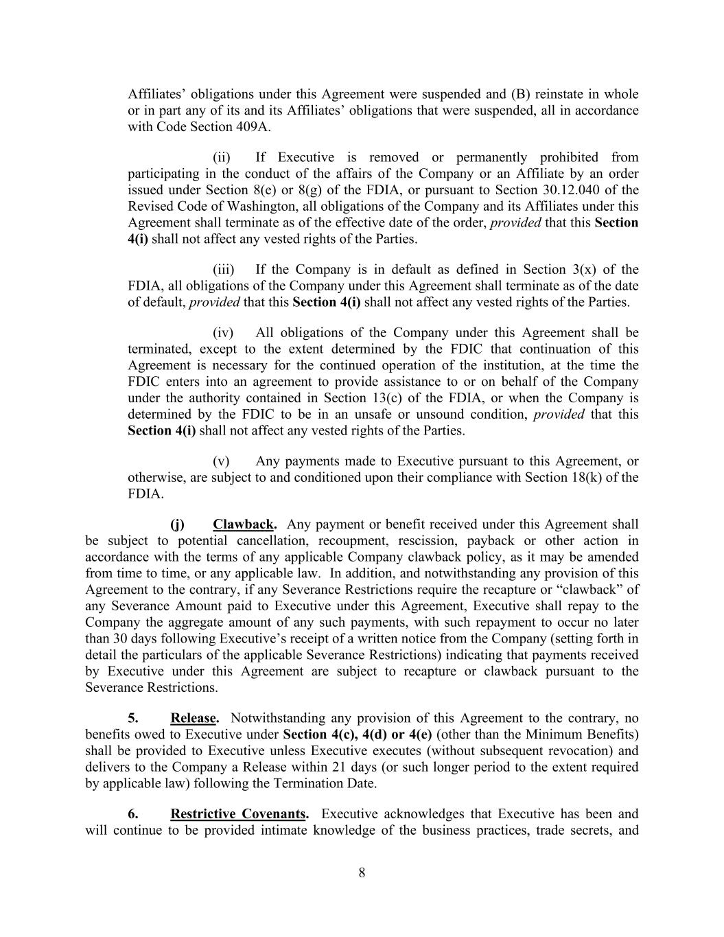8 Affiliates’ obligations under this Agreement were suspended and (B) reinstate in whole or in part any of its and its Affiliates’ obligations that were suspended, all in accordance with Code Section 409A. (ii) If Executive is removed or permanently prohibited from participating in the conduct of the affairs of the Company or an Affiliate by an order issued under Section 8(e) or 8(g) of the FDIA, or pursuant to Section 30.12.040 of the Revised Code of Washington, all obligations of the Company and its Affiliates under this Agreement shall terminate as of the effective date of the order, provided that this Section 4(i) shall not affect any vested rights of the Parties. (iii) If the Company is in default as defined in Section 3(x) of the FDIA, all obligations of the Company under this Agreement shall terminate as of the date of default, provided that this Section 4(i) shall not affect any vested rights of the Parties. (iv) All obligations of the Company under this Agreement shall be terminated, except to the extent determined by the FDIC that continuation of this Agreement is necessary for the continued operation of the institution, at the time the FDIC enters into an agreement to provide assistance to or on behalf of the Company under the authority contained in Section 13(c) of the FDIA, or when the Company is determined by the FDIC to be in an unsafe or unsound condition, provided that this Section 4(i) shall not affect any vested rights of the Parties. (v) Any payments made to Executive pursuant to this Agreement, or otherwise, are subject to and conditioned upon their compliance with Section 18(k) of the FDIA. (j) Clawback. Any payment or benefit received under this Agreement shall be subject to potential cancellation, recoupment, rescission, payback or other action in accordance with the terms of any applicable Company clawback policy, as it may be amended from time to time, or any applicable law. In addition, and notwithstanding any provision of this Agreement to the contrary, if any Severance Restrictions require the recapture or “clawback” of any Severance Amount paid to Executive under this Agreement, Executive shall repay to the Company the aggregate amount of any such payments, with such repayment to occur no later than 30 days following Executive’s receipt of a written notice from the Company (setting forth in detail the particulars of the applicable Severance Restrictions) indicating that payments received by Executive under this Agreement are subject to recapture or clawback pursuant to the Severance Restrictions. 5. Release. Notwithstanding any provision of this Agreement to the contrary, no benefits owed to Executive under Section 4(c), 4(d) or 4(e) (other than the Minimum Benefits) shall be provided to Executive unless Executive executes (without subsequent revocation) and delivers to the Company a Release within 21 days (or such longer period to the extent required by applicable law) following the Termination Date. 6. Restrictive Covenants. Executive acknowledges that Executive has been and will continue to be provided intimate knowledge of the business practices, trade secrets, and