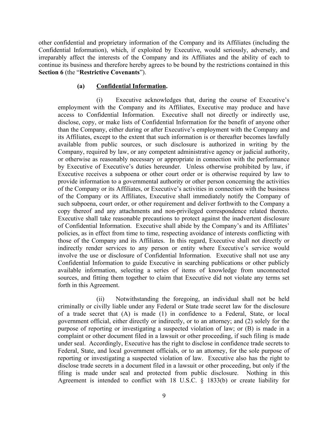 9 other confidential and proprietary information of the Company and its Affiliates (including the Confidential Information), which, if exploited by Executive, would seriously, adversely, and irreparably affect the interests of the Company and its Affiliates and the ability of each to continue its business and therefore hereby agrees to be bound by the restrictions contained in this Section 6 (the “Restrictive Covenants”). (a) Confidential Information. (i) Executive acknowledges that, during the course of Executive’s employment with the Company and its Affiliates, Executive may produce and have access to Confidential Information. Executive shall not directly or indirectly use, disclose, copy, or make lists of Confidential Information for the benefit of anyone other than the Company, either during or after Executive’s employment with the Company and its Affiliates, except to the extent that such information is or thereafter becomes lawfully available from public sources, or such disclosure is authorized in writing by the Company, required by law, or any competent administrative agency or judicial authority, or otherwise as reasonably necessary or appropriate in connection with the performance by Executive of Executive’s duties hereunder. Unless otherwise prohibited by law, if Executive receives a subpoena or other court order or is otherwise required by law to provide information to a governmental authority or other person concerning the activities of the Company or its Affiliates, or Executive’s activities in connection with the business of the Company or its Affiliates, Executive shall immediately notify the Company of such subpoena, court order, or other requirement and deliver forthwith to the Company a copy thereof and any attachments and non-privileged correspondence related thereto. Executive shall take reasonable precautions to protect against the inadvertent disclosure of Confidential Information. Executive shall abide by the Company’s and its Affiliates’ policies, as in effect from time to time, respecting avoidance of interests conflicting with those of the Company and its Affiliates. In this regard, Executive shall not directly or indirectly render services to any person or entity where Executive’s service would involve the use or disclosure of Confidential Information. Executive shall not use any Confidential Information to guide Executive in searching publications or other publicly available information, selecting a series of items of knowledge from unconnected sources, and fitting them together to claim that Executive did not violate any terms set forth in this Agreement. (ii) Notwithstanding the foregoing, an individual shall not be held criminally or civilly liable under any Federal or State trade secret law for the disclosure of a trade secret that (A) is made (1) in confidence to a Federal, State, or local government official, either directly or indirectly, or to an attorney; and (2) solely for the purpose of reporting or investigating a suspected violation of law; or (B) is made in a complaint or other document filed in a lawsuit or other proceeding, if such filing is made under seal. Accordingly, Executive has the right to disclose in confidence trade secrets to Federal, State, and local government officials, or to an attorney, for the sole purpose of reporting or investigating a suspected violation of law. Executive also has the right to disclose trade secrets in a document filed in a lawsuit or other proceeding, but only if the filing is made under seal and protected from public disclosure. Nothing in this Agreement is intended to conflict with 18 U.S.C. § 1833(b) or create liability for