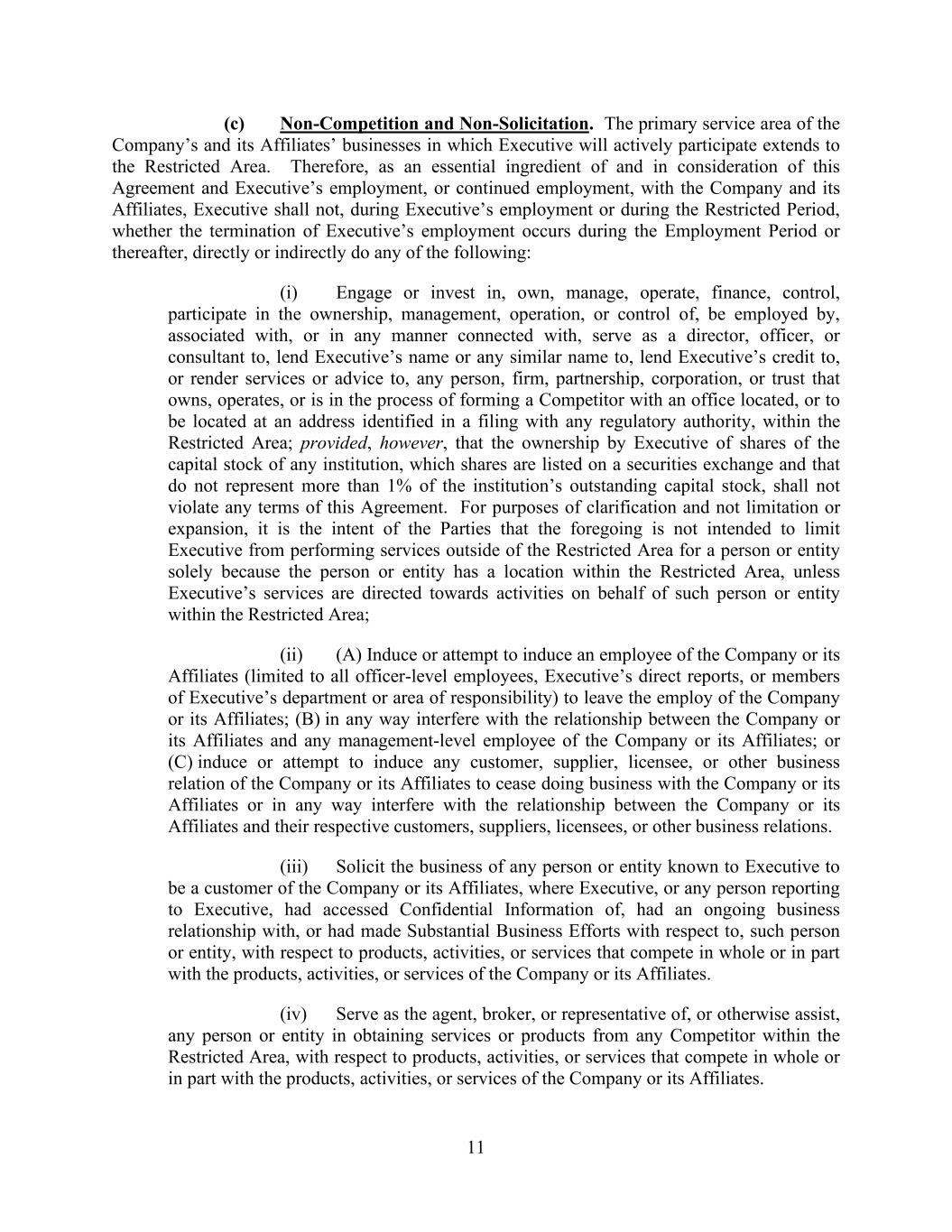 11 (c) Non-Competition and Non-Solicitation. The primary service area of the Company’s and its Affiliates’ businesses in which Executive will actively participate extends to the Restricted Area. Therefore, as an essential ingredient of and in consideration of this Agreement and Executive’s employment, or continued employment, with the Company and its Affiliates, Executive shall not, during Executive’s employment or during the Restricted Period, whether the termination of Executive’s employment occurs during the Employment Period or thereafter, directly or indirectly do any of the following: (i) Engage or invest in, own, manage, operate, finance, control, participate in the ownership, management, operation, or control of, be employed by, associated with, or in any manner connected with, serve as a director, officer, or consultant to, lend Executive’s name or any similar name to, lend Executive’s credit to, or render services or advice to, any person, firm, partnership, corporation, or trust that owns, operates, or is in the process of forming a Competitor with an office located, or to be located at an address identified in a filing with any regulatory authority, within the Restricted Area; provided, however, that the ownership by Executive of shares of the capital stock of any institution, which shares are listed on a securities exchange and that do not represent more than 1% of the institution’s outstanding capital stock, shall not violate any terms of this Agreement. For purposes of clarification and not limitation or expansion, it is the intent of the Parties that the foregoing is not intended to limit Executive from performing services outside of the Restricted Area for a person or entity solely because the person or entity has a location within the Restricted Area, unless Executive’s services are directed towards activities on behalf of such person or entity within the Restricted Area; (ii) (A) Induce or attempt to induce an employee of the Company or its Affiliates (limited to all officer-level employees, Executive’s direct reports, or members of Executive’s department or area of responsibility) to leave the employ of the Company or its Affiliates; (B) in any way interfere with the relationship between the Company or its Affiliates and any management-level employee of the Company or its Affiliates; or (C) induce or attempt to induce any customer, supplier, licensee, or other business relation of the Company or its Affiliates to cease doing business with the Company or its Affiliates or in any way interfere with the relationship between the Company or its Affiliates and their respective customers, suppliers, licensees, or other business relations. (iii) Solicit the business of any person or entity known to Executive to be a customer of the Company or its Affiliates, where Executive, or any person reporting to Executive, had accessed Confidential Information of, had an ongoing business relationship with, or had made Substantial Business Efforts with respect to, such person or entity, with respect to products, activities, or services that compete in whole or in part with the products, activities, or services of the Company or its Affiliates. (iv) Serve as the agent, broker, or representative of, or otherwise assist, any person or entity in obtaining services or products from any Competitor within the Restricted Area, with respect to products, activities, or services that compete in whole or in part with the products, activities, or services of the Company or its Affiliates.