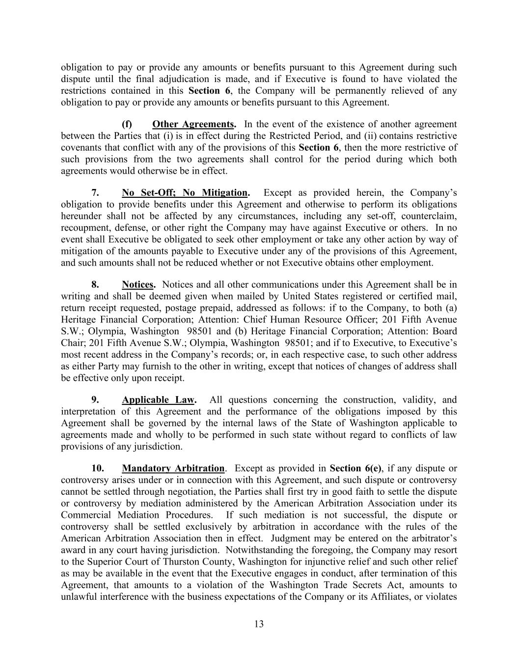 13 obligation to pay or provide any amounts or benefits pursuant to this Agreement during such dispute until the final adjudication is made, and if Executive is found to have violated the restrictions contained in this Section 6, the Company will be permanently relieved of any obligation to pay or provide any amounts or benefits pursuant to this Agreement. (f) Other Agreements. In the event of the existence of another agreement between the Parties that (i) is in effect during the Restricted Period, and (ii) contains restrictive covenants that conflict with any of the provisions of this Section 6, then the more restrictive of such provisions from the two agreements shall control for the period during which both agreements would otherwise be in effect. 7. No Set-Off; No Mitigation. Except as provided herein, the Company’s obligation to provide benefits under this Agreement and otherwise to perform its obligations hereunder shall not be affected by any circumstances, including any set-off, counterclaim, recoupment, defense, or other right the Company may have against Executive or others. In no event shall Executive be obligated to seek other employment or take any other action by way of mitigation of the amounts payable to Executive under any of the provisions of this Agreement, and such amounts shall not be reduced whether or not Executive obtains other employment. 8. Notices. Notices and all other communications under this Agreement shall be in writing and shall be deemed given when mailed by United States registered or certified mail, return receipt requested, postage prepaid, addressed as follows: if to the Company, to both (a) Heritage Financial Corporation; Attention: Chief Human Resource Officer; 201 Fifth Avenue S.W.; Olympia, Washington 98501 and (b) Heritage Financial Corporation; Attention: Board Chair; 201 Fifth Avenue S.W.; Olympia, Washington 98501; and if to Executive, to Executive’s most recent address in the Company’s records; or, in each respective case, to such other address as either Party may furnish to the other in writing, except that notices of changes of address shall be effective only upon receipt. 9. Applicable Law. All questions concerning the construction, validity, and interpretation of this Agreement and the performance of the obligations imposed by this Agreement shall be governed by the internal laws of the State of Washington applicable to agreements made and wholly to be performed in such state without regard to conflicts of law provisions of any jurisdiction. 10. Mandatory Arbitration. Except as provided in Section 6(e), if any dispute or controversy arises under or in connection with this Agreement, and such dispute or controversy cannot be settled through negotiation, the Parties shall first try in good faith to settle the dispute or controversy by mediation administered by the American Arbitration Association under its Commercial Mediation Procedures. If such mediation is not successful, the dispute or controversy shall be settled exclusively by arbitration in accordance with the rules of the American Arbitration Association then in effect. Judgment may be entered on the arbitrator’s award in any court having jurisdiction. Notwithstanding the foregoing, the Company may resort to the Superior Court of Thurston County, Washington for injunctive relief and such other relief as may be available in the event that the Executive engages in conduct, after termination of this Agreement, that amounts to a violation of the Washington Trade Secrets Act, amounts to unlawful interference with the business expectations of the Company or its Affiliates, or violates