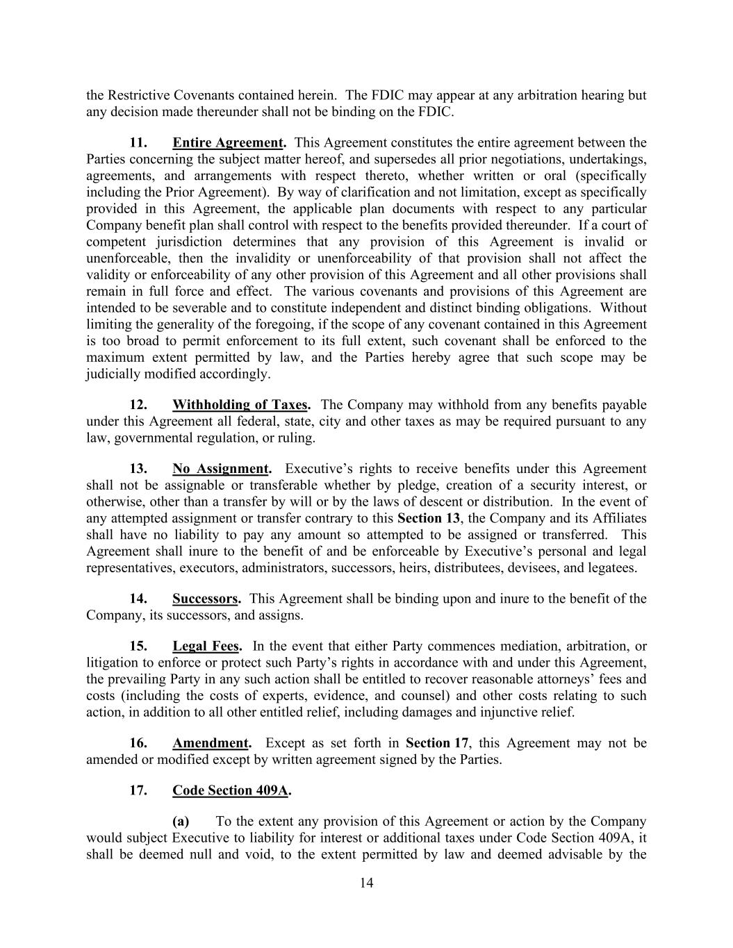 14 the Restrictive Covenants contained herein. The FDIC may appear at any arbitration hearing but any decision made thereunder shall not be binding on the FDIC. 11. Entire Agreement. This Agreement constitutes the entire agreement between the Parties concerning the subject matter hereof, and supersedes all prior negotiations, undertakings, agreements, and arrangements with respect thereto, whether written or oral (specifically including the Prior Agreement). By way of clarification and not limitation, except as specifically provided in this Agreement, the applicable plan documents with respect to any particular Company benefit plan shall control with respect to the benefits provided thereunder. If a court of competent jurisdiction determines that any provision of this Agreement is invalid or unenforceable, then the invalidity or unenforceability of that provision shall not affect the validity or enforceability of any other provision of this Agreement and all other provisions shall remain in full force and effect. The various covenants and provisions of this Agreement are intended to be severable and to constitute independent and distinct binding obligations. Without limiting the generality of the foregoing, if the scope of any covenant contained in this Agreement is too broad to permit enforcement to its full extent, such covenant shall be enforced to the maximum extent permitted by law, and the Parties hereby agree that such scope may be judicially modified accordingly. 12. Withholding of Taxes. The Company may withhold from any benefits payable under this Agreement all federal, state, city and other taxes as may be required pursuant to any law, governmental regulation, or ruling. 13. No Assignment. Executive’s rights to receive benefits under this Agreement shall not be assignable or transferable whether by pledge, creation of a security interest, or otherwise, other than a transfer by will or by the laws of descent or distribution. In the event of any attempted assignment or transfer contrary to this Section 13, the Company and its Affiliates shall have no liability to pay any amount so attempted to be assigned or transferred. This Agreement shall inure to the benefit of and be enforceable by Executive’s personal and legal representatives, executors, administrators, successors, heirs, distributees, devisees, and legatees. 14. Successors. This Agreement shall be binding upon and inure to the benefit of the Company, its successors, and assigns. 15. Legal Fees. In the event that either Party commences mediation, arbitration, or litigation to enforce or protect such Party’s rights in accordance with and under this Agreement, the prevailing Party in any such action shall be entitled to recover reasonable attorneys’ fees and costs (including the costs of experts, evidence, and counsel) and other costs relating to such action, in addition to all other entitled relief, including damages and injunctive relief. 16. Amendment. Except as set forth in Section 17, this Agreement may not be amended or modified except by written agreement signed by the Parties. 17. Code Section 409A. (a) To the extent any provision of this Agreement or action by the Company would subject Executive to liability for interest or additional taxes under Code Section 409A, it shall be deemed null and void, to the extent permitted by law and deemed advisable by the