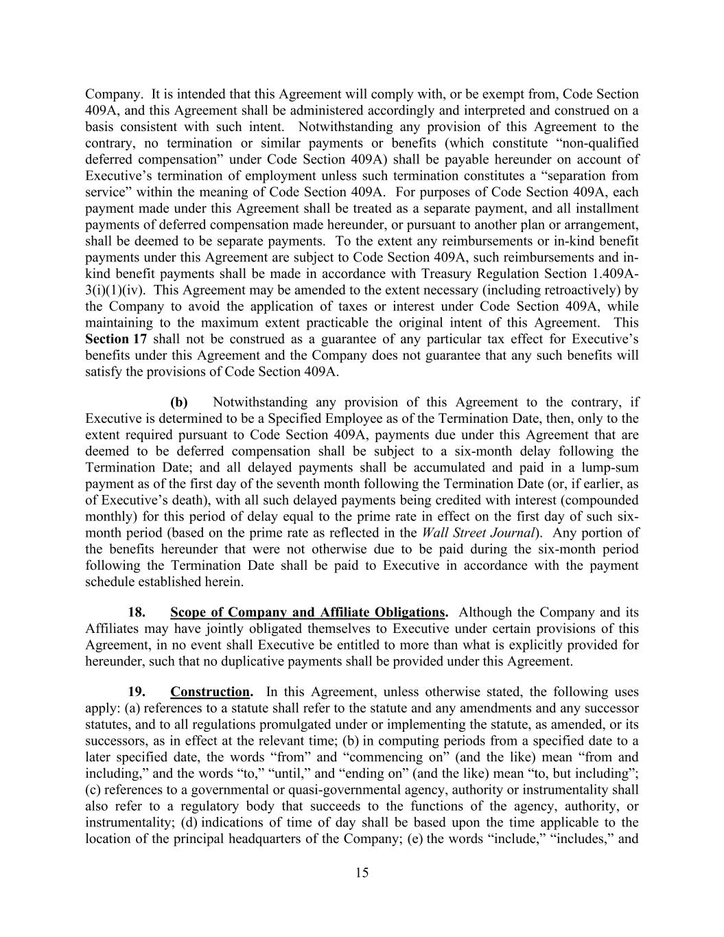 15 Company. It is intended that this Agreement will comply with, or be exempt from, Code Section 409A, and this Agreement shall be administered accordingly and interpreted and construed on a basis consistent with such intent. Notwithstanding any provision of this Agreement to the contrary, no termination or similar payments or benefits (which constitute “non-qualified deferred compensation” under Code Section 409A) shall be payable hereunder on account of Executive’s termination of employment unless such termination constitutes a “separation from service” within the meaning of Code Section 409A. For purposes of Code Section 409A, each payment made under this Agreement shall be treated as a separate payment, and all installment payments of deferred compensation made hereunder, or pursuant to another plan or arrangement, shall be deemed to be separate payments. To the extent any reimbursements or in-kind benefit payments under this Agreement are subject to Code Section 409A, such reimbursements and in- kind benefit payments shall be made in accordance with Treasury Regulation Section 1.409A- 3(i)(1)(iv). This Agreement may be amended to the extent necessary (including retroactively) by the Company to avoid the application of taxes or interest under Code Section 409A, while maintaining to the maximum extent practicable the original intent of this Agreement. This Section 17 shall not be construed as a guarantee of any particular tax effect for Executive’s benefits under this Agreement and the Company does not guarantee that any such benefits will satisfy the provisions of Code Section 409A. (b) Notwithstanding any provision of this Agreement to the contrary, if Executive is determined to be a Specified Employee as of the Termination Date, then, only to the extent required pursuant to Code Section 409A, payments due under this Agreement that are deemed to be deferred compensation shall be subject to a six-month delay following the Termination Date; and all delayed payments shall be accumulated and paid in a lump-sum payment as of the first day of the seventh month following the Termination Date (or, if earlier, as of Executive’s death), with all such delayed payments being credited with interest (compounded monthly) for this period of delay equal to the prime rate in effect on the first day of such six- month period (based on the prime rate as reflected in the Wall Street Journal). Any portion of the benefits hereunder that were not otherwise due to be paid during the six-month period following the Termination Date shall be paid to Executive in accordance with the payment schedule established herein. 18. Scope of Company and Affiliate Obligations. Although the Company and its Affiliates may have jointly obligated themselves to Executive under certain provisions of this Agreement, in no event shall Executive be entitled to more than what is explicitly provided for hereunder, such that no duplicative payments shall be provided under this Agreement. 19. Construction. In this Agreement, unless otherwise stated, the following uses apply: (a) references to a statute shall refer to the statute and any amendments and any successor statutes, and to all regulations promulgated under or implementing the statute, as amended, or its successors, as in effect at the relevant time; (b) in computing periods from a specified date to a later specified date, the words “from” and “commencing on” (and the like) mean “from and including,” and the words “to,” “until,” and “ending on” (and the like) mean “to, but including”; (c) references to a governmental or quasi-governmental agency, authority or instrumentality shall also refer to a regulatory body that succeeds to the functions of the agency, authority, or instrumentality; (d) indications of time of day shall be based upon the time applicable to the location of the principal headquarters of the Company; (e) the words “include,” “includes,” and