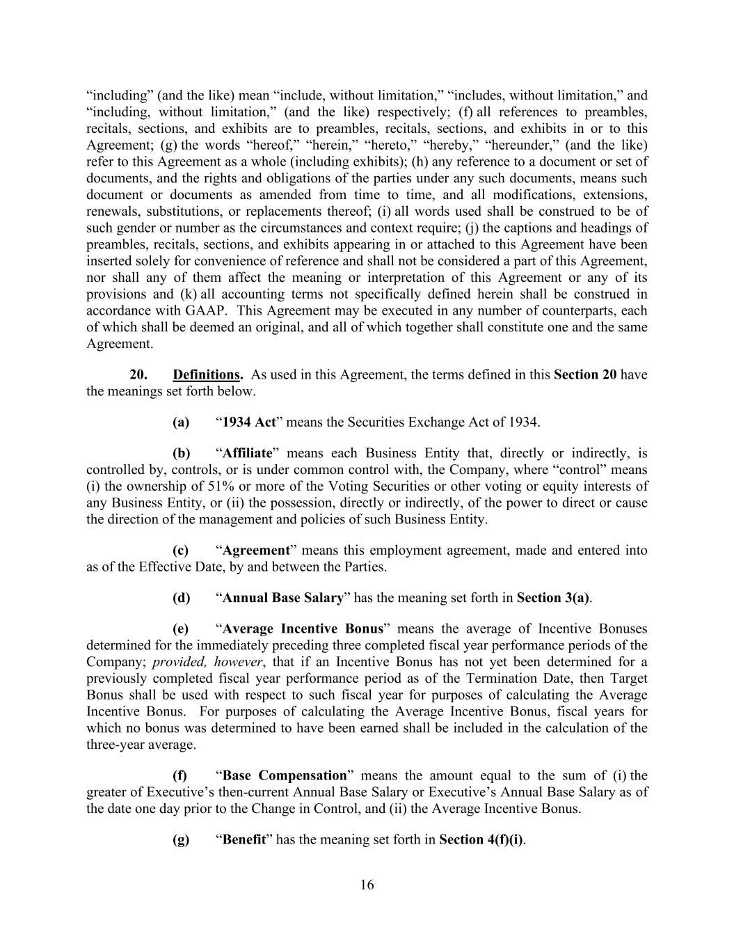 16 “including” (and the like) mean “include, without limitation,” “includes, without limitation,” and “including, without limitation,” (and the like) respectively; (f) all references to preambles, recitals, sections, and exhibits are to preambles, recitals, sections, and exhibits in or to this Agreement; (g) the words “hereof,” “herein,” “hereto,” “hereby,” “hereunder,” (and the like) refer to this Agreement as a whole (including exhibits); (h) any reference to a document or set of documents, and the rights and obligations of the parties under any such documents, means such document or documents as amended from time to time, and all modifications, extensions, renewals, substitutions, or replacements thereof; (i) all words used shall be construed to be of such gender or number as the circumstances and context require; (j) the captions and headings of preambles, recitals, sections, and exhibits appearing in or attached to this Agreement have been inserted solely for convenience of reference and shall not be considered a part of this Agreement, nor shall any of them affect the meaning or interpretation of this Agreement or any of its provisions and (k) all accounting terms not specifically defined herein shall be construed in accordance with GAAP. This Agreement may be executed in any number of counterparts, each of which shall be deemed an original, and all of which together shall constitute one and the same Agreement. 20. Definitions. As used in this Agreement, the terms defined in this Section 20 have the meanings set forth below. (a) “1934 Act” means the Securities Exchange Act of 1934. (b) “Affiliate” means each Business Entity that, directly or indirectly, is controlled by, controls, or is under common control with, the Company, where “control” means (i) the ownership of 51% or more of the Voting Securities or other voting or equity interests of any Business Entity, or (ii) the possession, directly or indirectly, of the power to direct or cause the direction of the management and policies of such Business Entity. (c) “Agreement” means this employment agreement, made and entered into as of the Effective Date, by and between the Parties. (d) “Annual Base Salary” has the meaning set forth in Section 3(a). (e) “Average Incentive Bonus” means the average of Incentive Bonuses determined for the immediately preceding three completed fiscal year performance periods of the Company; provided, however, that if an Incentive Bonus has not yet been determined for a previously completed fiscal year performance period as of the Termination Date, then Target Bonus shall be used with respect to such fiscal year for purposes of calculating the Average Incentive Bonus. For purposes of calculating the Average Incentive Bonus, fiscal years for which no bonus was determined to have been earned shall be included in the calculation of the three-year average. (f) “Base Compensation” means the amount equal to the sum of (i) the greater of Executive’s then-current Annual Base Salary or Executive’s Annual Base Salary as of the date one day prior to the Change in Control, and (ii) the Average Incentive Bonus. (g) “Benefit” has the meaning set forth in Section 4(f)(i).