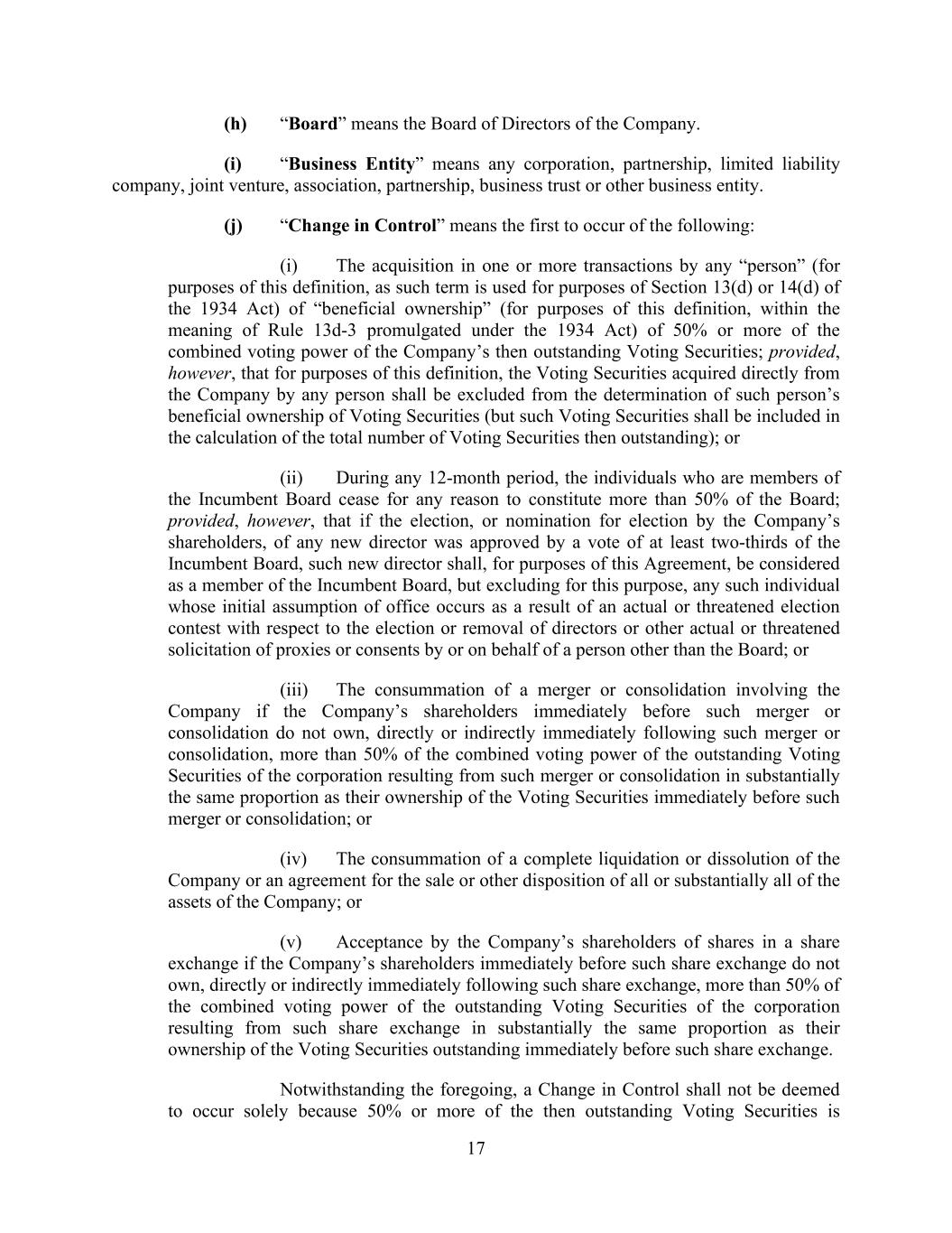 17 (h) “Board” means the Board of Directors of the Company. (i) “Business Entity” means any corporation, partnership, limited liability company, joint venture, association, partnership, business trust or other business entity. (j) “Change in Control” means the first to occur of the following: (i) The acquisition in one or more transactions by any “person” (for purposes of this definition, as such term is used for purposes of Section 13(d) or 14(d) of the 1934 Act) of “beneficial ownership” (for purposes of this definition, within the meaning of Rule 13d-3 promulgated under the 1934 Act) of 50% or more of the combined voting power of the Company’s then outstanding Voting Securities; provided, however, that for purposes of this definition, the Voting Securities acquired directly from the Company by any person shall be excluded from the determination of such person’s beneficial ownership of Voting Securities (but such Voting Securities shall be included in the calculation of the total number of Voting Securities then outstanding); or (ii) During any 12-month period, the individuals who are members of the Incumbent Board cease for any reason to constitute more than 50% of the Board; provided, however, that if the election, or nomination for election by the Company’s shareholders, of any new director was approved by a vote of at least two-thirds of the Incumbent Board, such new director shall, for purposes of this Agreement, be considered as a member of the Incumbent Board, but excluding for this purpose, any such individual whose initial assumption of office occurs as a result of an actual or threatened election contest with respect to the election or removal of directors or other actual or threatened solicitation of proxies or consents by or on behalf of a person other than the Board; or (iii) The consummation of a merger or consolidation involving the Company if the Company’s shareholders immediately before such merger or consolidation do not own, directly or indirectly immediately following such merger or consolidation, more than 50% of the combined voting power of the outstanding Voting Securities of the corporation resulting from such merger or consolidation in substantially the same proportion as their ownership of the Voting Securities immediately before such merger or consolidation; or (iv) The consummation of a complete liquidation or dissolution of the Company or an agreement for the sale or other disposition of all or substantially all of the assets of the Company; or (v) Acceptance by the Company’s shareholders of shares in a share exchange if the Company’s shareholders immediately before such share exchange do not own, directly or indirectly immediately following such share exchange, more than 50% of the combined voting power of the outstanding Voting Securities of the corporation resulting from such share exchange in substantially the same proportion as their ownership of the Voting Securities outstanding immediately before such share exchange. Notwithstanding the foregoing, a Change in Control shall not be deemed to occur solely because 50% or more of the then outstanding Voting Securities is
