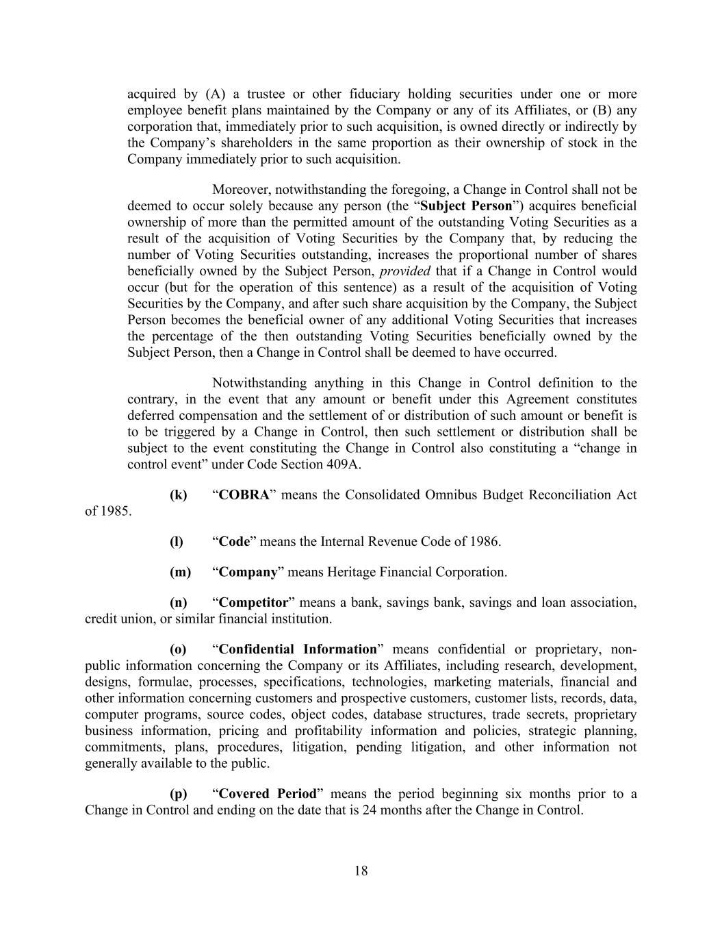 18 acquired by (A) a trustee or other fiduciary holding securities under one or more employee benefit plans maintained by the Company or any of its Affiliates, or (B) any corporation that, immediately prior to such acquisition, is owned directly or indirectly by the Company’s shareholders in the same proportion as their ownership of stock in the Company immediately prior to such acquisition. Moreover, notwithstanding the foregoing, a Change in Control shall not be deemed to occur solely because any person (the “Subject Person”) acquires beneficial ownership of more than the permitted amount of the outstanding Voting Securities as a result of the acquisition of Voting Securities by the Company that, by reducing the number of Voting Securities outstanding, increases the proportional number of shares beneficially owned by the Subject Person, provided that if a Change in Control would occur (but for the operation of this sentence) as a result of the acquisition of Voting Securities by the Company, and after such share acquisition by the Company, the Subject Person becomes the beneficial owner of any additional Voting Securities that increases the percentage of the then outstanding Voting Securities beneficially owned by the Subject Person, then a Change in Control shall be deemed to have occurred. Notwithstanding anything in this Change in Control definition to the contrary, in the event that any amount or benefit under this Agreement constitutes deferred compensation and the settlement of or distribution of such amount or benefit is to be triggered by a Change in Control, then such settlement or distribution shall be subject to the event constituting the Change in Control also constituting a “change in control event” under Code Section 409A. (k) “COBRA” means the Consolidated Omnibus Budget Reconciliation Act of 1985. (l) “Code” means the Internal Revenue Code of 1986. (m) “Company” means Heritage Financial Corporation. (n) “Competitor” means a bank, savings bank, savings and loan association, credit union, or similar financial institution. (o) “Confidential Information” means confidential or proprietary, non- public information concerning the Company or its Affiliates, including research, development, designs, formulae, processes, specifications, technologies, marketing materials, financial and other information concerning customers and prospective customers, customer lists, records, data, computer programs, source codes, object codes, database structures, trade secrets, proprietary business information, pricing and profitability information and policies, strategic planning, commitments, plans, procedures, litigation, pending litigation, and other information not generally available to the public. (p) “Covered Period” means the period beginning six months prior to a Change in Control and ending on the date that is 24 months after the Change in Control.