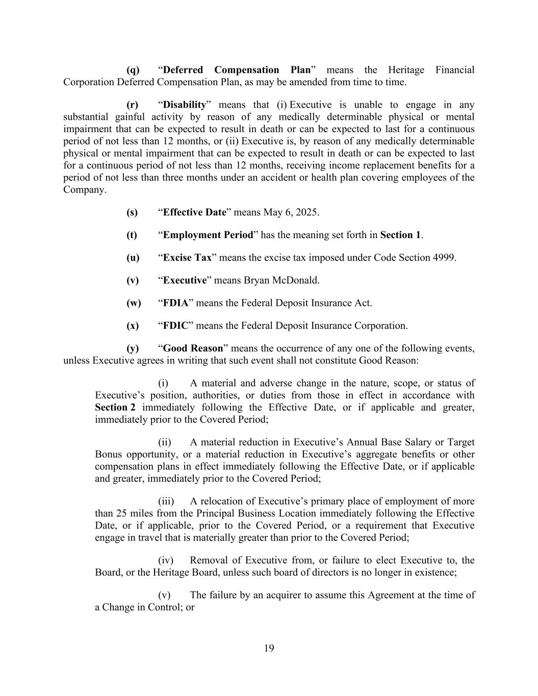 19 (q) “Deferred Compensation Plan” means the Heritage Financial Corporation Deferred Compensation Plan, as may be amended from time to time. (r) “Disability” means that (i) Executive is unable to engage in any substantial gainful activity by reason of any medically determinable physical or mental impairment that can be expected to result in death or can be expected to last for a continuous period of not less than 12 months, or (ii) Executive is, by reason of any medically determinable physical or mental impairment that can be expected to result in death or can be expected to last for a continuous period of not less than 12 months, receiving income replacement benefits for a period of not less than three months under an accident or health plan covering employees of the Company. (s) “Effective Date” means May 6, 2025. (t) “Employment Period” has the meaning set forth in Section 1. (u) “Excise Tax” means the excise tax imposed under Code Section 4999. (v) “Executive” means Bryan McDonald. (w) “FDIA” means the Federal Deposit Insurance Act. (x) “FDIC” means the Federal Deposit Insurance Corporation. (y) “Good Reason” means the occurrence of any one of the following events, unless Executive agrees in writing that such event shall not constitute Good Reason: (i) A material and adverse change in the nature, scope, or status of Executive’s position, authorities, or duties from those in effect in accordance with Section 2 immediately following the Effective Date, or if applicable and greater, immediately prior to the Covered Period; (ii) A material reduction in Executive’s Annual Base Salary or Target Bonus opportunity, or a material reduction in Executive’s aggregate benefits or other compensation plans in effect immediately following the Effective Date, or if applicable and greater, immediately prior to the Covered Period; (iii) A relocation of Executive’s primary place of employment of more than 25 miles from the Principal Business Location immediately following the Effective Date, or if applicable, prior to the Covered Period, or a requirement that Executive engage in travel that is materially greater than prior to the Covered Period; (iv) Removal of Executive from, or failure to elect Executive to, the Board, or the Heritage Board, unless such board of directors is no longer in existence; (v) The failure by an acquirer to assume this Agreement at the time of a Change in Control; or