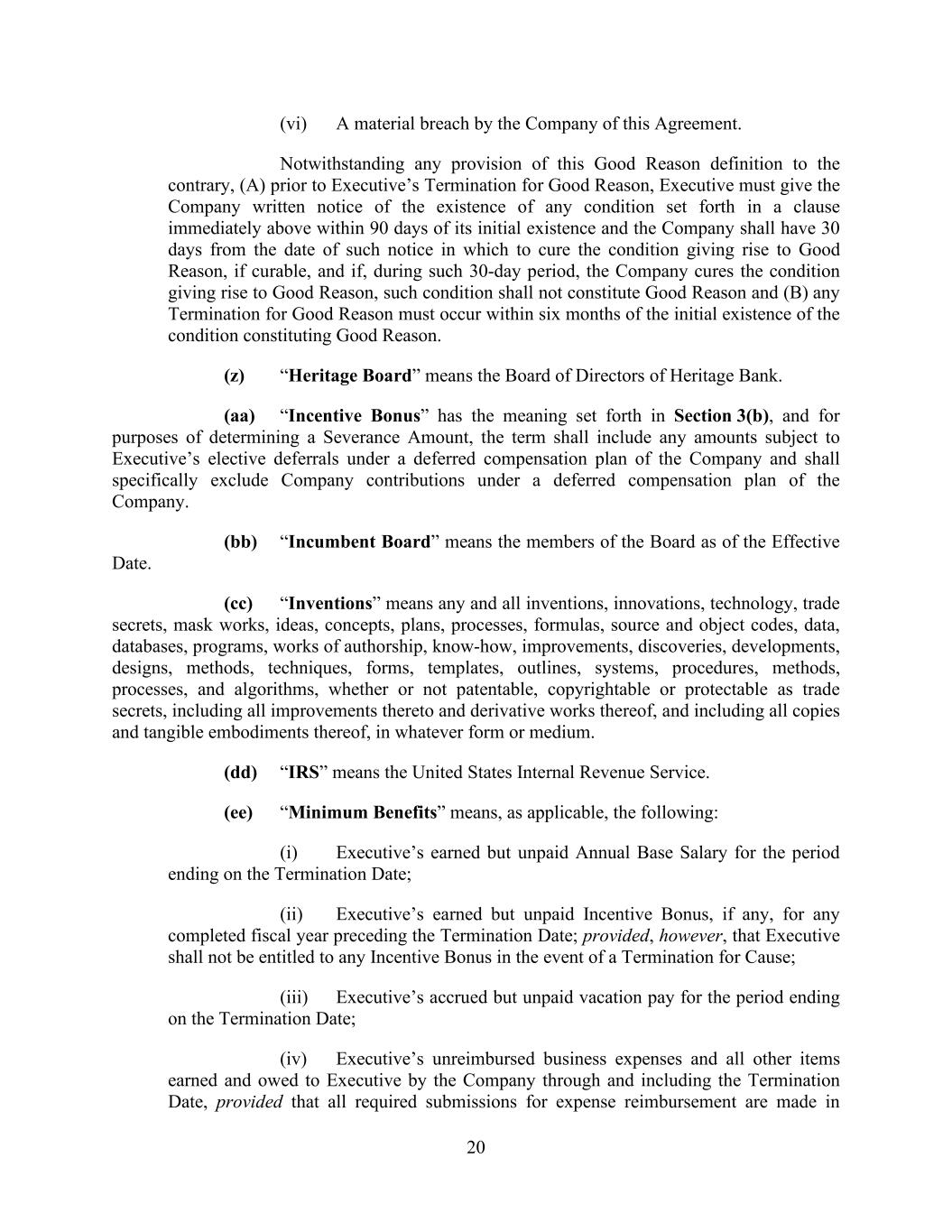 20 (vi) A material breach by the Company of this Agreement. Notwithstanding any provision of this Good Reason definition to the contrary, (A) prior to Executive’s Termination for Good Reason, Executive must give the Company written notice of the existence of any condition set forth in a clause immediately above within 90 days of its initial existence and the Company shall have 30 days from the date of such notice in which to cure the condition giving rise to Good Reason, if curable, and if, during such 30-day period, the Company cures the condition giving rise to Good Reason, such condition shall not constitute Good Reason and (B) any Termination for Good Reason must occur within six months of the initial existence of the condition constituting Good Reason. (z) “Heritage Board” means the Board of Directors of Heritage Bank. (aa) “Incentive Bonus” has the meaning set forth in Section 3(b), and for purposes of determining a Severance Amount, the term shall include any amounts subject to Executive’s elective deferrals under a deferred compensation plan of the Company and shall specifically exclude Company contributions under a deferred compensation plan of the Company. (bb) “Incumbent Board” means the members of the Board as of the Effective Date. (cc) “Inventions” means any and all inventions, innovations, technology, trade secrets, mask works, ideas, concepts, plans, processes, formulas, source and object codes, data, databases, programs, works of authorship, know-how, improvements, discoveries, developments, designs, methods, techniques, forms, templates, outlines, systems, procedures, methods, processes, and algorithms, whether or not patentable, copyrightable or protectable as trade secrets, including all improvements thereto and derivative works thereof, and including all copies and tangible embodiments thereof, in whatever form or medium. (dd) “IRS” means the United States Internal Revenue Service. (ee) “Minimum Benefits” means, as applicable, the following: (i) Executive’s earned but unpaid Annual Base Salary for the period ending on the Termination Date; (ii) Executive’s earned but unpaid Incentive Bonus, if any, for any completed fiscal year preceding the Termination Date; provided, however, that Executive shall not be entitled to any Incentive Bonus in the event of a Termination for Cause; (iii) Executive’s accrued but unpaid vacation pay for the period ending on the Termination Date; (iv) Executive’s unreimbursed business expenses and all other items earned and owed to Executive by the Company through and including the Termination Date, provided that all required submissions for expense reimbursement are made in