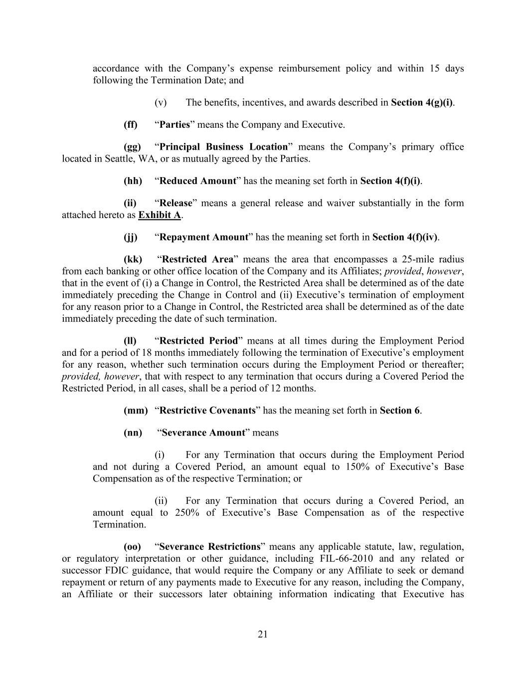 21 accordance with the Company’s expense reimbursement policy and within 15 days following the Termination Date; and (v) The benefits, incentives, and awards described in Section 4(g)(i). (ff) “Parties” means the Company and Executive. (gg) “Principal Business Location” means the Company’s primary office located in Seattle, WA, or as mutually agreed by the Parties. (hh) “Reduced Amount” has the meaning set forth in Section 4(f)(i). (ii) “Release” means a general release and waiver substantially in the form attached hereto as Exhibit A. (jj) “Repayment Amount” has the meaning set forth in Section 4(f)(iv). (kk) “Restricted Area” means the area that encompasses a 25-mile radius from each banking or other office location of the Company and its Affiliates; provided, however, that in the event of (i) a Change in Control, the Restricted Area shall be determined as of the date immediately preceding the Change in Control and (ii) Executive’s termination of employment for any reason prior to a Change in Control, the Restricted area shall be determined as of the date immediately preceding the date of such termination. (ll) “Restricted Period” means at all times during the Employment Period and for a period of 18 months immediately following the termination of Executive’s employment for any reason, whether such termination occurs during the Employment Period or thereafter; provided, however, that with respect to any termination that occurs during a Covered Period the Restricted Period, in all cases, shall be a period of 12 months. (mm) “Restrictive Covenants” has the meaning set forth in Section 6. (nn) “Severance Amount” means (i) For any Termination that occurs during the Employment Period and not during a Covered Period, an amount equal to 150% of Executive’s Base Compensation as of the respective Termination; or (ii) For any Termination that occurs during a Covered Period, an amount equal to 250% of Executive’s Base Compensation as of the respective Termination. (oo) “Severance Restrictions” means any applicable statute, law, regulation, or regulatory interpretation or other guidance, including FIL-66-2010 and any related or successor FDIC guidance, that would require the Company or any Affiliate to seek or demand repayment or return of any payments made to Executive for any reason, including the Company, an Affiliate or their successors later obtaining information indicating that Executive has
