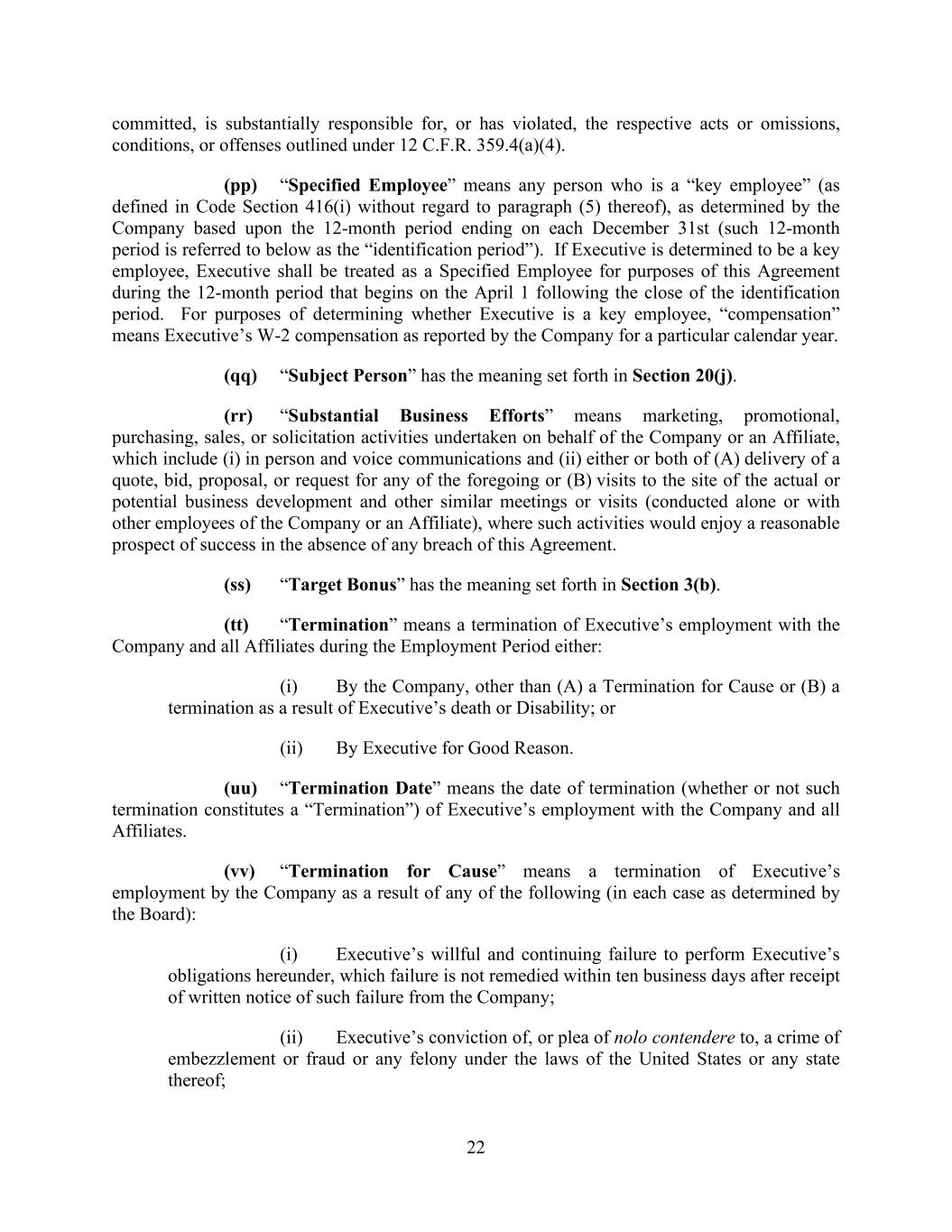 22 committed, is substantially responsible for, or has violated, the respective acts or omissions, conditions, or offenses outlined under 12 C.F.R. 359.4(a)(4). (pp) “Specified Employee” means any person who is a “key employee” (as defined in Code Section 416(i) without regard to paragraph (5) thereof), as determined by the Company based upon the 12-month period ending on each December 31st (such 12-month period is referred to below as the “identification period”). If Executive is determined to be a key employee, Executive shall be treated as a Specified Employee for purposes of this Agreement during the 12-month period that begins on the April 1 following the close of the identification period. For purposes of determining whether Executive is a key employee, “compensation” means Executive’s W-2 compensation as reported by the Company for a particular calendar year. (qq) “Subject Person” has the meaning set forth in Section 20(j). (rr) “Substantial Business Efforts” means marketing, promotional, purchasing, sales, or solicitation activities undertaken on behalf of the Company or an Affiliate, which include (i) in person and voice communications and (ii) either or both of (A) delivery of a quote, bid, proposal, or request for any of the foregoing or (B) visits to the site of the actual or potential business development and other similar meetings or visits (conducted alone or with other employees of the Company or an Affiliate), where such activities would enjoy a reasonable prospect of success in the absence of any breach of this Agreement. (ss) “Target Bonus” has the meaning set forth in Section 3(b). (tt) “Termination” means a termination of Executive’s employment with the Company and all Affiliates during the Employment Period either: (i) By the Company, other than (A) a Termination for Cause or (B) a termination as a result of Executive’s death or Disability; or (ii) By Executive for Good Reason. (uu) “Termination Date” means the date of termination (whether or not such termination constitutes a “Termination”) of Executive’s employment with the Company and all Affiliates. (vv) “Termination for Cause” means a termination of Executive’s employment by the Company as a result of any of the following (in each case as determined by the Board): (i) Executive’s willful and continuing failure to perform Executive’s obligations hereunder, which failure is not remedied within ten business days after receipt of written notice of such failure from the Company; (ii) Executive’s conviction of, or plea of nolo contendere to, a crime of embezzlement or fraud or any felony under the laws of the United States or any state thereof;