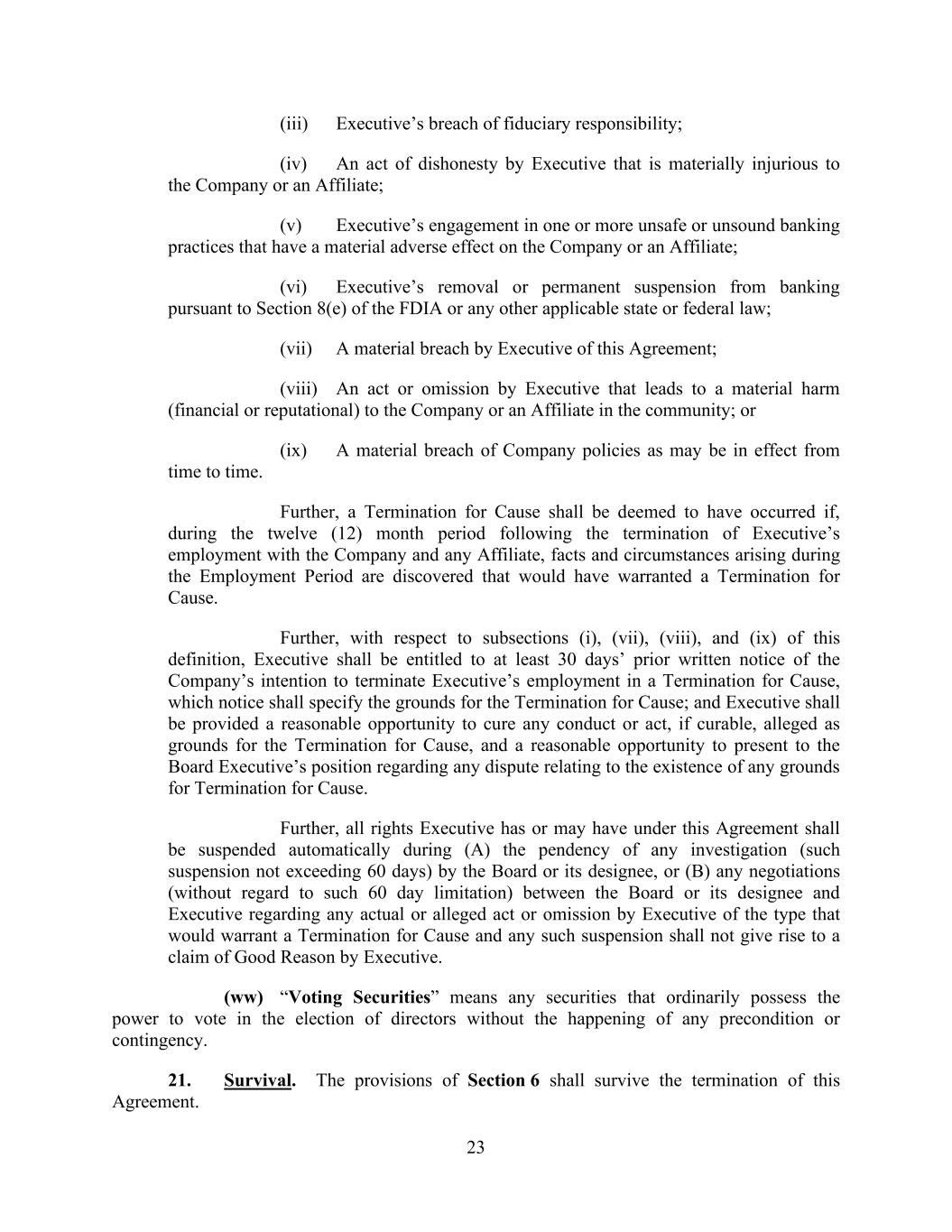 23 (iii) Executive’s breach of fiduciary responsibility; (iv) An act of dishonesty by Executive that is materially injurious to the Company or an Affiliate; (v) Executive’s engagement in one or more unsafe or unsound banking practices that have a material adverse effect on the Company or an Affiliate; (vi) Executive’s removal or permanent suspension from banking pursuant to Section 8(e) of the FDIA or any other applicable state or federal law; (vii) A material breach by Executive of this Agreement; (viii) An act or omission by Executive that leads to a material harm (financial or reputational) to the Company or an Affiliate in the community; or (ix) A material breach of Company policies as may be in effect from time to time. Further, a Termination for Cause shall be deemed to have occurred if, during the twelve (12) month period following the termination of Executive’s employment with the Company and any Affiliate, facts and circumstances arising during the Employment Period are discovered that would have warranted a Termination for Cause. Further, with respect to subsections (i), (vii), (viii), and (ix) of this definition, Executive shall be entitled to at least 30 days’ prior written notice of the Company’s intention to terminate Executive’s employment in a Termination for Cause, which notice shall specify the grounds for the Termination for Cause; and Executive shall be provided a reasonable opportunity to cure any conduct or act, if curable, alleged as grounds for the Termination for Cause, and a reasonable opportunity to present to the Board Executive’s position regarding any dispute relating to the existence of any grounds for Termination for Cause. Further, all rights Executive has or may have under this Agreement shall be suspended automatically during (A) the pendency of any investigation (such suspension not exceeding 60 days) by the Board or its designee, or (B) any negotiations (without regard to such 60 day limitation) between the Board or its designee and Executive regarding any actual or alleged act or omission by Executive of the type that would warrant a Termination for Cause and any such suspension shall not give rise to a claim of Good Reason by Executive. (ww) “Voting Securities” means any securities that ordinarily possess the power to vote in the election of directors without the happening of any precondition or contingency. 21. Survival. The provisions of Section 6 shall survive the termination of this Agreement.