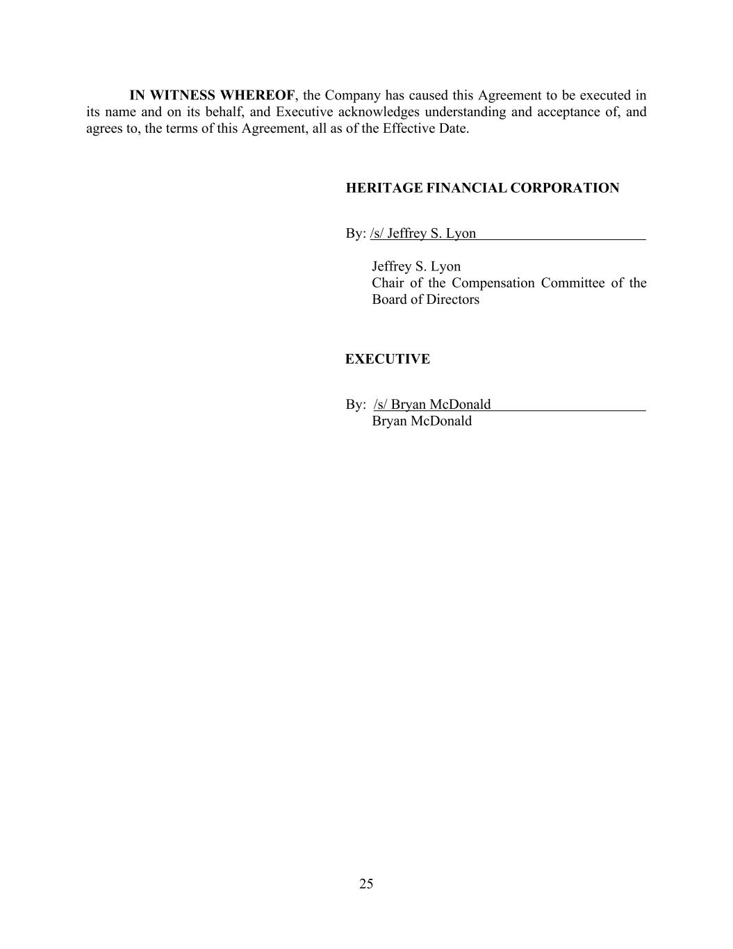 25 IN WITNESS WHEREOF, the Company has caused this Agreement to be executed in its name and on its behalf, and Executive acknowledges understanding and acceptance of, and agrees to, the terms of this Agreement, all as of the Effective Date. HERITAGE FINANCIAL CORPORATION By: /s/ Jeffrey S. Lyon Jeffrey S. Lyon Chair of the Compensation Committee of the Board of Directors EXECUTIVE By: /s/ Bryan McDonald Bryan McDonald