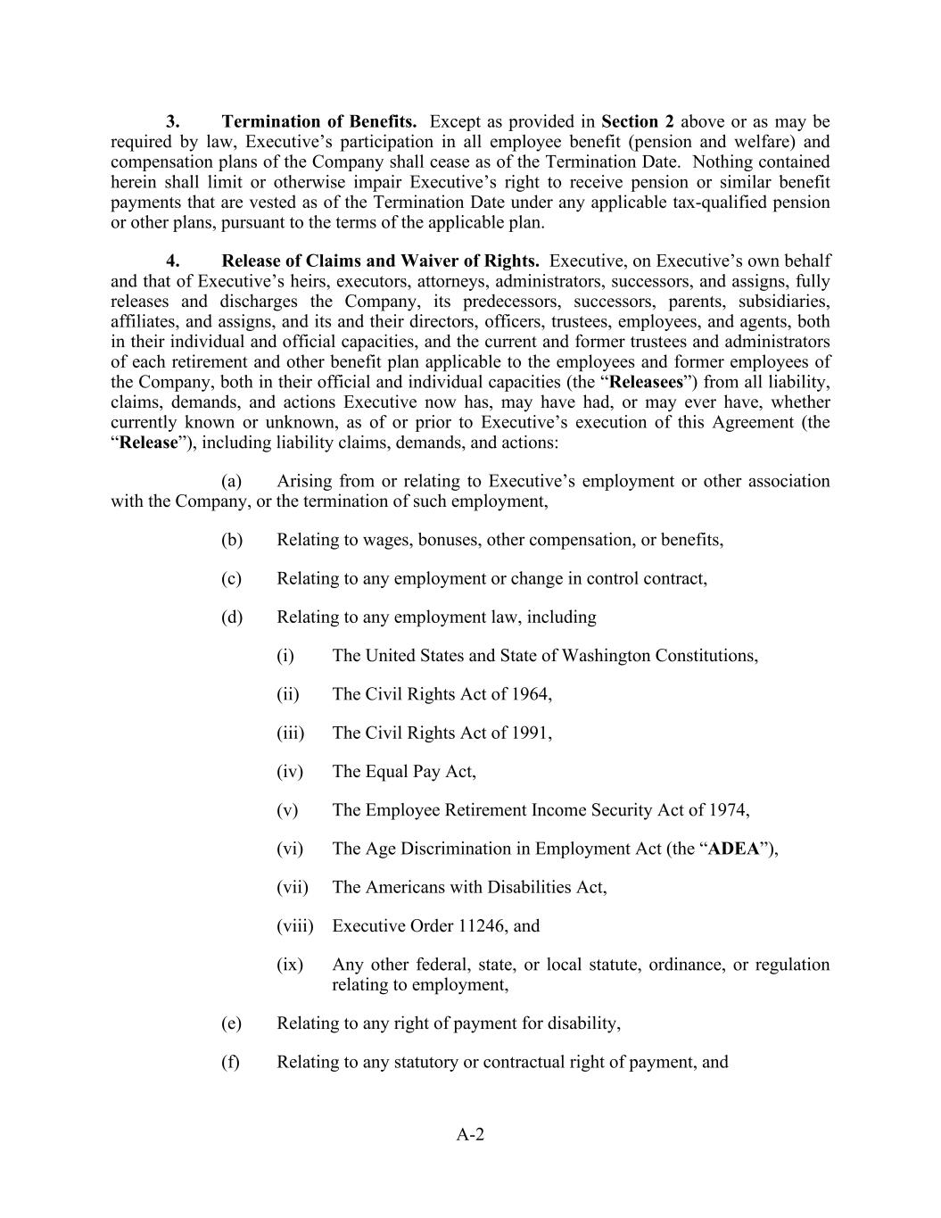 A-2 3. Termination of Benefits. Except as provided in Section 2 above or as may be required by law, Executive’s participation in all employee benefit (pension and welfare) and compensation plans of the Company shall cease as of the Termination Date. Nothing contained herein shall limit or otherwise impair Executive’s right to receive pension or similar benefit payments that are vested as of the Termination Date under any applicable tax-qualified pension or other plans, pursuant to the terms of the applicable plan. 4. Release of Claims and Waiver of Rights. Executive, on Executive’s own behalf and that of Executive’s heirs, executors, attorneys, administrators, successors, and assigns, fully releases and discharges the Company, its predecessors, successors, parents, subsidiaries, affiliates, and assigns, and its and their directors, officers, trustees, employees, and agents, both in their individual and official capacities, and the current and former trustees and administrators of each retirement and other benefit plan applicable to the employees and former employees of the Company, both in their official and individual capacities (the “Releasees”) from all liability, claims, demands, and actions Executive now has, may have had, or may ever have, whether currently known or unknown, as of or prior to Executive’s execution of this Agreement (the “Release”), including liability claims, demands, and actions: (a) Arising from or relating to Executive’s employment or other association with the Company, or the termination of such employment, (b) Relating to wages, bonuses, other compensation, or benefits, (c) Relating to any employment or change in control contract, (d) Relating to any employment law, including (i) The United States and State of Washington Constitutions, (ii) The Civil Rights Act of 1964, (iii) The Civil Rights Act of 1991, (iv) The Equal Pay Act, (v) The Employee Retirement Income Security Act of 1974, (vi) The Age Discrimination in Employment Act (the “ADEA”), (vii) The Americans with Disabilities Act, (viii) Executive Order 11246, and (ix) Any other federal, state, or local statute, ordinance, or regulation relating to employment, (e) Relating to any right of payment for disability, (f) Relating to any statutory or contractual right of payment, and