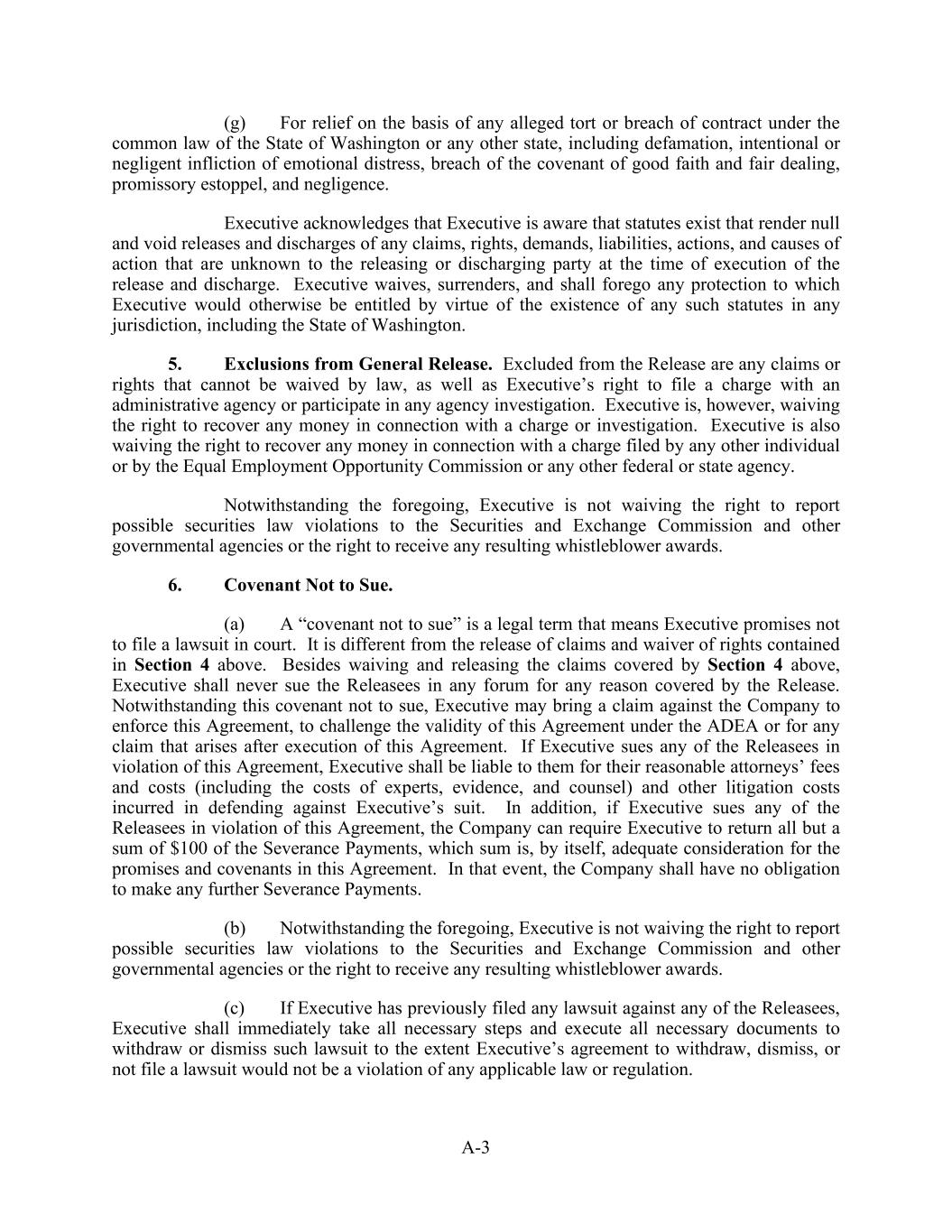 A-3 (g) For relief on the basis of any alleged tort or breach of contract under the common law of the State of Washington or any other state, including defamation, intentional or negligent infliction of emotional distress, breach of the covenant of good faith and fair dealing, promissory estoppel, and negligence. Executive acknowledges that Executive is aware that statutes exist that render null and void releases and discharges of any claims, rights, demands, liabilities, actions, and causes of action that are unknown to the releasing or discharging party at the time of execution of the release and discharge. Executive waives, surrenders, and shall forego any protection to which Executive would otherwise be entitled by virtue of the existence of any such statutes in any jurisdiction, including the State of Washington. 5. Exclusions from General Release. Excluded from the Release are any claims or rights that cannot be waived by law, as well as Executive’s right to file a charge with an administrative agency or participate in any agency investigation. Executive is, however, waiving the right to recover any money in connection with a charge or investigation. Executive is also waiving the right to recover any money in connection with a charge filed by any other individual or by the Equal Employment Opportunity Commission or any other federal or state agency. Notwithstanding the foregoing, Executive is not waiving the right to report possible securities law violations to the Securities and Exchange Commission and other governmental agencies or the right to receive any resulting whistleblower awards. 6. Covenant Not to Sue. (a) A “covenant not to sue” is a legal term that means Executive promises not to file a lawsuit in court. It is different from the release of claims and waiver of rights contained in Section 4 above. Besides waiving and releasing the claims covered by Section 4 above, Executive shall never sue the Releasees in any forum for any reason covered by the Release. Notwithstanding this covenant not to sue, Executive may bring a claim against the Company to enforce this Agreement, to challenge the validity of this Agreement under the ADEA or for any claim that arises after execution of this Agreement. If Executive sues any of the Releasees in violation of this Agreement, Executive shall be liable to them for their reasonable attorneys’ fees and costs (including the costs of experts, evidence, and counsel) and other litigation costs incurred in defending against Executive’s suit. In addition, if Executive sues any of the Releasees in violation of this Agreement, the Company can require Executive to return all but a sum of $100 of the Severance Payments, which sum is, by itself, adequate consideration for the promises and covenants in this Agreement. In that event, the Company shall have no obligation to make any further Severance Payments. (b) Notwithstanding the foregoing, Executive is not waiving the right to report possible securities law violations to the Securities and Exchange Commission and other governmental agencies or the right to receive any resulting whistleblower awards. (c) If Executive has previously filed any lawsuit against any of the Releasees, Executive shall immediately take all necessary steps and execute all necessary documents to withdraw or dismiss such lawsuit to the extent Executive’s agreement to withdraw, dismiss, or not file a lawsuit would not be a violation of any applicable law or regulation.