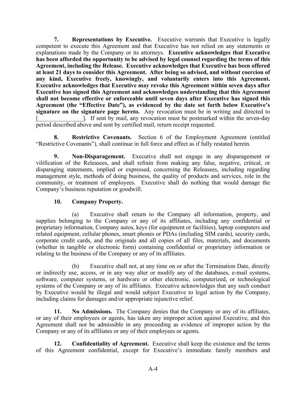 A-4 7. Representations by Executive. Executive warrants that Executive is legally competent to execute this Agreement and that Executive has not relied on any statements or explanations made by the Company or its attorneys. Executive acknowledges that Executive has been afforded the opportunity to be advised by legal counsel regarding the terms of this Agreement, including the Release. Executive acknowledges that Executive has been offered at least 21 days to consider this Agreement. After being so advised, and without coercion of any kind, Executive freely, knowingly, and voluntarily enters into this Agreement. Executive acknowledges that Executive may revoke this Agreement within seven days after Executive has signed this Agreement and acknowledges understanding that this Agreement shall not become effective or enforceable until seven days after Executive has signed this Agreement (the “Effective Date”), as evidenced by the date set forth below Executive’s signature on the signature page hereto. Any revocation must be in writing and directed to [_______________]. If sent by mail, any revocation must be postmarked within the seven-day period described above and sent by certified mail, return receipt requested. 8. Restrictive Covenants. Section 6 of the Employment Agreement (entitled “Restrictive Covenants”), shall continue in full force and effect as if fully restated herein. 9. Non-Disparagement. Executive shall not engage in any disparagement or vilification of the Releasees, and shall refrain from making any false, negative, critical, or disparaging statements, implied or expressed, concerning the Releasees, including regarding management style, methods of doing business, the quality of products and services, role in the community, or treatment of employees. Executive shall do nothing that would damage the Company’s business reputation or goodwill. 10. Company Property. (a) Executive shall return to the Company all information, property, and supplies belonging to the Company or any of its affiliates, including any confidential or proprietary information, Company autos, keys (for equipment or facilities), laptop computers and related equipment, cellular phones, smart phones or PDAs (including SIM cards), security cards, corporate credit cards, and the originals and all copies of all files, materials, and documents (whether in tangible or electronic form) containing confidential or proprietary information or relating to the business of the Company or any of its affiliates. (b) Executive shall not, at any time on or after the Termination Date, directly or indirectly use, access, or in any way alter or modify any of the databases, e-mail systems, software, computer systems, or hardware or other electronic, computerized, or technological systems of the Company or any of its affiliates. Executive acknowledges that any such conduct by Executive would be illegal and would subject Executive to legal action by the Company, including claims for damages and/or appropriate injunctive relief. 11. No Admissions. The Company denies that the Company or any of its affiliates, or any of their employees or agents, has taken any improper action against Executive, and this Agreement shall not be admissible in any proceeding as evidence of improper action by the Company or any of its affiliates or any of their employees or agents. 12. Confidentiality of Agreement. Executive shall keep the existence and the terms of this Agreement confidential, except for Executive’s immediate family members and