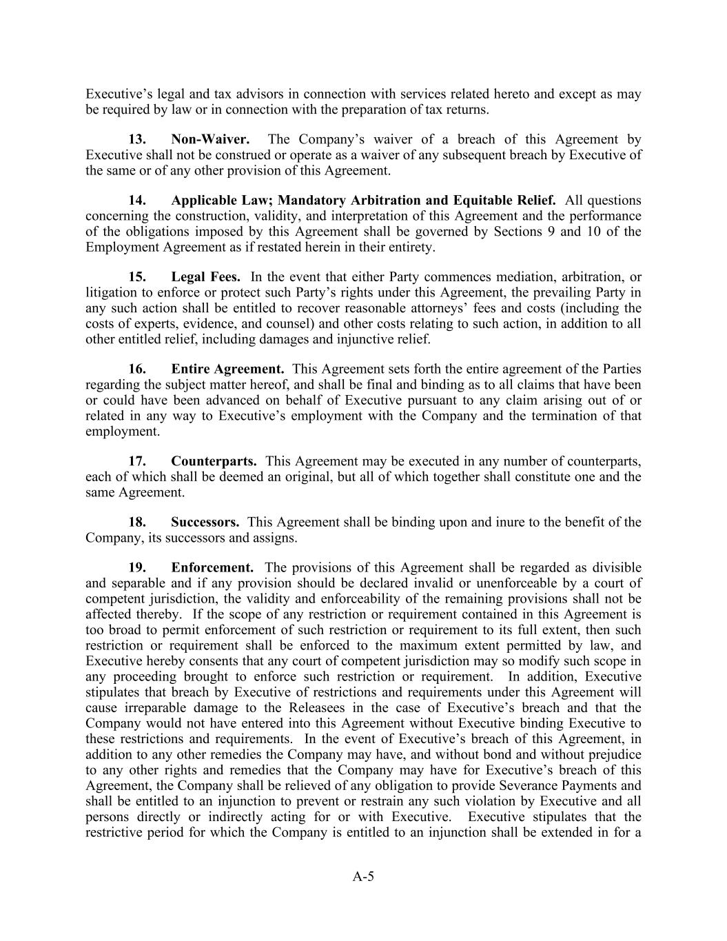 A-5 Executive’s legal and tax advisors in connection with services related hereto and except as may be required by law or in connection with the preparation of tax returns. 13. Non-Waiver. The Company’s waiver of a breach of this Agreement by Executive shall not be construed or operate as a waiver of any subsequent breach by Executive of the same or of any other provision of this Agreement. 14. Applicable Law; Mandatory Arbitration and Equitable Relief. All questions concerning the construction, validity, and interpretation of this Agreement and the performance of the obligations imposed by this Agreement shall be governed by Sections 9 and 10 of the Employment Agreement as if restated herein in their entirety. 15. Legal Fees. In the event that either Party commences mediation, arbitration, or litigation to enforce or protect such Party’s rights under this Agreement, the prevailing Party in any such action shall be entitled to recover reasonable attorneys’ fees and costs (including the costs of experts, evidence, and counsel) and other costs relating to such action, in addition to all other entitled relief, including damages and injunctive relief. 16. Entire Agreement. This Agreement sets forth the entire agreement of the Parties regarding the subject matter hereof, and shall be final and binding as to all claims that have been or could have been advanced on behalf of Executive pursuant to any claim arising out of or related in any way to Executive’s employment with the Company and the termination of that employment. 17. Counterparts. This Agreement may be executed in any number of counterparts, each of which shall be deemed an original, but all of which together shall constitute one and the same Agreement. 18. Successors. This Agreement shall be binding upon and inure to the benefit of the Company, its successors and assigns. 19. Enforcement. The provisions of this Agreement shall be regarded as divisible and separable and if any provision should be declared invalid or unenforceable by a court of competent jurisdiction, the validity and enforceability of the remaining provisions shall not be affected thereby. If the scope of any restriction or requirement contained in this Agreement is too broad to permit enforcement of such restriction or requirement to its full extent, then such restriction or requirement shall be enforced to the maximum extent permitted by law, and Executive hereby consents that any court of competent jurisdiction may so modify such scope in any proceeding brought to enforce such restriction or requirement. In addition, Executive stipulates that breach by Executive of restrictions and requirements under this Agreement will cause irreparable damage to the Releasees in the case of Executive’s breach and that the Company would not have entered into this Agreement without Executive binding Executive to these restrictions and requirements. In the event of Executive’s breach of this Agreement, in addition to any other remedies the Company may have, and without bond and without prejudice to any other rights and remedies that the Company may have for Executive’s breach of this Agreement, the Company shall be relieved of any obligation to provide Severance Payments and shall be entitled to an injunction to prevent or restrain any such violation by Executive and all persons directly or indirectly acting for or with Executive. Executive stipulates that the restrictive period for which the Company is entitled to an injunction shall be extended in for a