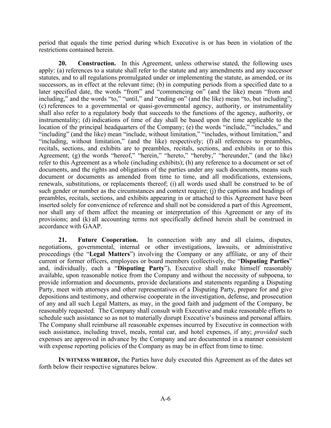 A-6 period that equals the time period during which Executive is or has been in violation of the restrictions contained herein. 20. Construction. In this Agreement, unless otherwise stated, the following uses apply: (a) references to a statute shall refer to the statute and any amendments and any successor statutes, and to all regulations promulgated under or implementing the statute, as amended, or its successors, as in effect at the relevant time; (b) in computing periods from a specified date to a later specified date, the words “from” and “commencing on” (and the like) mean “from and including,” and the words “to,” “until,” and “ending on” (and the like) mean “to, but including”; (c) references to a governmental or quasi-governmental agency, authority, or instrumentality shall also refer to a regulatory body that succeeds to the functions of the agency, authority, or instrumentality; (d) indications of time of day shall be based upon the time applicable to the location of the principal headquarters of the Company; (e) the words “include,” “includes,” and “including” (and the like) mean “include, without limitation,” “includes, without limitation,” and “including, without limitation,” (and the like) respectively; (f) all references to preambles, recitals, sections, and exhibits are to preambles, recitals, sections, and exhibits in or to this Agreement; (g) the words “hereof,” “herein,” “hereto,” “hereby,” “hereunder,” (and the like) refer to this Agreement as a whole (including exhibits); (h) any reference to a document or set of documents, and the rights and obligations of the parties under any such documents, means such document or documents as amended from time to time, and all modifications, extensions, renewals, substitutions, or replacements thereof; (i) all words used shall be construed to be of such gender or number as the circumstances and context require; (j) the captions and headings of preambles, recitals, sections, and exhibits appearing in or attached to this Agreement have been inserted solely for convenience of reference and shall not be considered a part of this Agreement, nor shall any of them affect the meaning or interpretation of this Agreement or any of its provisions; and (k) all accounting terms not specifically defined herein shall be construed in accordance with GAAP. 21. Future Cooperation. In connection with any and all claims, disputes, negotiations, governmental, internal or other investigations, lawsuits, or administrative proceedings (the “Legal Matters”) involving the Company or any affiliate, or any of their current or former officers, employees or board members (collectively, the “Disputing Parties” and, individually, each a “Disputing Party”), Executive shall make himself reasonably available, upon reasonable notice from the Company and without the necessity of subpoena, to provide information and documents, provide declarations and statements regarding a Disputing Party, meet with attorneys and other representatives of a Disputing Party, prepare for and give depositions and testimony, and otherwise cooperate in the investigation, defense, and prosecution of any and all such Legal Matters, as may, in the good faith and judgment of the Company, be reasonably requested. The Company shall consult with Executive and make reasonable efforts to schedule such assistance so as not to materially disrupt Executive’s business and personal affairs. The Company shall reimburse all reasonable expenses incurred by Executive in connection with such assistance, including travel, meals, rental car, and hotel expenses, if any; provided such expenses are approved in advance by the Company and are documented in a manner consistent with expense reporting policies of the Company as may be in effect from time to time. IN WITNESS WHEREOF, the Parties have duly executed this Agreement as of the dates set forth below their respective signatures below.