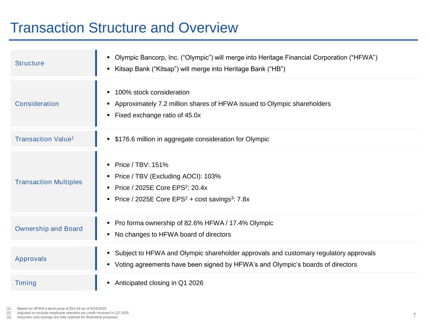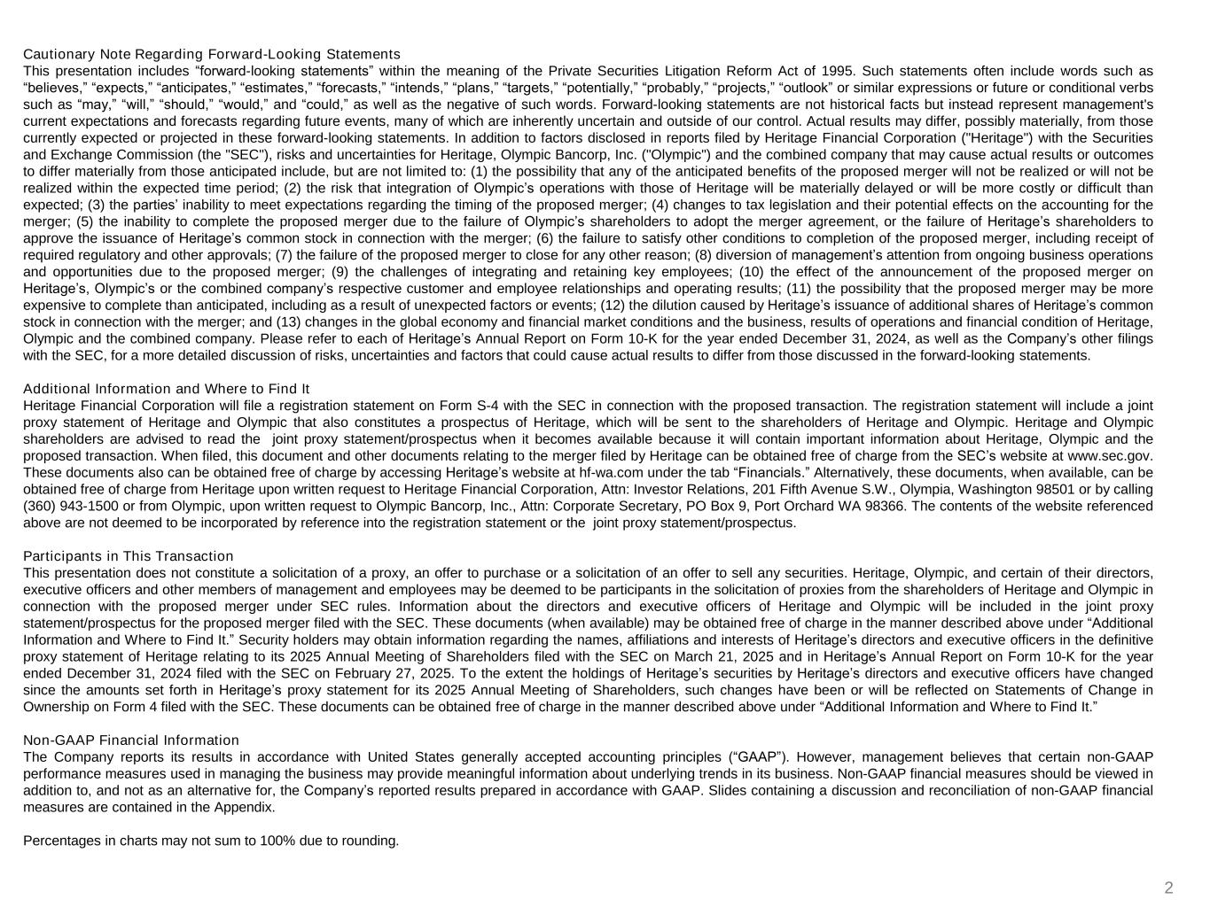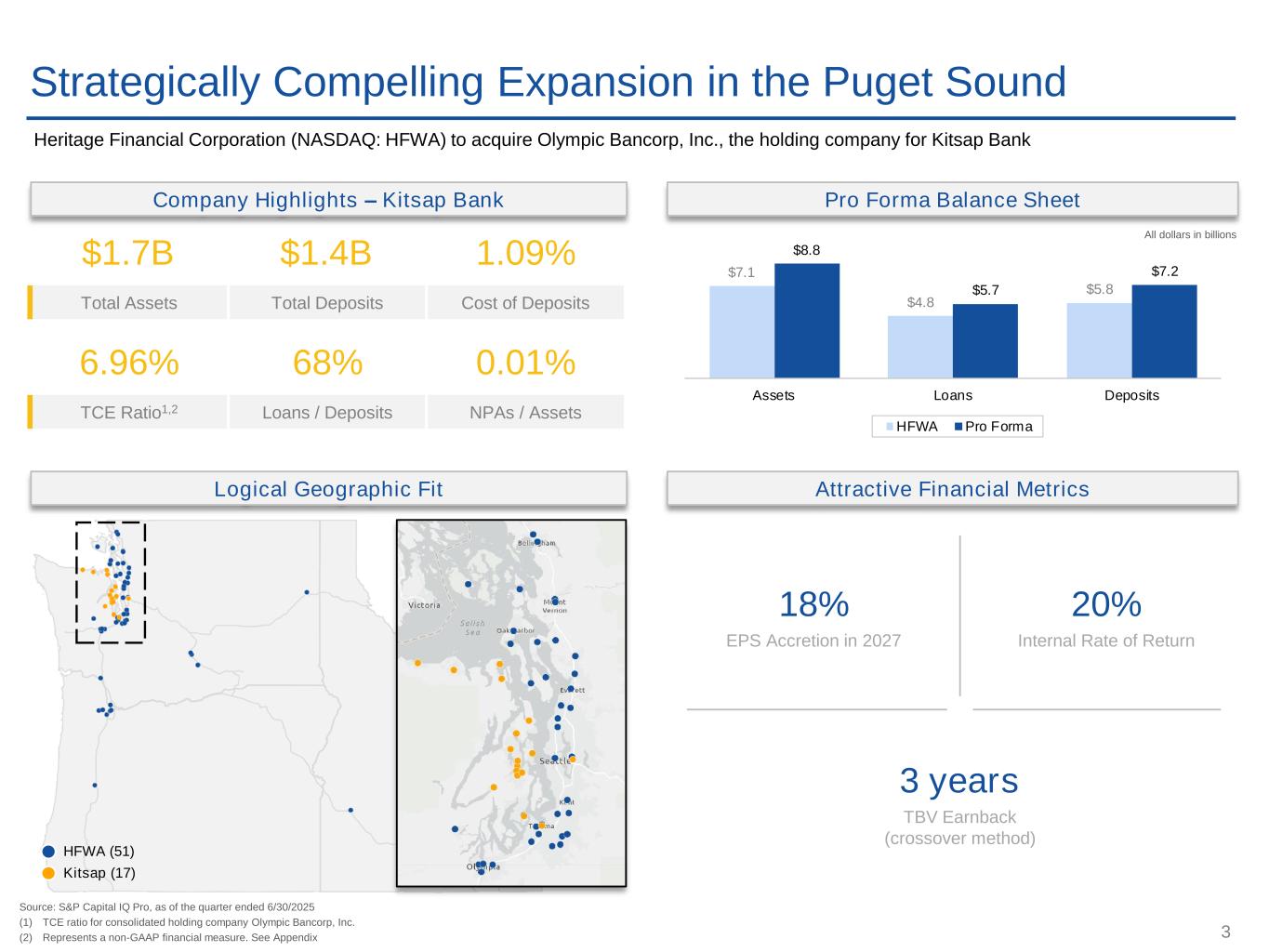 2 Cautionary Note Regarding Forward-Looking Statements This presentation includes “forward-looking statements” within the meaning of the Private Securities Litigation Reform Act of 1995. Such statements often include words such as “believes,” “expects,” “anticipates,” “estimates,” “forecasts,” “intends,” “plans,” “targets,” “potentially,” “probably,” “projects,” “outlook” or similar expressions or future or conditional verbs such as “may,” “will,” “should,” “would,” and “could,” as well as the negative of such words. Forward-looking statements are not historical facts but instead represent management's current expectations and forecasts regarding future events, many of which are inherently uncertain and outside of our control. Actual results may differ, possibly materially, from those currently expected or projected in these forward-looking statements. In addition to factors disclosed in reports filed by Heritage Financial Corporation ("Heritage") with the Securities and Exchange Commission (the "SEC"), risks and uncertainties for Heritage, Olympic Bancorp, Inc. ("Olympic") and the combined company that may cause actual results or outcomes to differ materially from those anticipated include, but are not limited to: (1) the possibility that any of the anticipated benefits of the proposed merger will not be realized or will not be realized within the expected time period; (2) the risk that integration of Olympic’s operations with those of Heritage will be materially delayed or will be more costly or difficult than expected; (3) the parties’ inability to meet expectations regarding the timing of the proposed merger; (4) changes to tax legislation and their potential effects on the accounting for the merger; (5) the inability to complete the proposed merger due to the failure of Olympic’s shareholders to adopt the merger agreement, or the failure of Heritage’s shareholders to approve the issuance of Heritage’s common stock in connection with the merger; (6) the failure to satisfy other conditions to completion of the proposed merger, including receipt of required regulatory and other approvals; (7) the failure of the proposed merger to close for any other reason; (8) diversion of management’s attention from ongoing business operations and opportunities due to the proposed merger; (9) the challenges of integrating and retaining key employees; (10) the effect of the announcement of the proposed merger on Heritage’s, Olympic’s or the combined company’s respective customer and employee relationships and operating results; (11) the possibility that the proposed merger may be more expensive to complete than anticipated, including as a result of unexpected factors or events; (12) the dilution caused by Heritage’s issuance of additional shares of Heritage’s common stock in connection with the merger; and (13) changes in the global economy and financial market conditions and the business, results of operations and financial condition of Heritage, Olympic and the combined company. Please refer to each of Heritage’s Annual Report on Form 10-K for the year ended December 31, 2024, as well as the Company’s other filings with the SEC, for a more detailed discussion of risks, uncertainties and factors that could cause actual results to differ from those discussed in the forward-looking statements. Additional Information and Where to Find It Heritage Financial Corporation will file a registration statement on Form S-4 with the SEC in connection with the proposed transaction. The registration statement will include a joint proxy statement of Heritage and Olympic that also constitutes a prospectus of Heritage, which will be sent to the shareholders of Heritage and Olympic. Heritage and Olympic shareholders are advised to read the joint proxy statement/prospectus when it becomes available because it will contain important information about Heritage, Olympic and the proposed transaction. When filed, this document and other documents relating to the merger filed by Heritage can be obtained free of charge from the SEC’s website at www.sec.gov. These documents also can be obtained free of charge by accessing Heritage’s website at hf-wa.com under the tab “Financials.” Alternatively, these documents, when available, can be obtained free of charge from Heritage upon written request to Heritage Financial Corporation, Attn: Investor Relations, 201 Fifth Avenue S.W., Olympia, Washington 98501 or by calling (360) 943-1500 or from Olympic, upon written request to Olympic Bancorp, Inc., Attn: Corporate Secretary, PO Box 9, Port Orchard WA 98366. The contents of the website referenced above are not deemed to be incorporated by reference into the registration statement or the joint proxy statement/prospectus. Participants in This Transaction This presentation does not constitute a solicitation of a proxy, an offer to purchase or a solicitation of an offer to sell any securities. Heritage, Olympic, and certain of their directors, executive officers and other members of management and employees may be deemed to be participants in the solicitation of proxies from the shareholders of Heritage and Olympic in connection with the proposed merger under SEC rules. Information about the directors and executive officers of Heritage and Olympic will be included in the joint proxy statement/prospectus for the proposed merger filed with the SEC. These documents (when available) may be obtained free of charge in the manner described above under “Additional Information and Where to Find It.” Security holders may obtain information regarding the names, affiliations and interests of Heritage’s directors and executive officers in the definitive proxy statement of Heritage relating to its 2025 Annual Meeting of Shareholders filed with the SEC on March 21, 2025 and in Heritage’s Annual Report on Form 10-K for the year ended December 