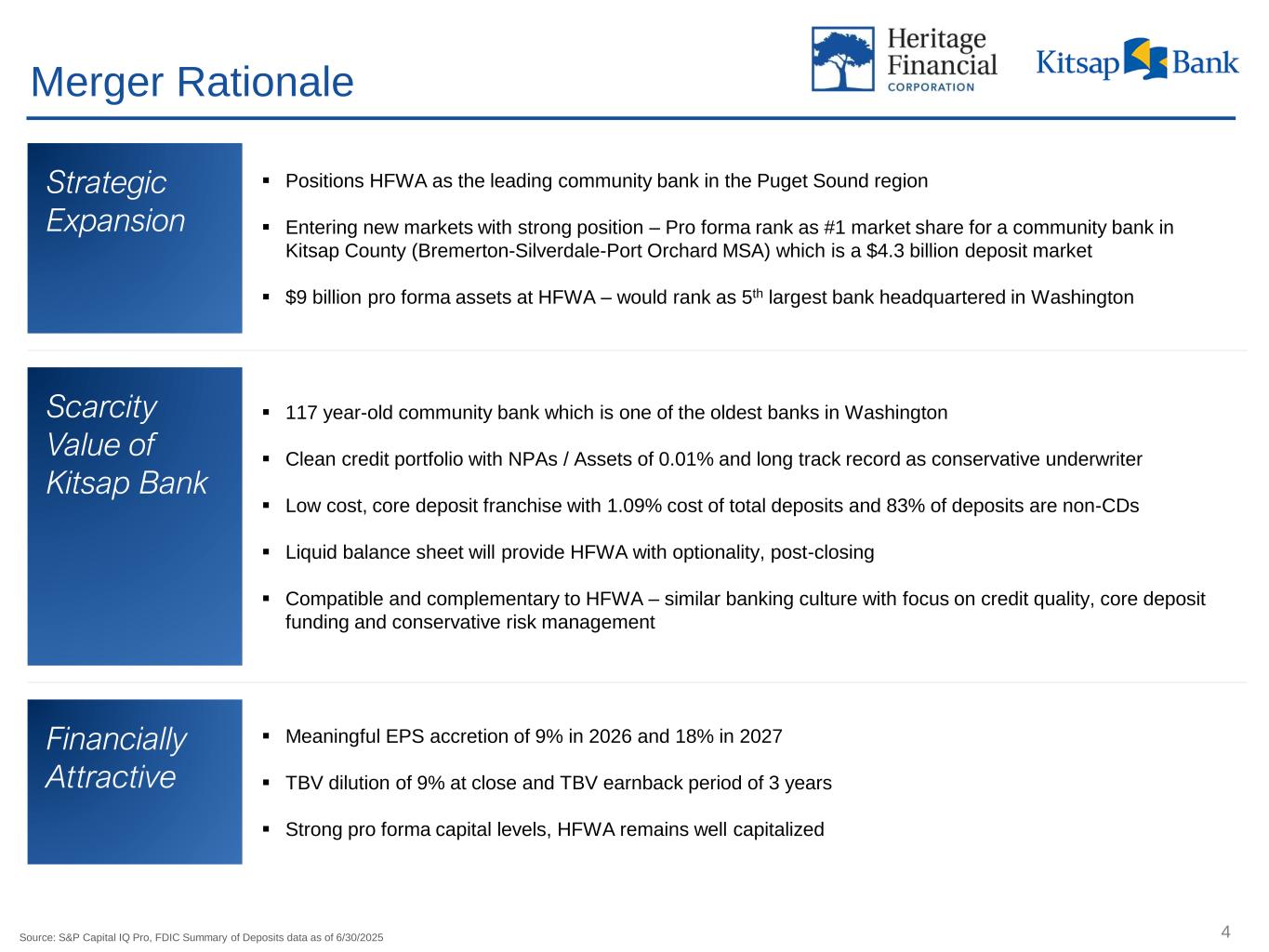 3 18% EPS Accretion in 2027 20% Internal Rate of Return 3 years TBV Earnback (crossover method) $1.7B $1.4B 1.09% Total Assets Total Deposits Cost of Deposits 6.96% 68% 0.01% TCE Ratio1,2 Loans / Deposits NPAs / Assets Strategically Compelling Expansion in the Puget Sound Company Highlights – Kitsap Bank Pro Forma Balance Sheet Logical Geographic Fit Attractive Financial Metrics Heritage Financial Corporation (NASDAQ: HFWA) to acquire Olympic Bancorp, Inc., the holding company for Kitsap Bank $7.1 $4.8 $5.8 $8.8 $5.7 $7.2 Assets Loans Deposits HFWA Pro Forma Source: S&P Capital IQ Pro, as of the quarter ended 6/30/2025 (1) TCE ratio for consolidated holding company Olympic Bancorp, Inc. (2) Represents a non-GAAP financial measure. See Appendix $7.1 $4.8 $5.8 $8.8 $5.7 $7.2 Assets Loans Deposits HFWA Pro Forma All dollars in billions Kitsap (17) HFWA (51)