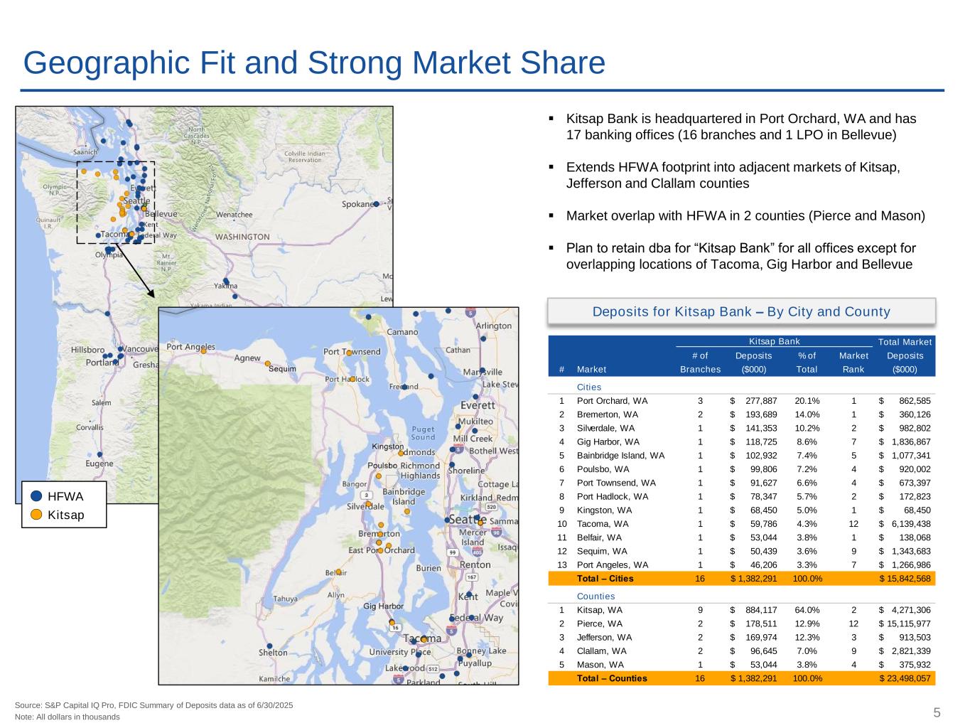 4 Strategic Expansion ▪ Positions HFWA as the leading community bank in the Puget Sound region ▪ Entering new markets with strong position – Pro forma rank as #1 market share for a community bank in Kitsap County (Bremerton-Silverdale-Port Orchard MSA) which is a $4.3 billion deposit market ▪ $9 billion pro forma assets at HFWA – would rank as 5th largest bank headquartered in Washington Scarcity Value of Kitsap Bank ▪ 117 year-old community bank which is one of the oldest banks in Washington ▪ Clean credit portfolio with NPAs / Assets of 0.01% and long track record as conservative underwriter ▪ Low cost, core deposit franchise with 1.09% cost of total deposits and 83% of deposits are non-CDs ▪ Liquid balance sheet will provide HFWA with optionality, post-closing ▪ Compatible and complementary to HFWA – similar banking culture with focus on credit quality, core deposit funding and conservative risk management Financially Attractive ▪ Meaningful EPS accretion of 9% in 2026 and 18% in 2027 ▪ TBV dilution of 9% at close and TBV earnback period of 3 years ▪ Strong pro forma capital levels, HFWA remains well capitalized Merger Rationale Source: S&P Capital IQ Pro, FDIC Summary of Deposits data as of 6/30/2025